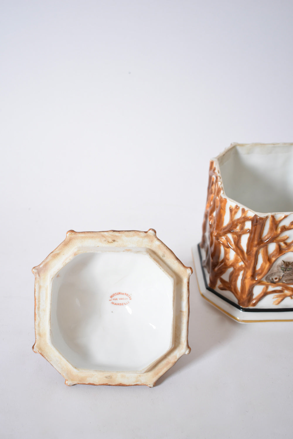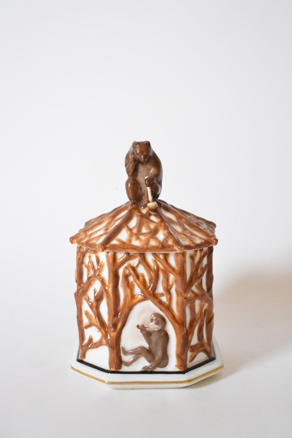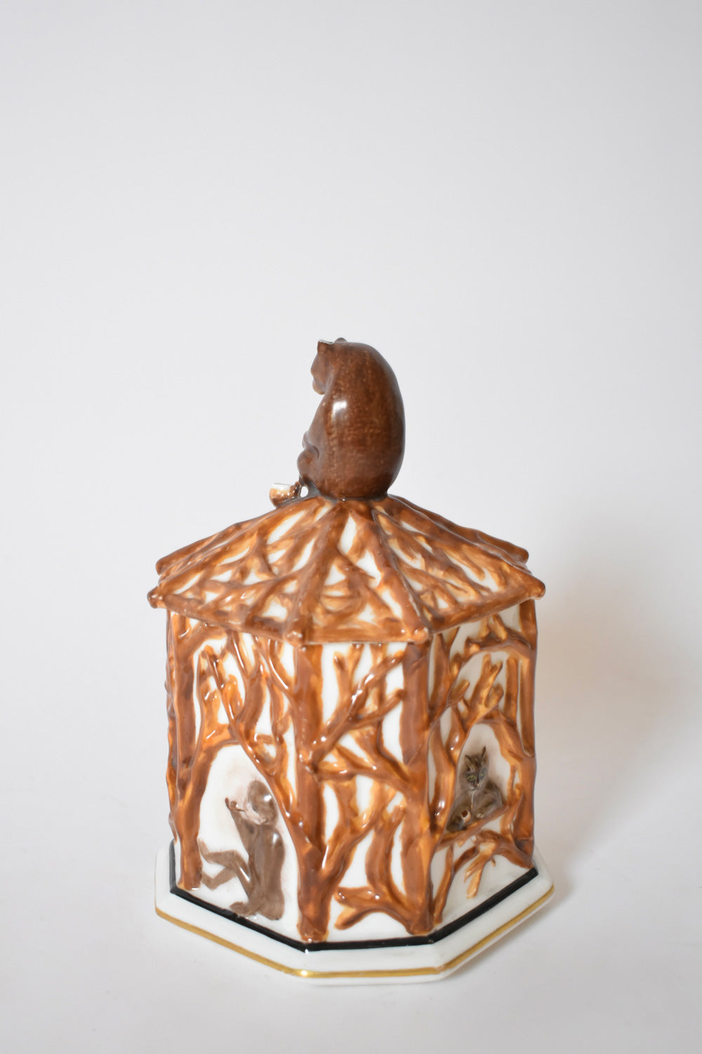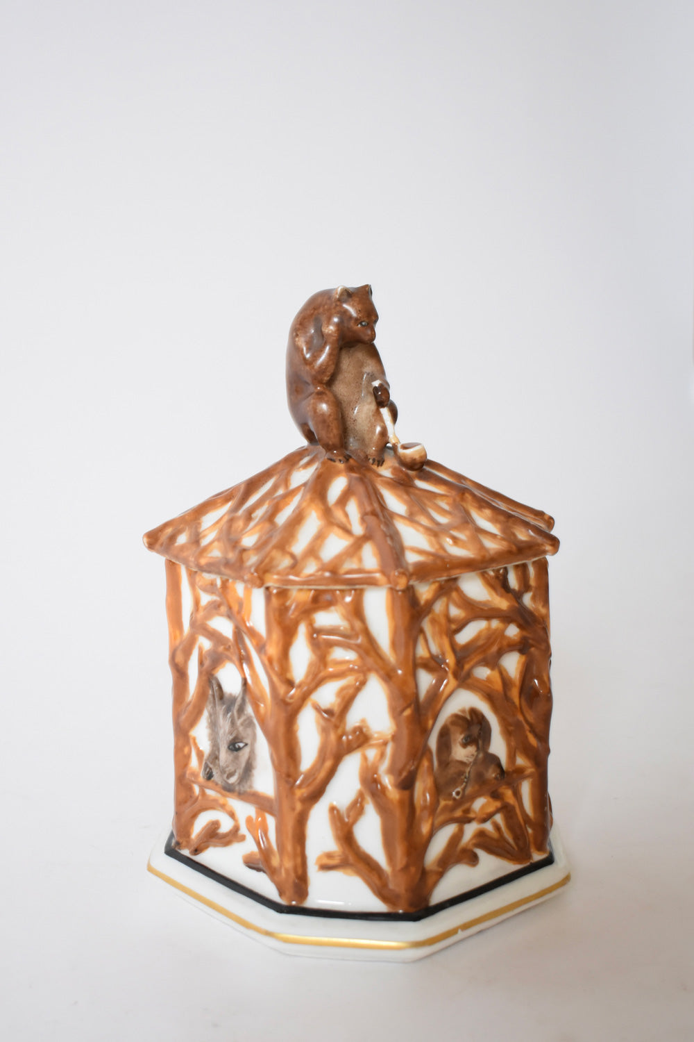 Covered porcelain jar, covered pot, with canted sides, glazed with a relief decoration of brown foliage on a white background, revealing a dog, a cat, a donkey, and a smoking monkey on each side. The lid features the same decoration and is topped with a bear smoking a pipe at the top. Signed on the back of the lid. France, 1910s.