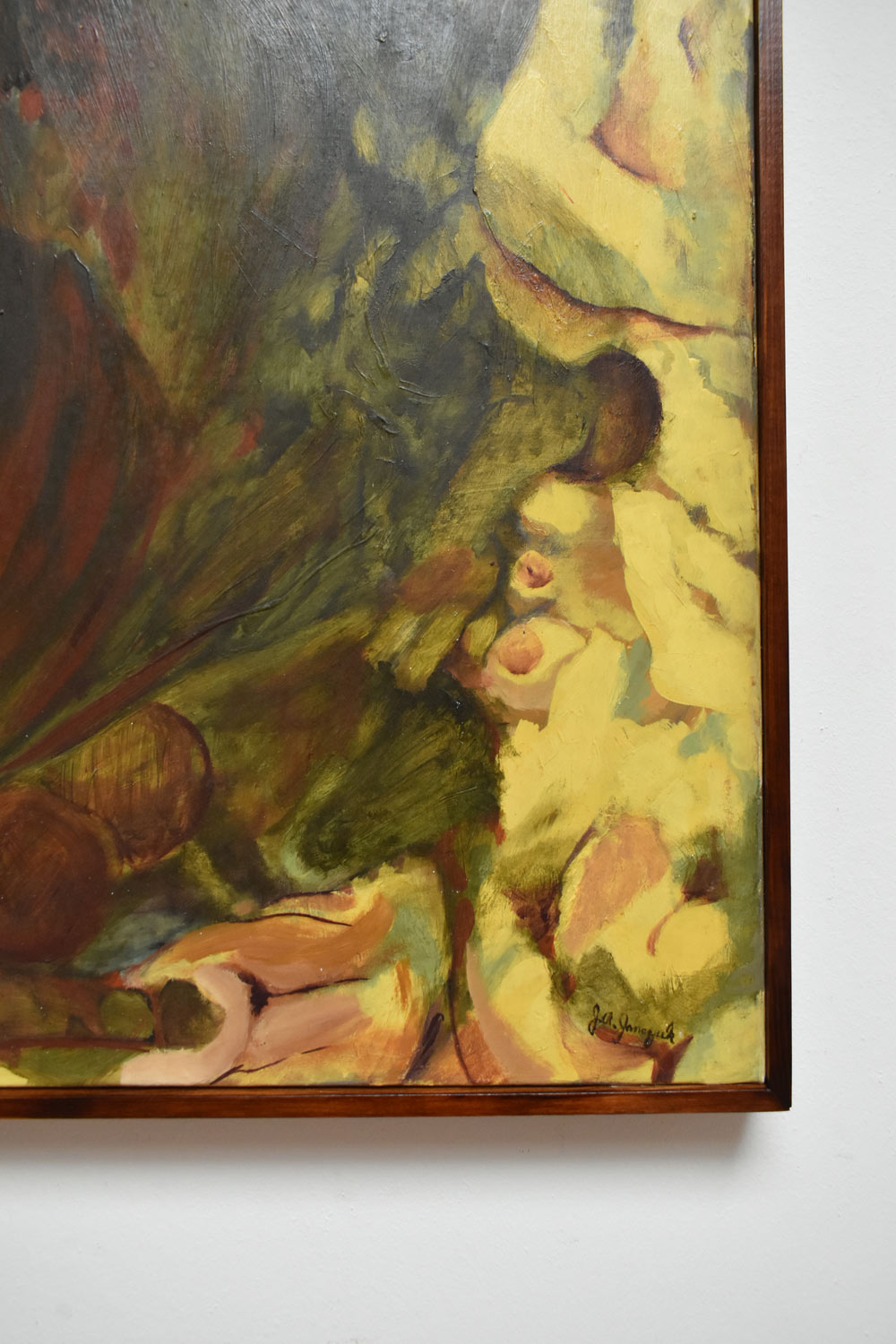 Oil on canvas painting representing an organic cave view, signed on the lower right corner, Ja Janczuk. France, 1970s.