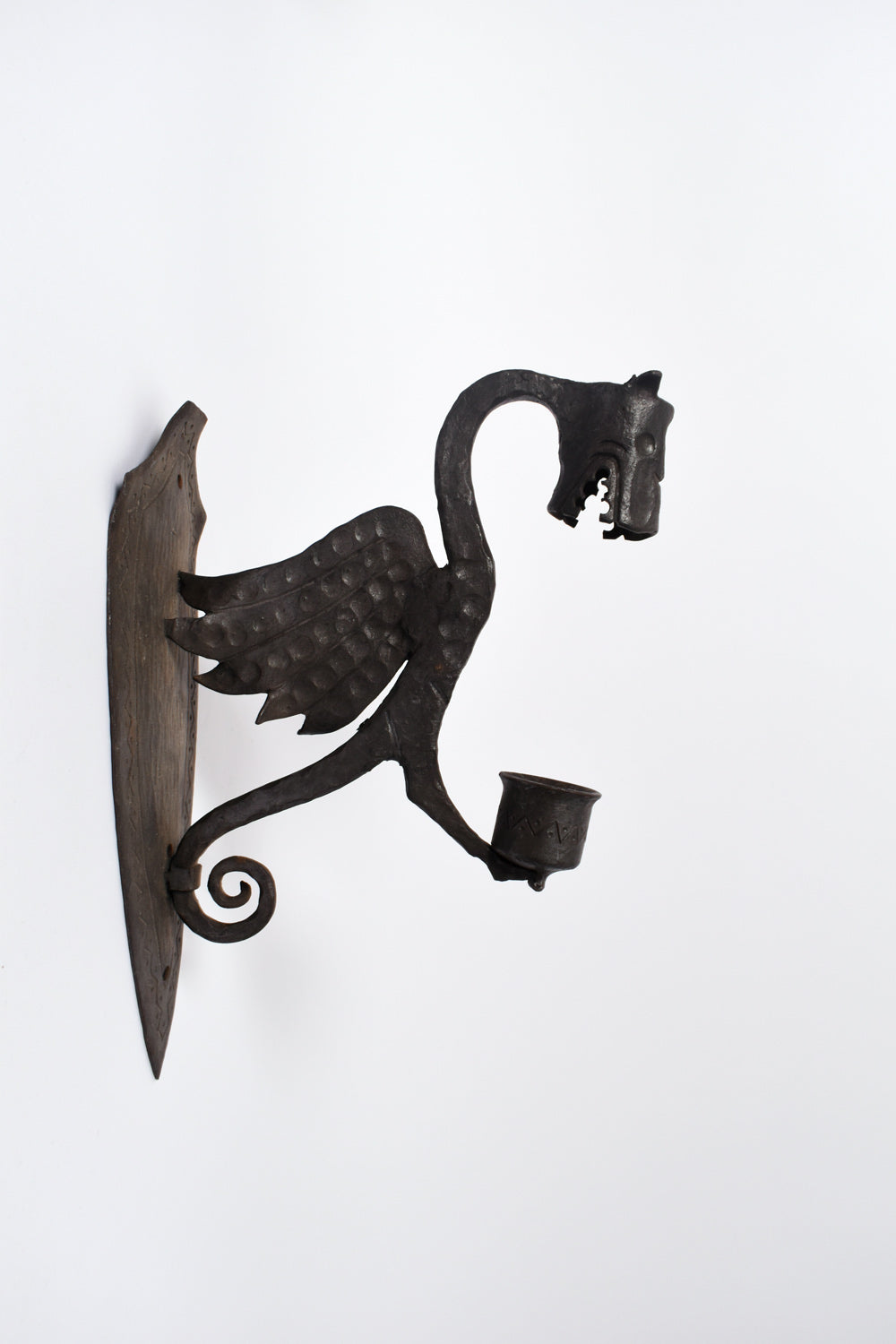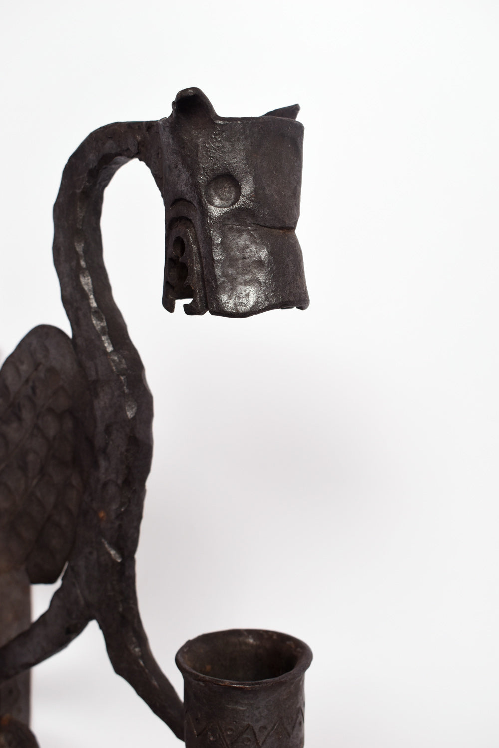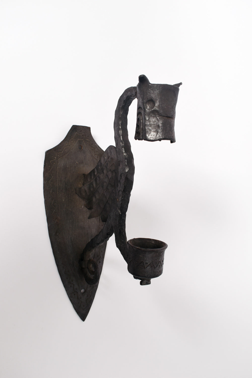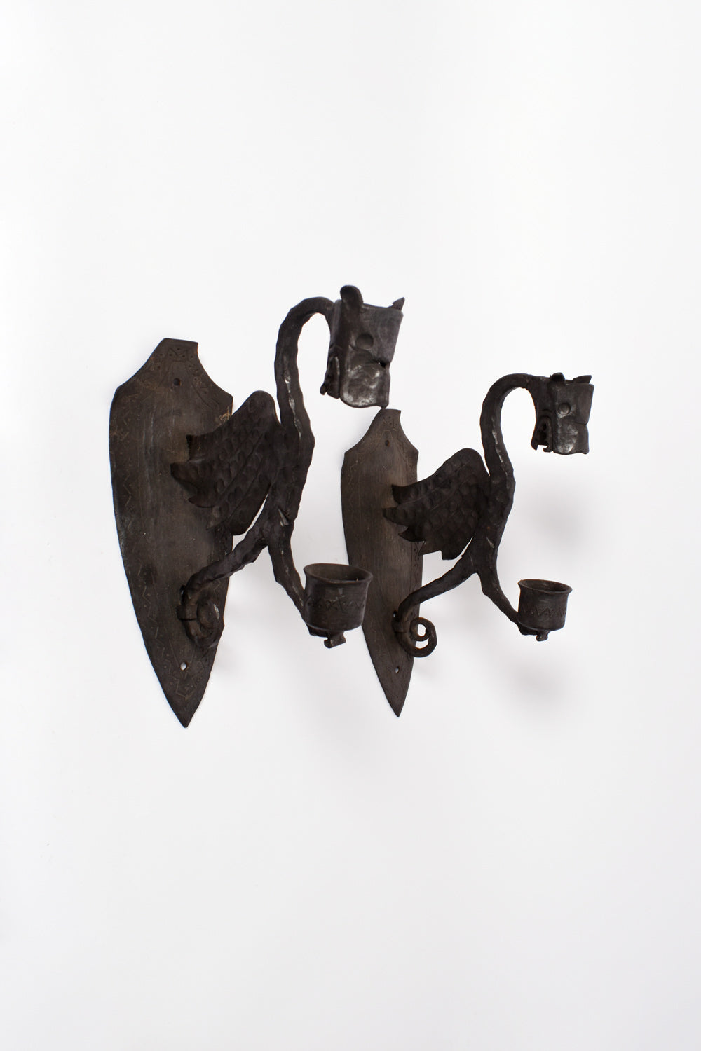 Pair of zoomorphic hammered iron mural candle holders representing dragons. France, 1960s.