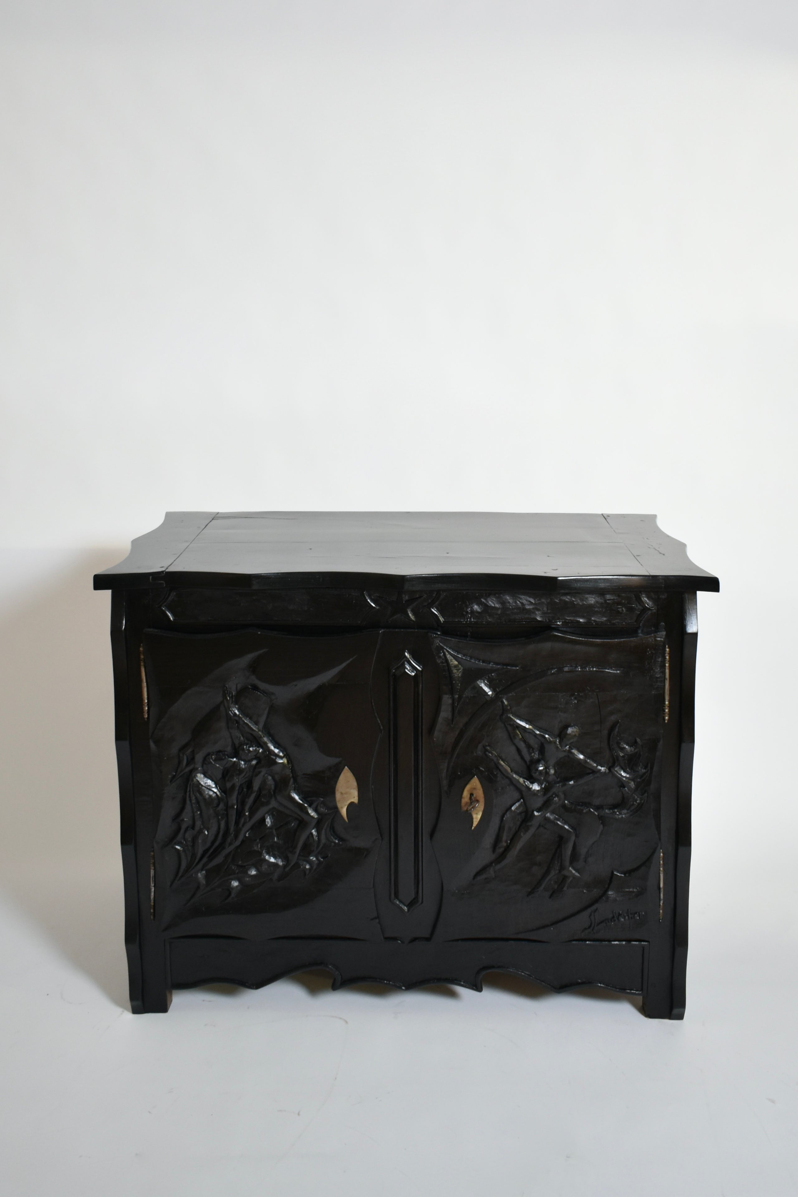 Ebonised wood brutalist sideboard, cabinet, chest of drawers opening with two doors and adorned with a rich carved decoration representing dancers by Johnny Ludécher France, 1950s.