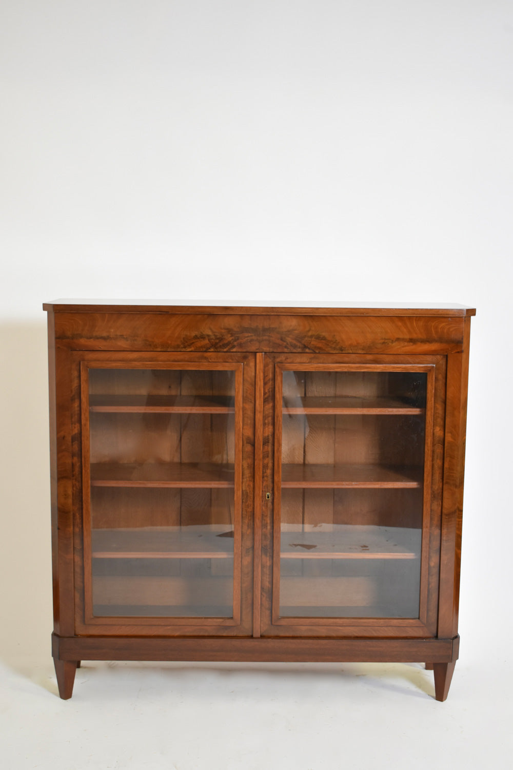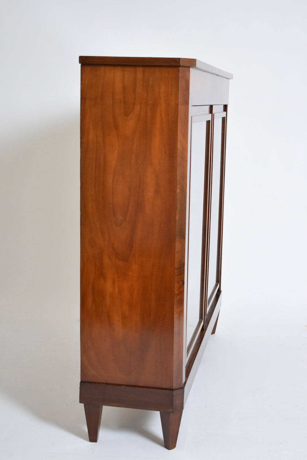 A mahogany veneer display cabinet bookshelves with two glass doors and four small sheathed feet, Louis XVI style. France, 1940s.