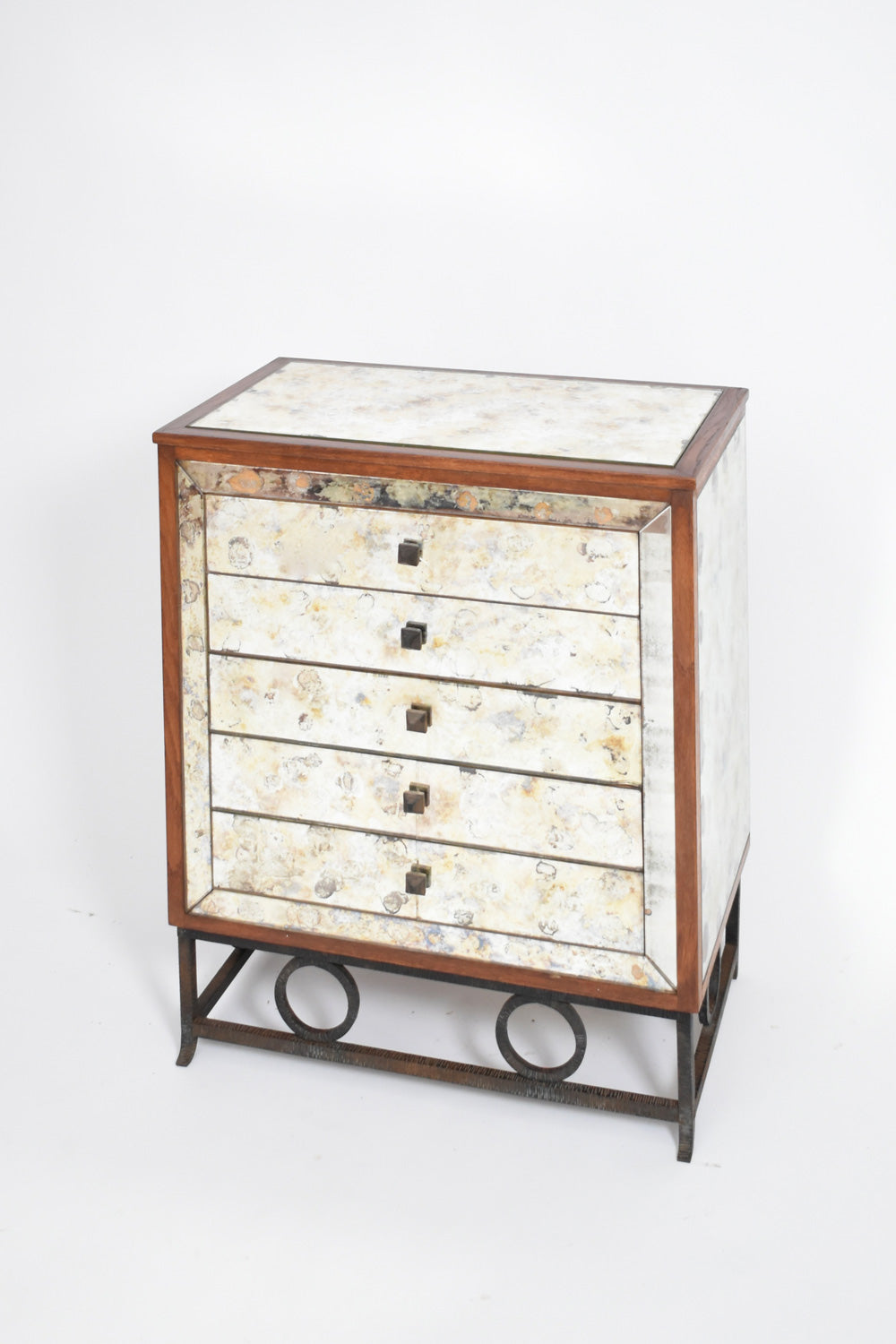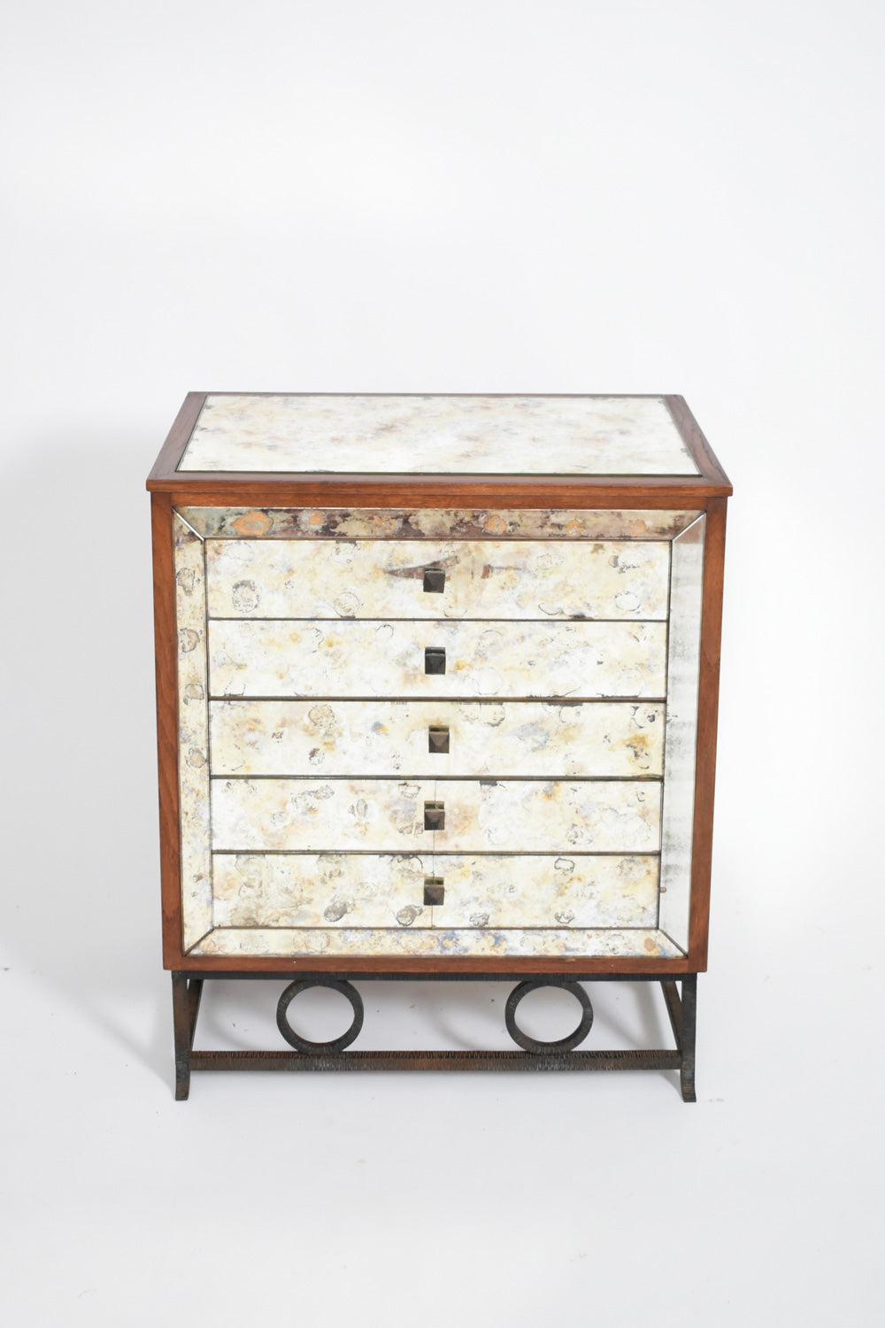Mirrors and wrought iron chest of drawers, cabinet, opening with five drawers in the front. France, 1940s.