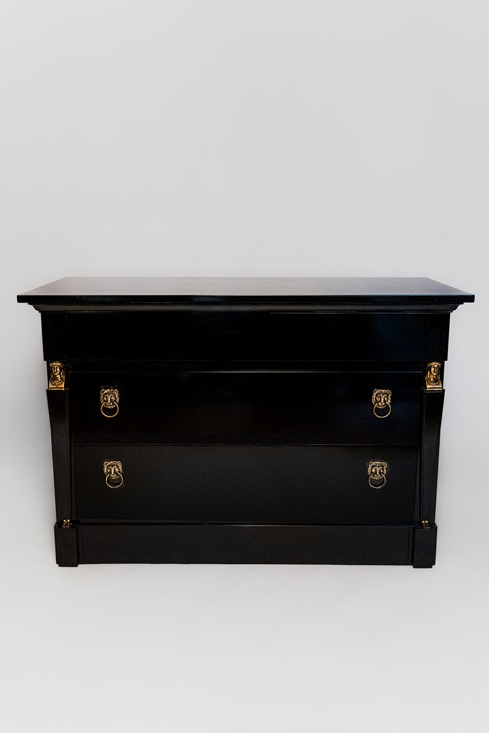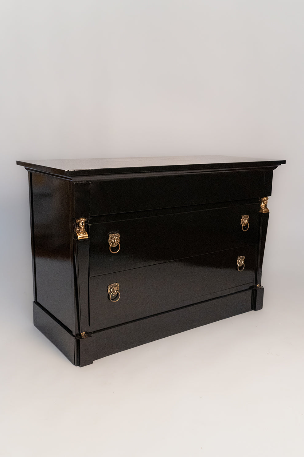 Black lacquered eturn from Egypt style chest of drawers in opening with three drawers decorated with caryatids, draw rings with lion's muzzles. France, 19th c.