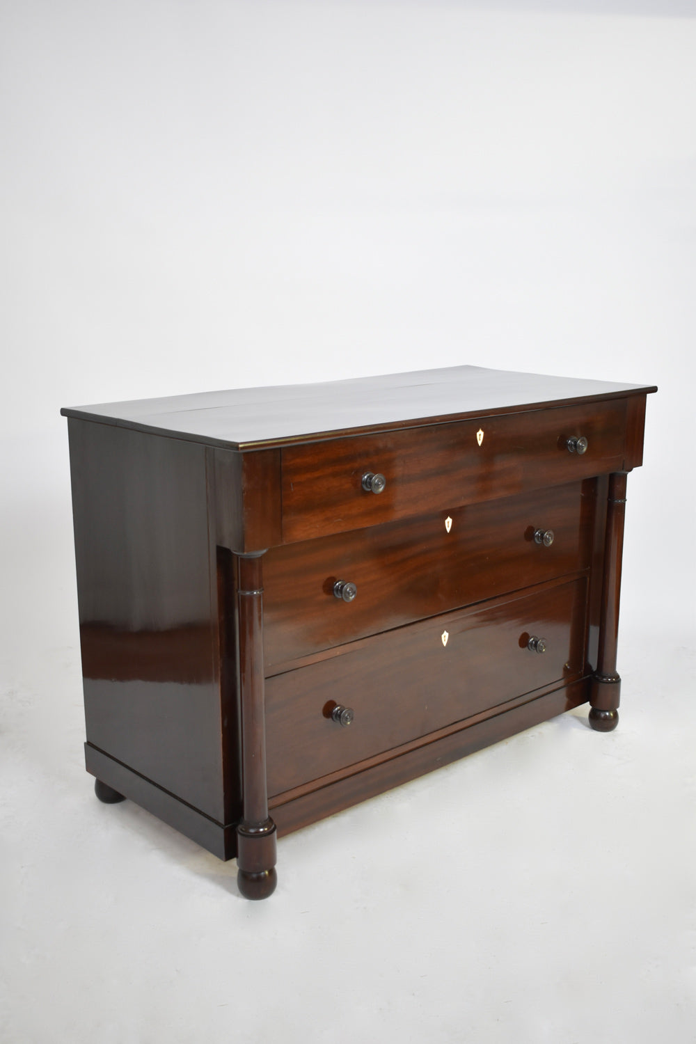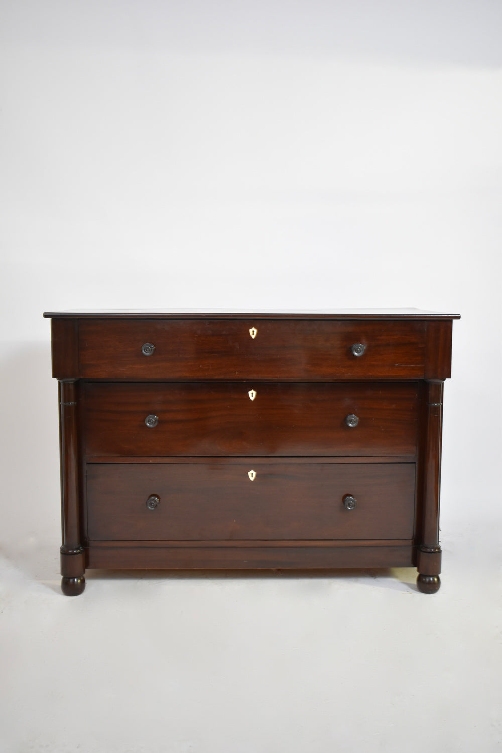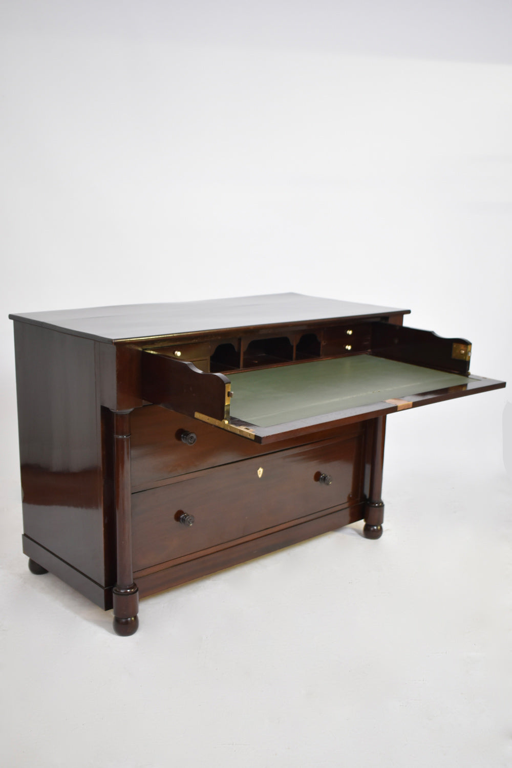 Chest of drawers with desk in the Empire style, mahogany and mahogany veneer, rectangular top, box with three drawers, the first being a desk with drawers, pigeonholes and writing surface lined with green-toned napa, turned handles, bone lock mirrors and handles, smooth column-shaped pilasters, ball-shaped feet. Portugal, late 19th c.