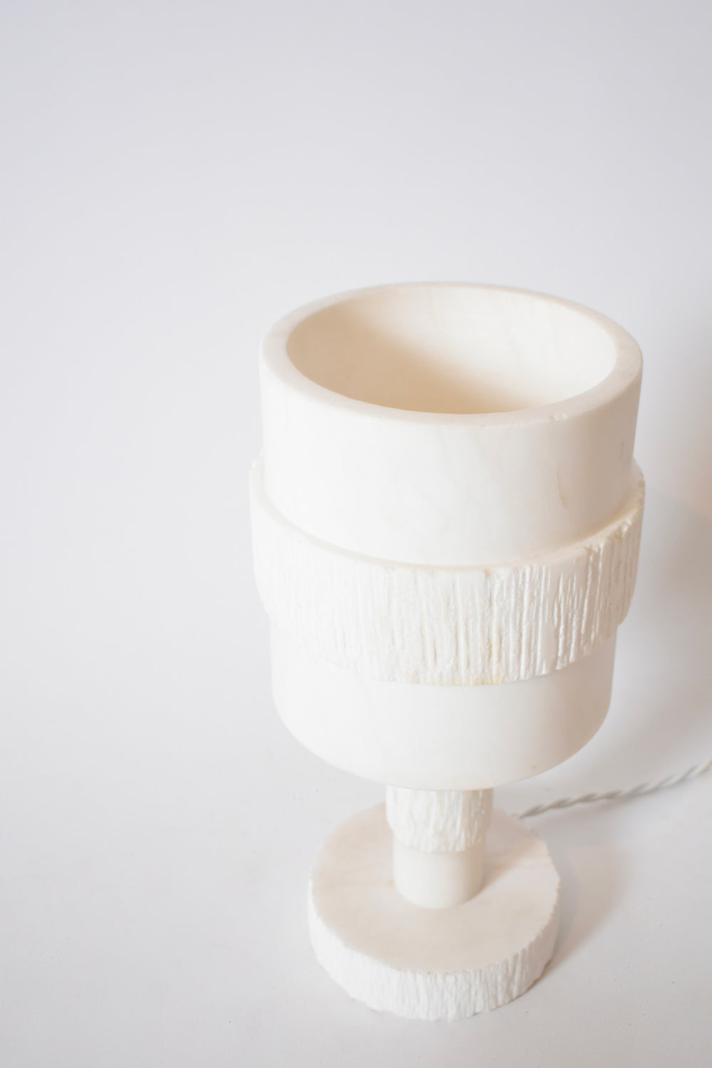 Alabaster and carved alabaster lamp resting on a circular base, lampshade made of alabaster. Italy, 1970s.
