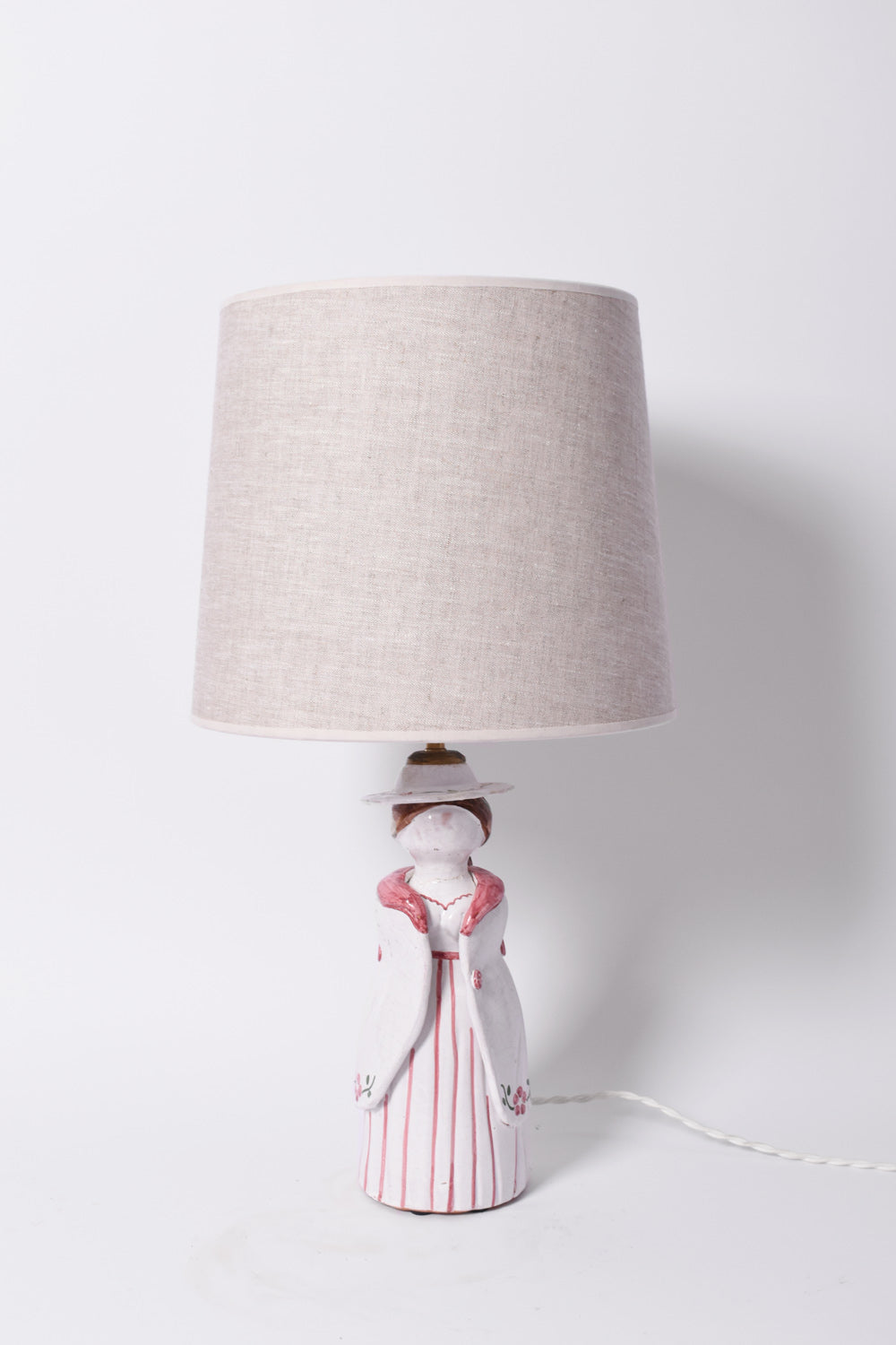 Anthropomorphic ceramic lamp representing a farmer woman in a pink and white dress. Portugal, 1950s