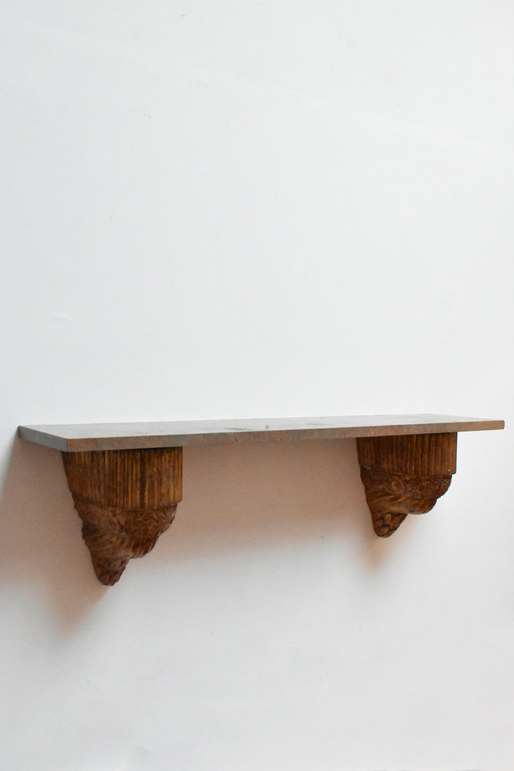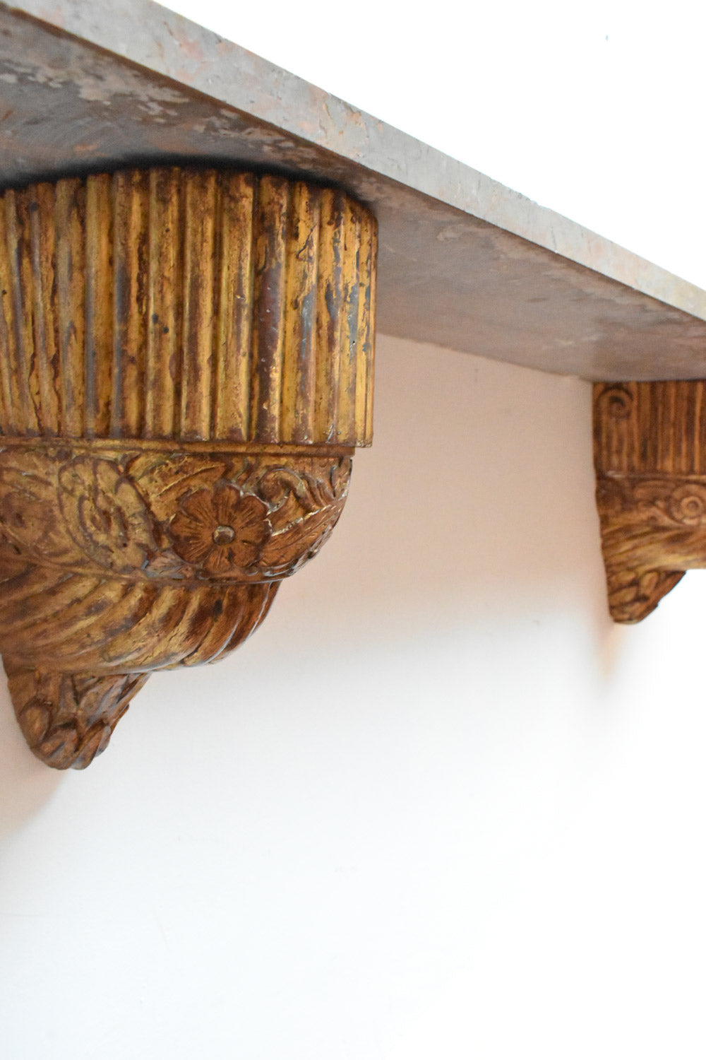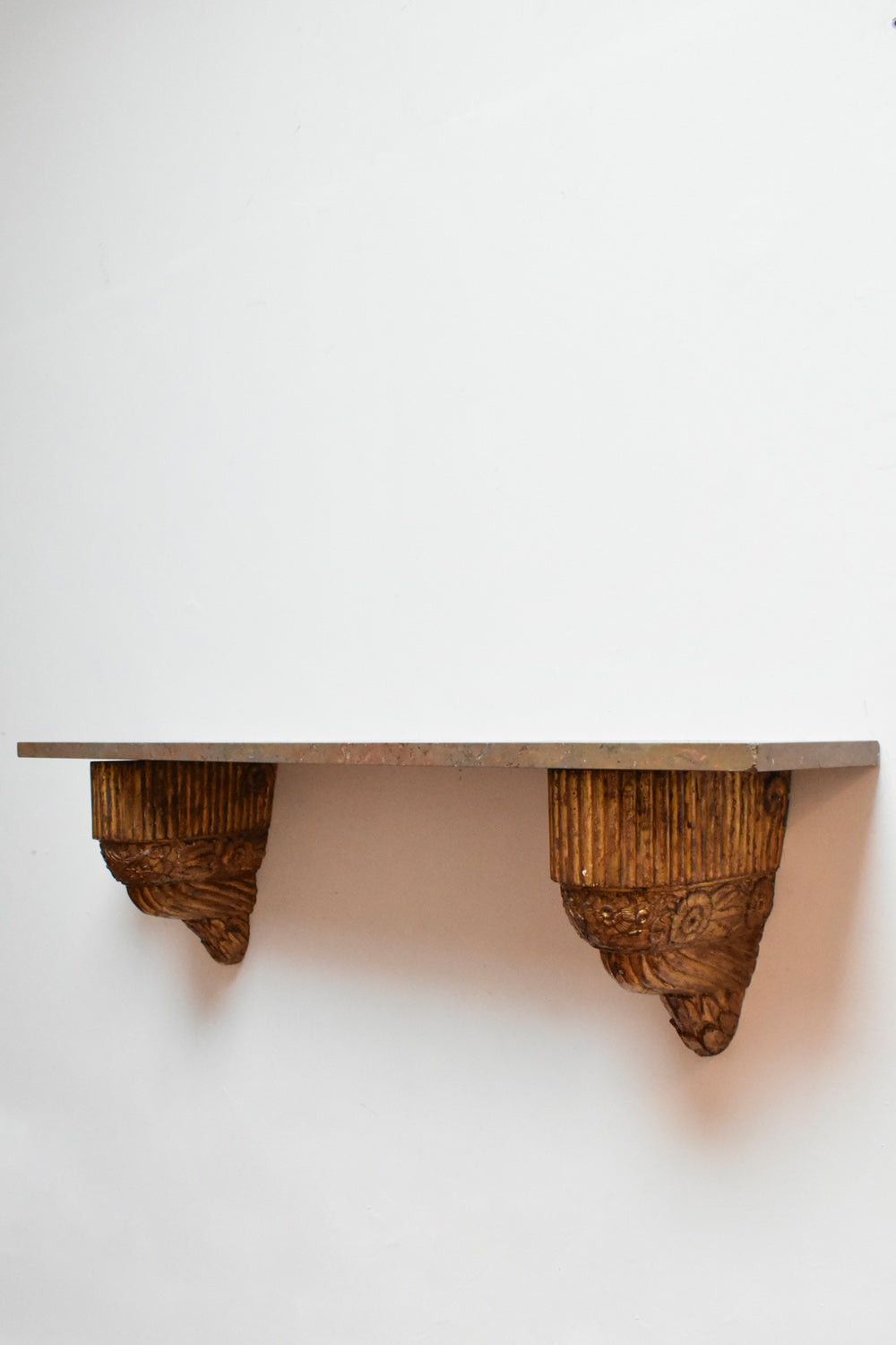 Art deco carved and gilded wooden console with rectangular marble top in shades of brown and grey. Portugal, 1930s.