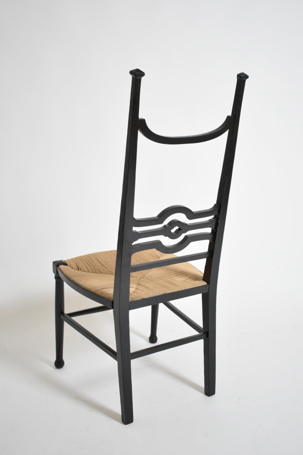 Ebonised wood fireside chair with a high back receiving an openwork headband, braced base and straw seating. England, 1900s.