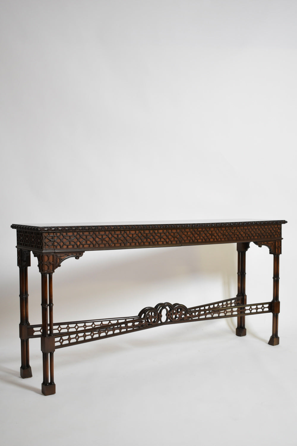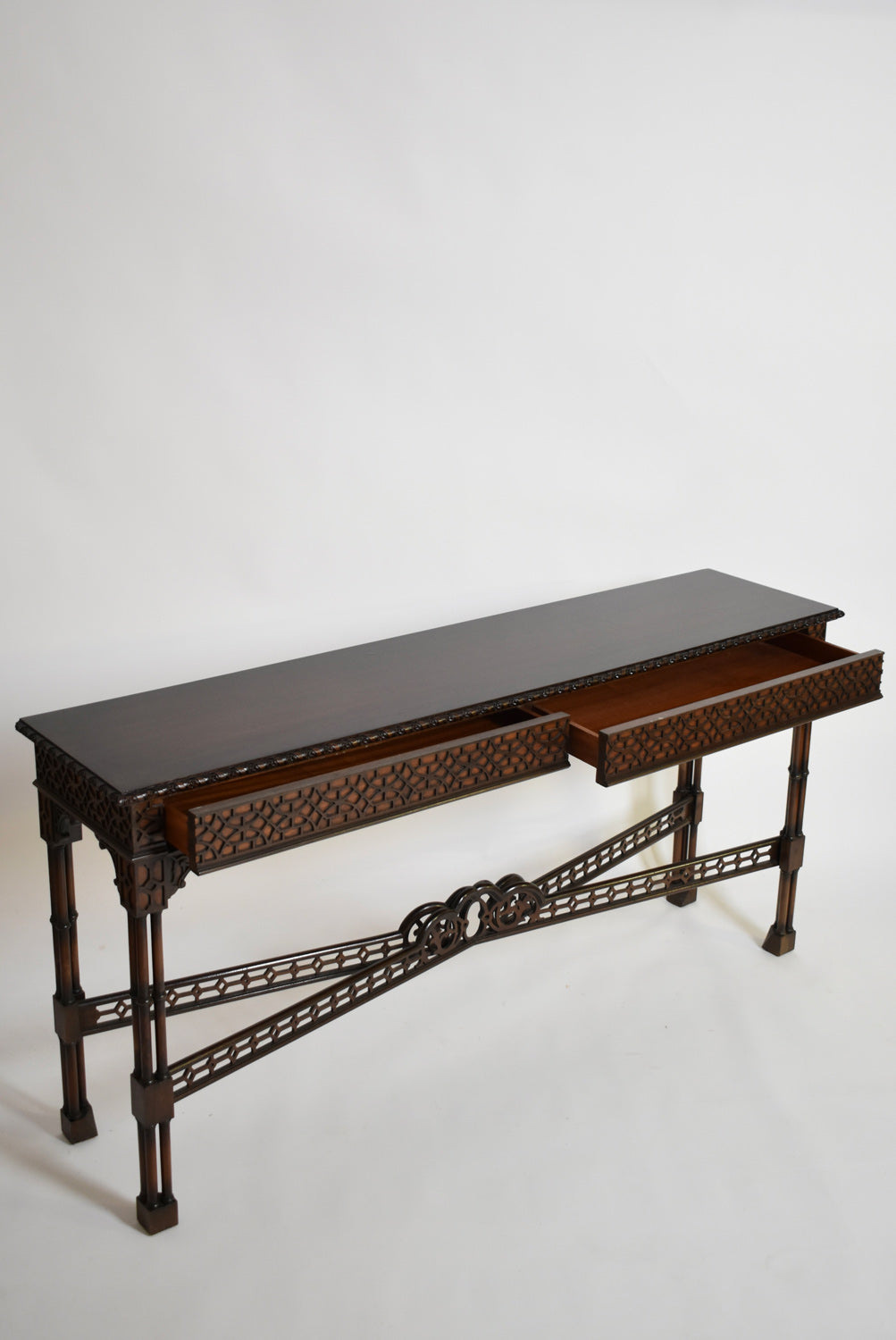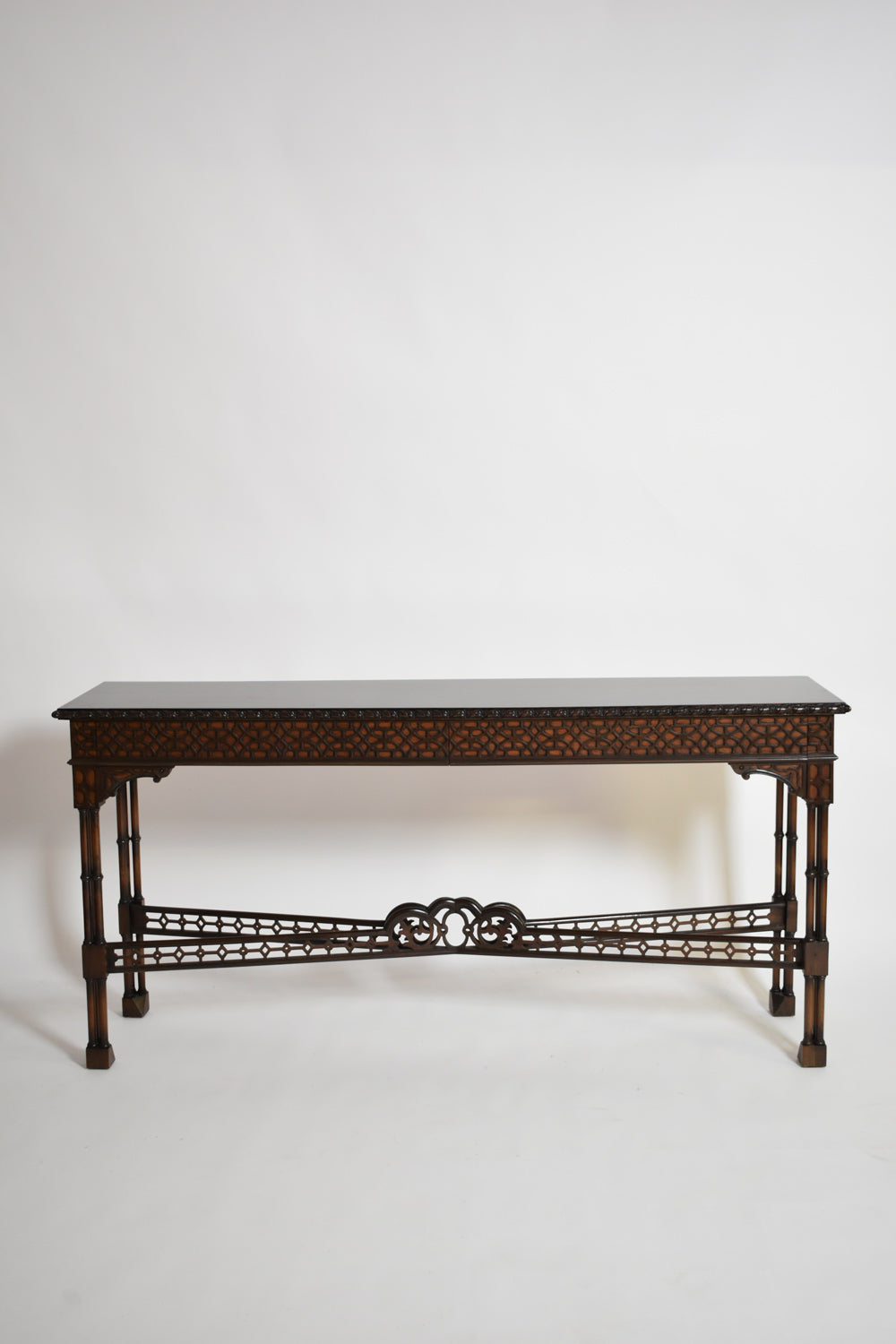 Chippendale carved wood sculptured console table, four faux bamboo feet joined by a X shape spacer, and opening with two drawers in the belt, in the style of China. England, late XIXth c.