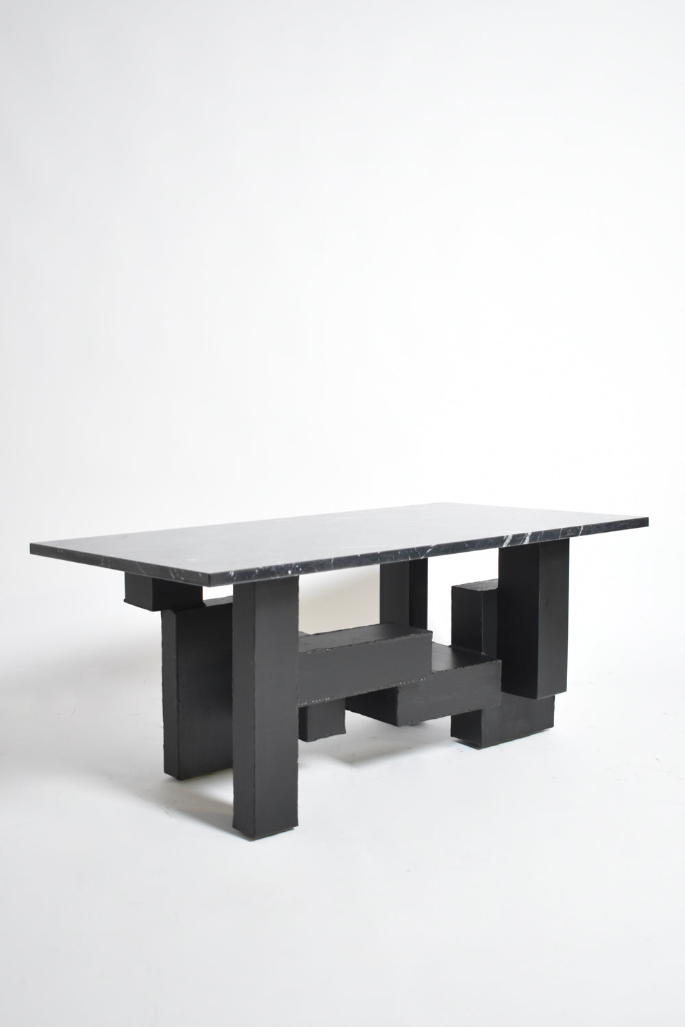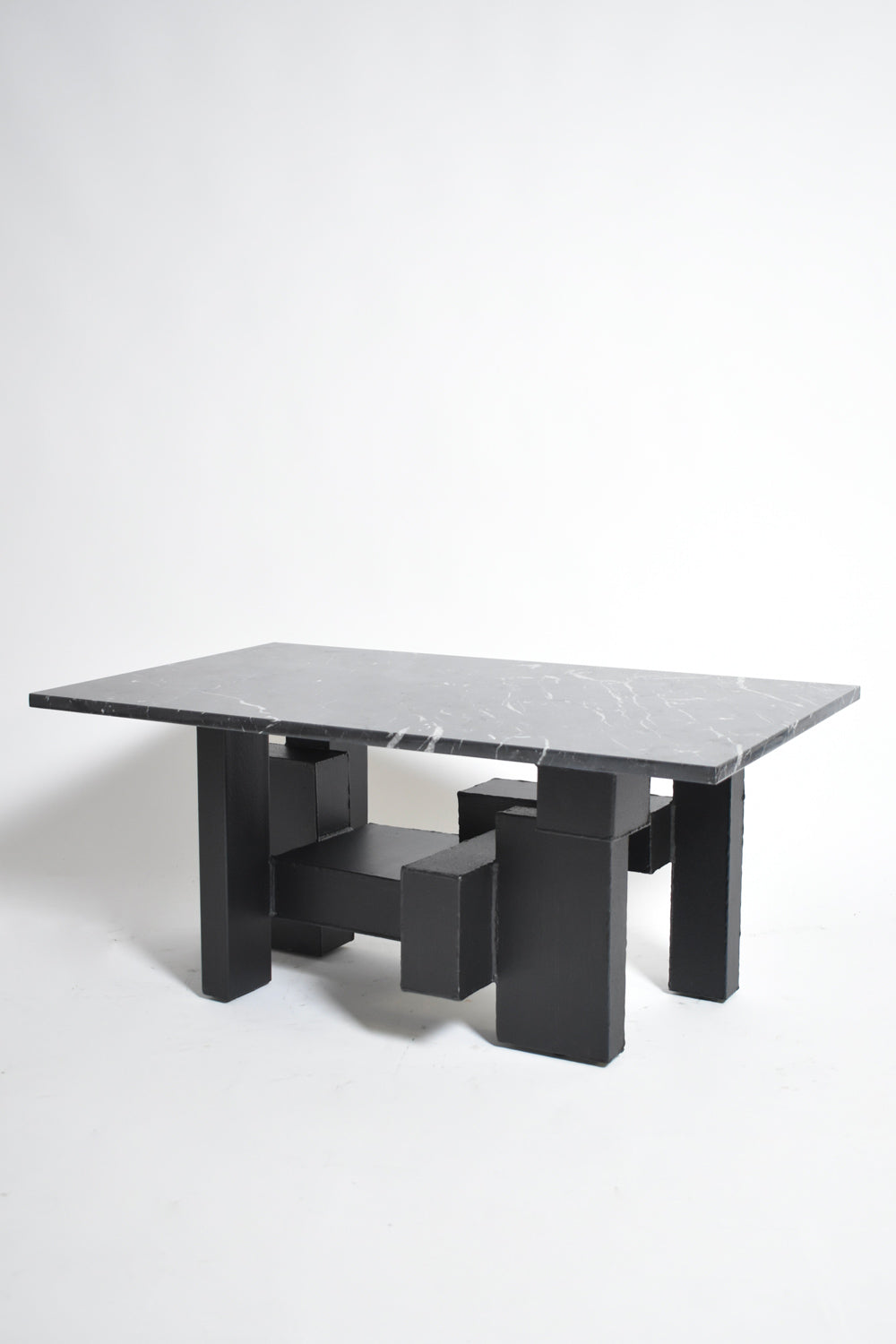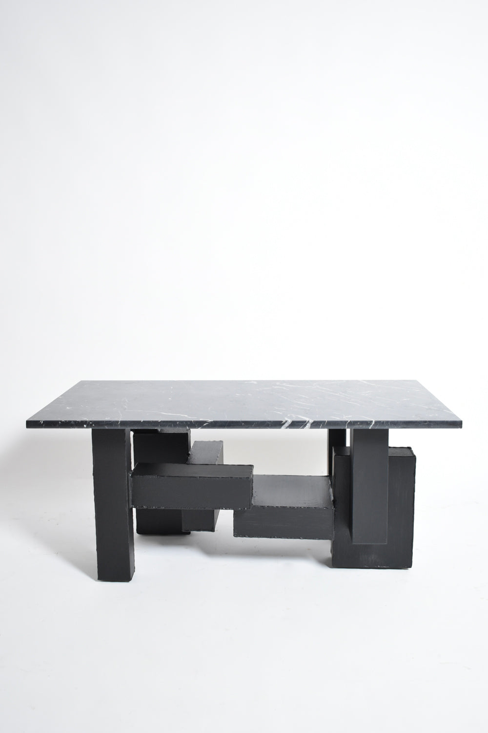 Cubist coffee table or side table with an iron base made of cubes supporting a black marble table top. France, 1980s.