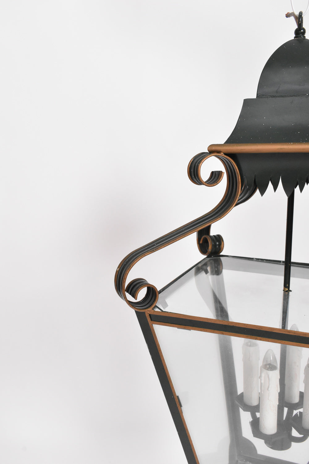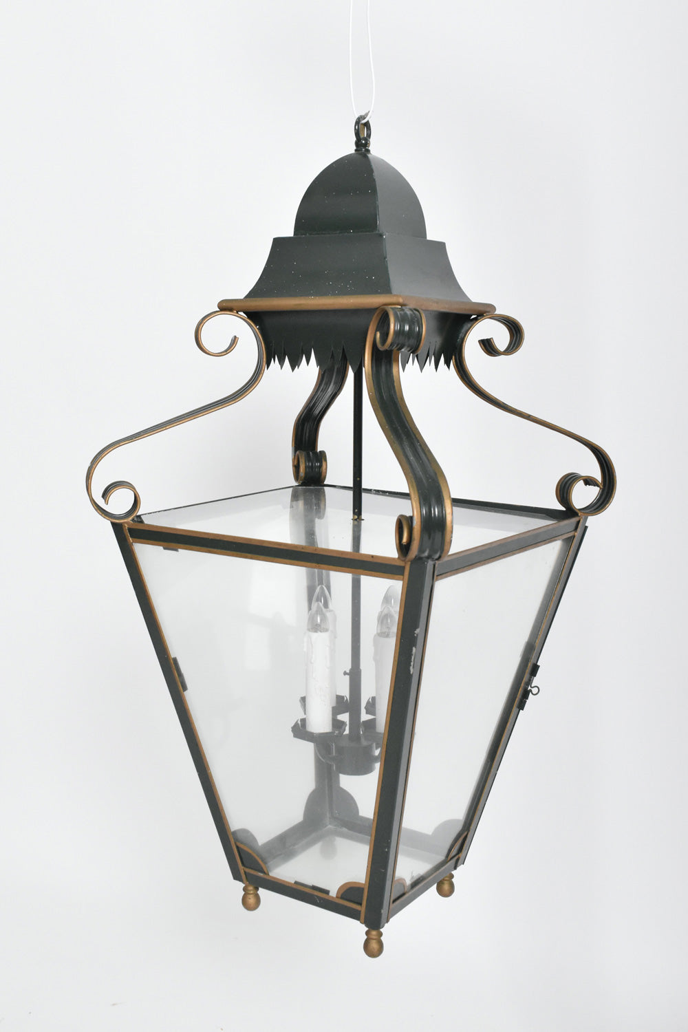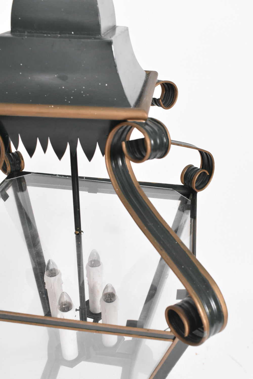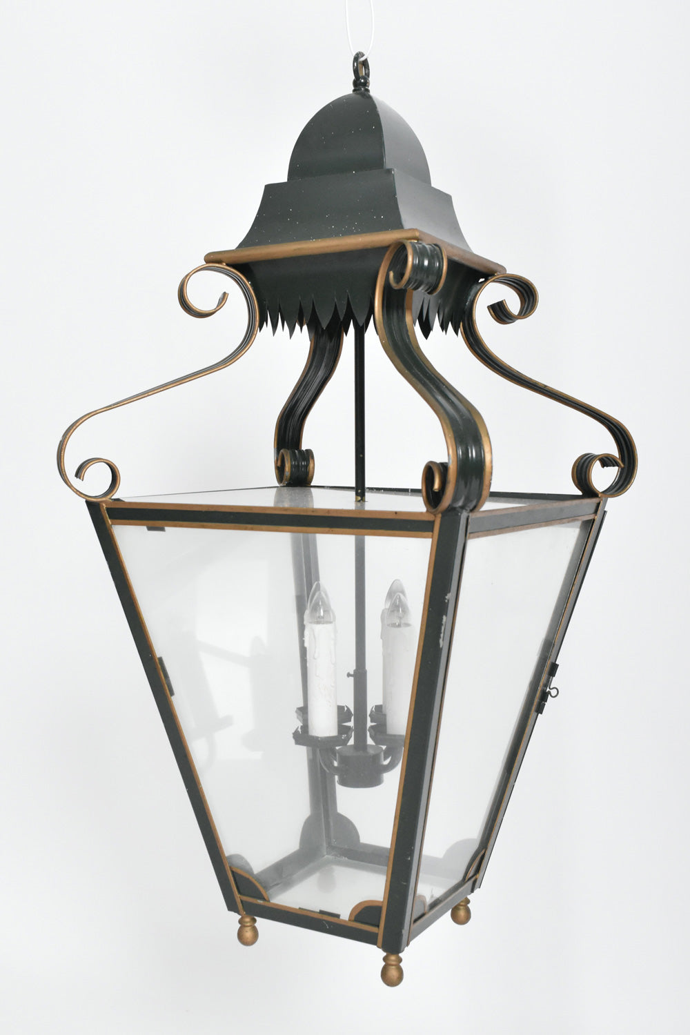 Green & gold painted sheet metal lantern pendant ceiling lamp. Portugal, 1970s.
