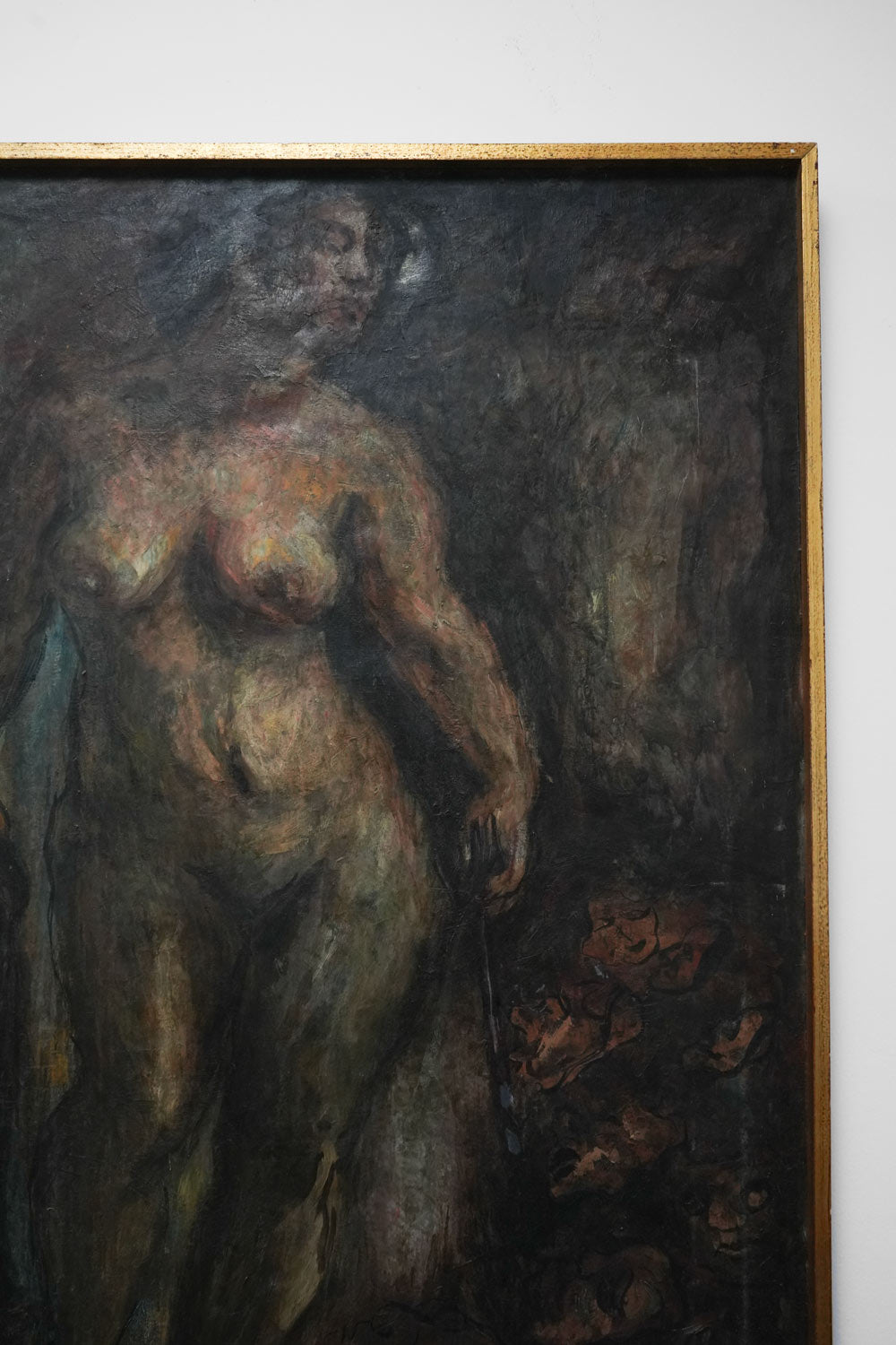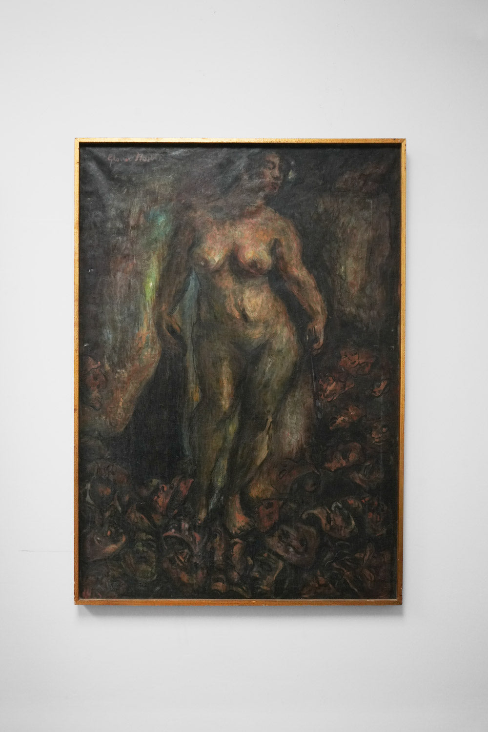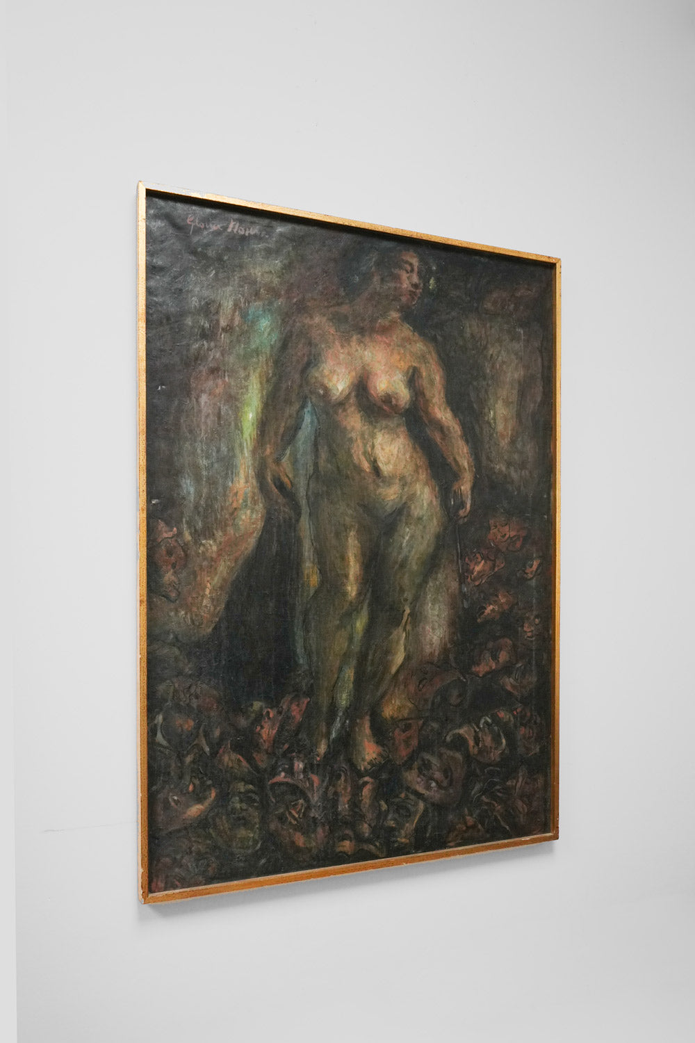 Oil on canvas representing a naked woman, Gloria Morera Font (1938 - ), "La soledad de la artista", signed and dated 1976. Spain, 1970s.