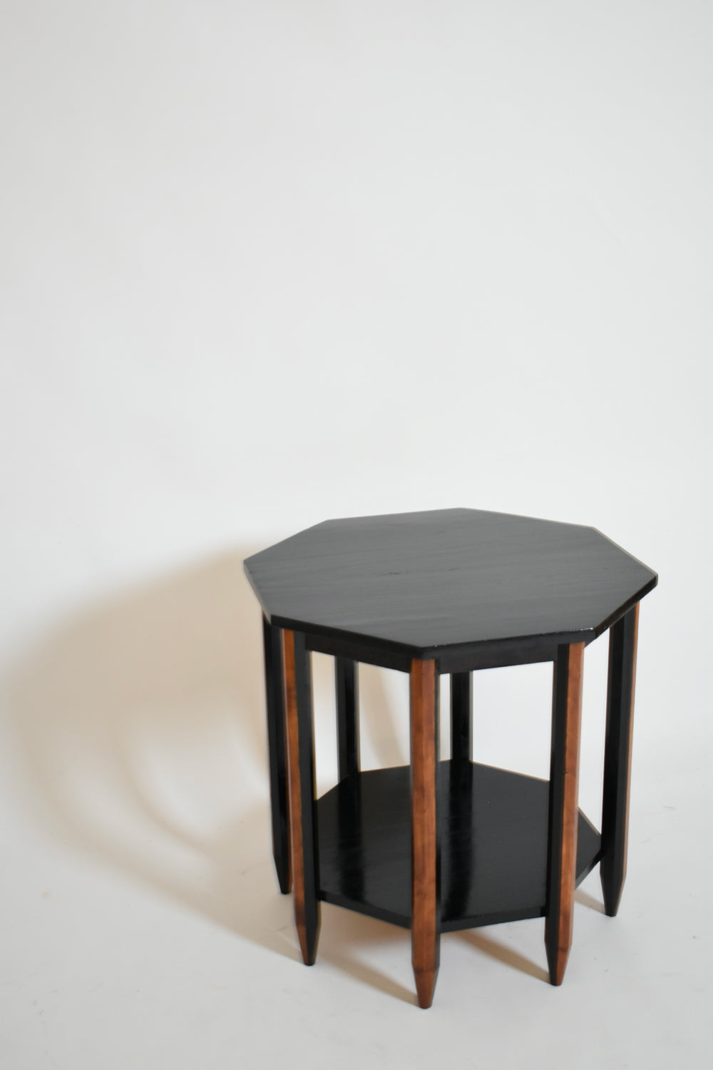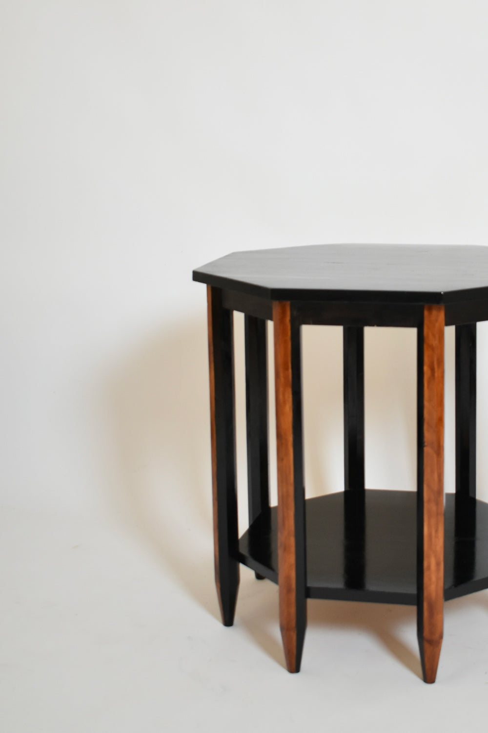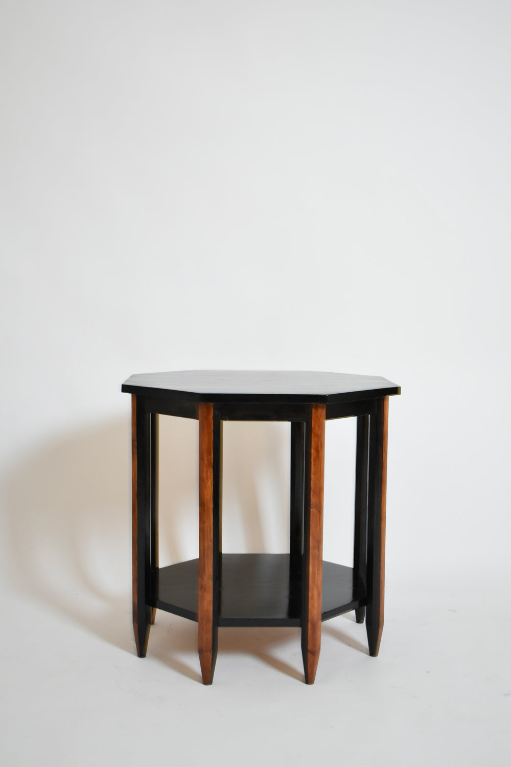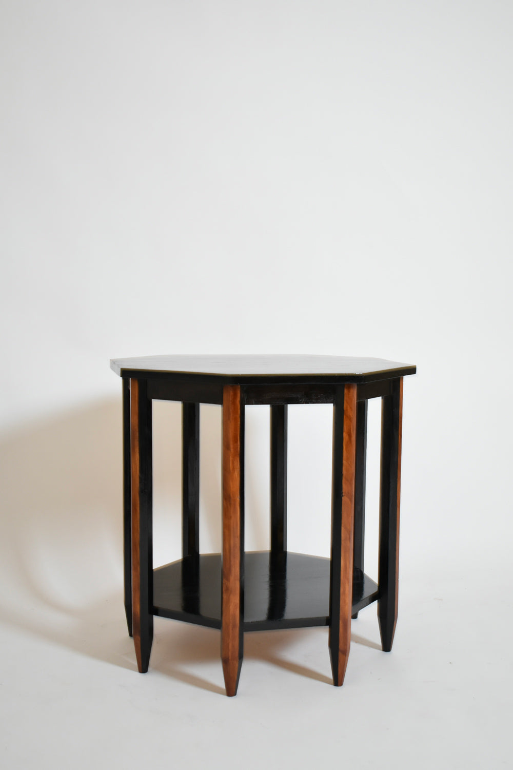 Modernist pedestal table with an octagonal top highlighted with a black net on a belt and eight eight-sided section legs joined by a spacer top. France, 1920s.