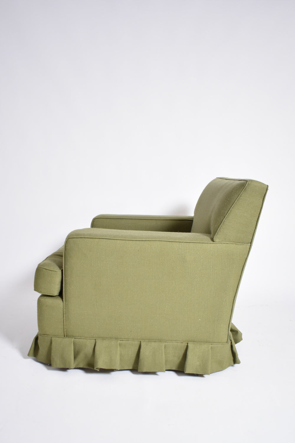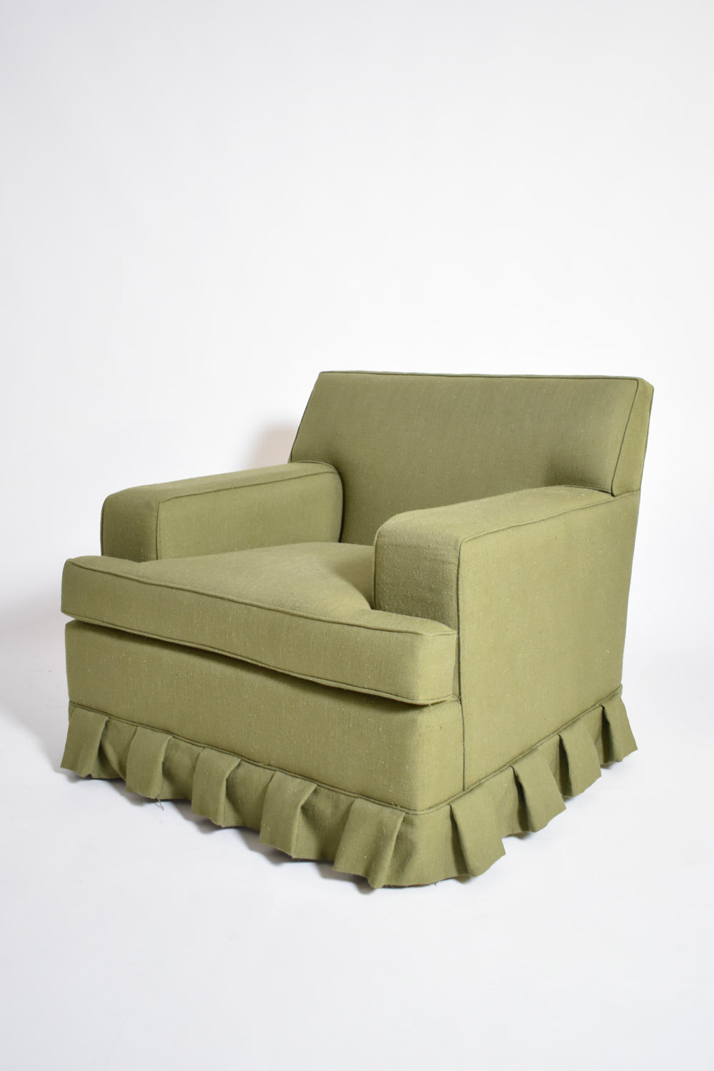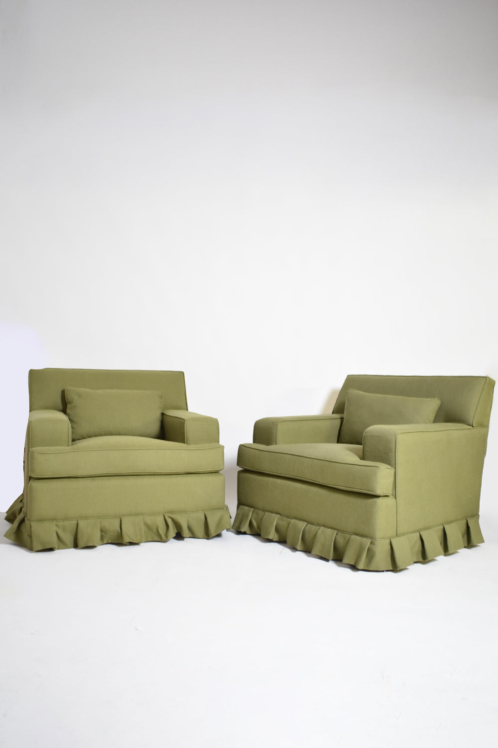 Pair of green fabric armchairs with a folded fabric fringe in the down part. France, 1960s.