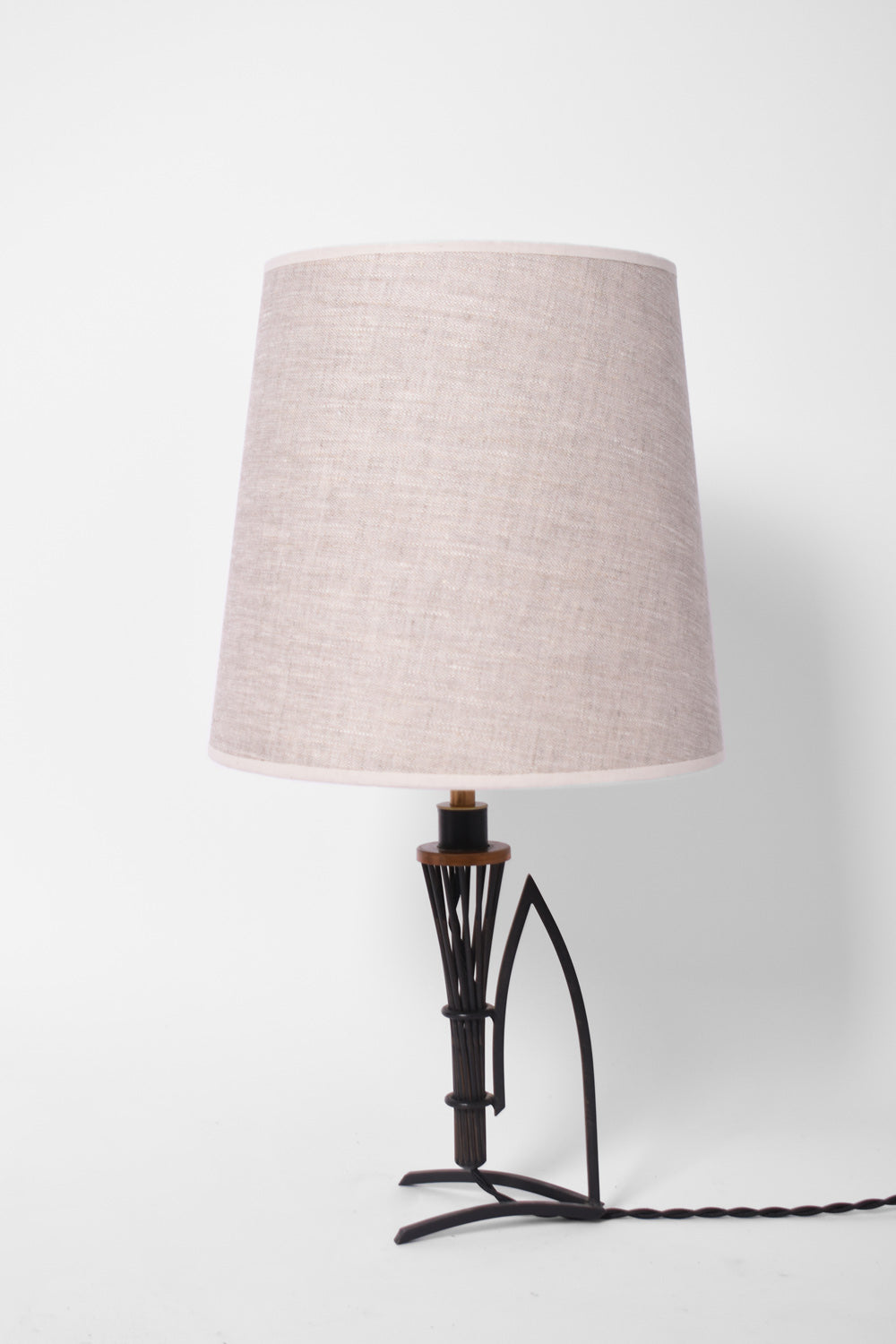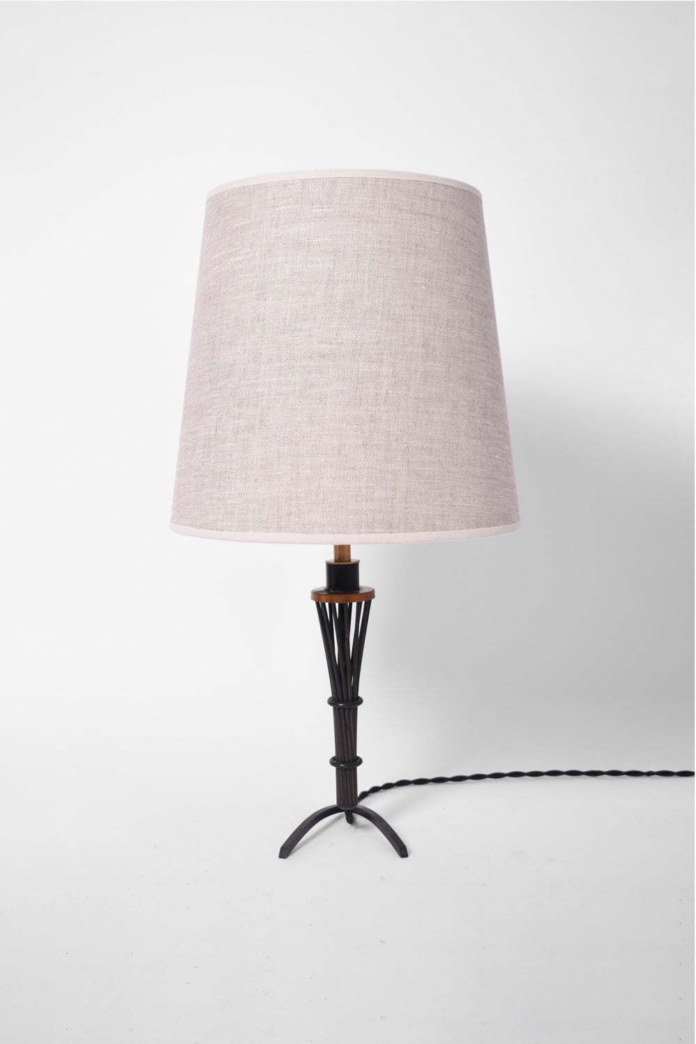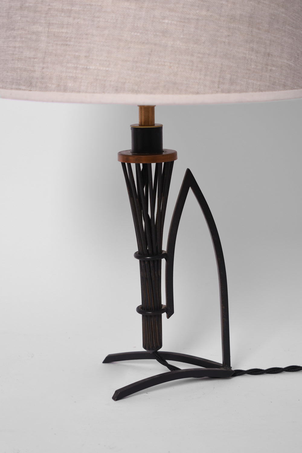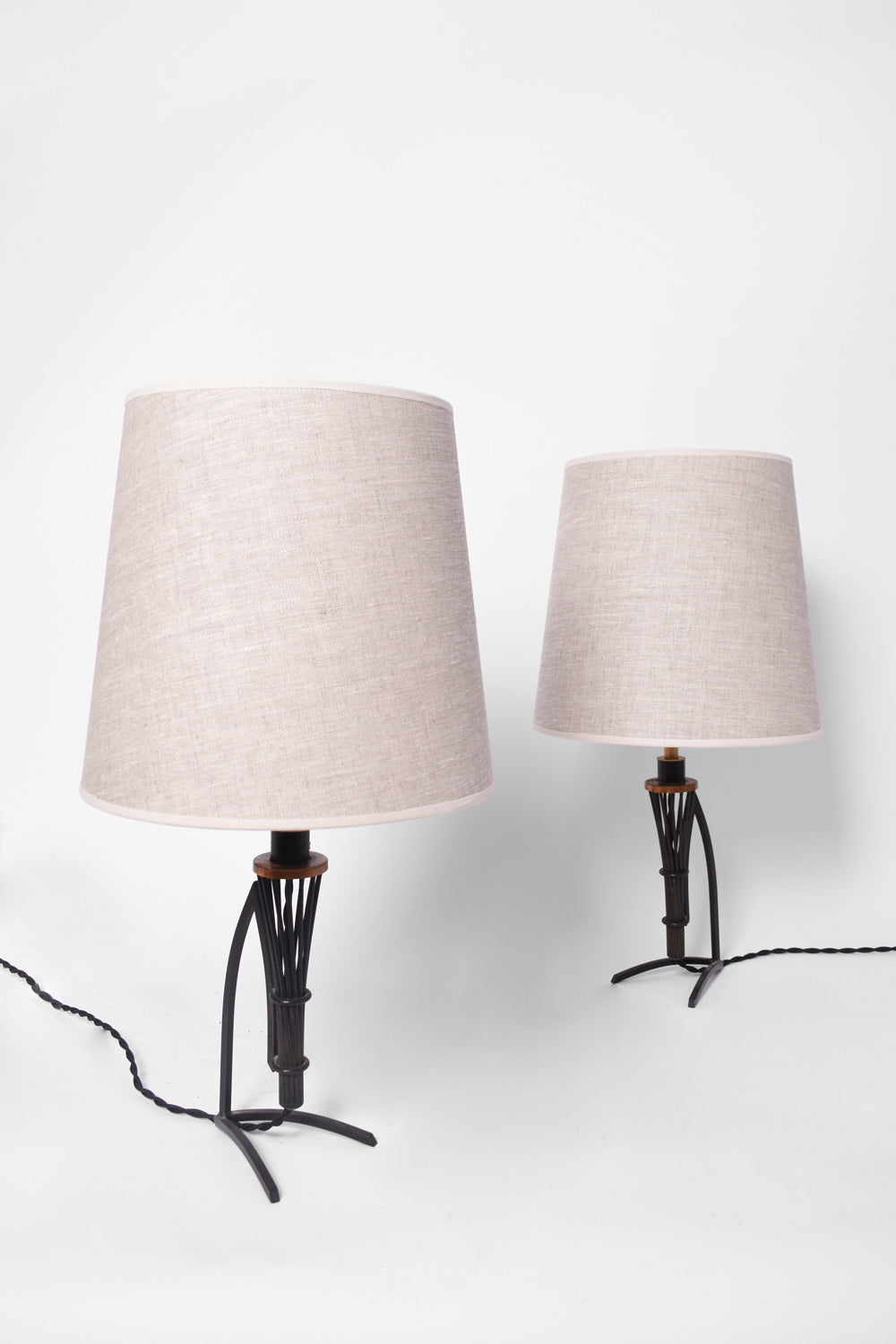Pair of wrought iron copper table lamps resting on a base holding a cone made of iron sticks. France, 1940s.