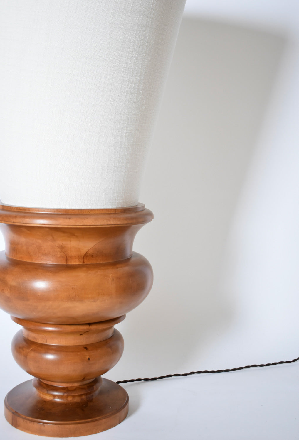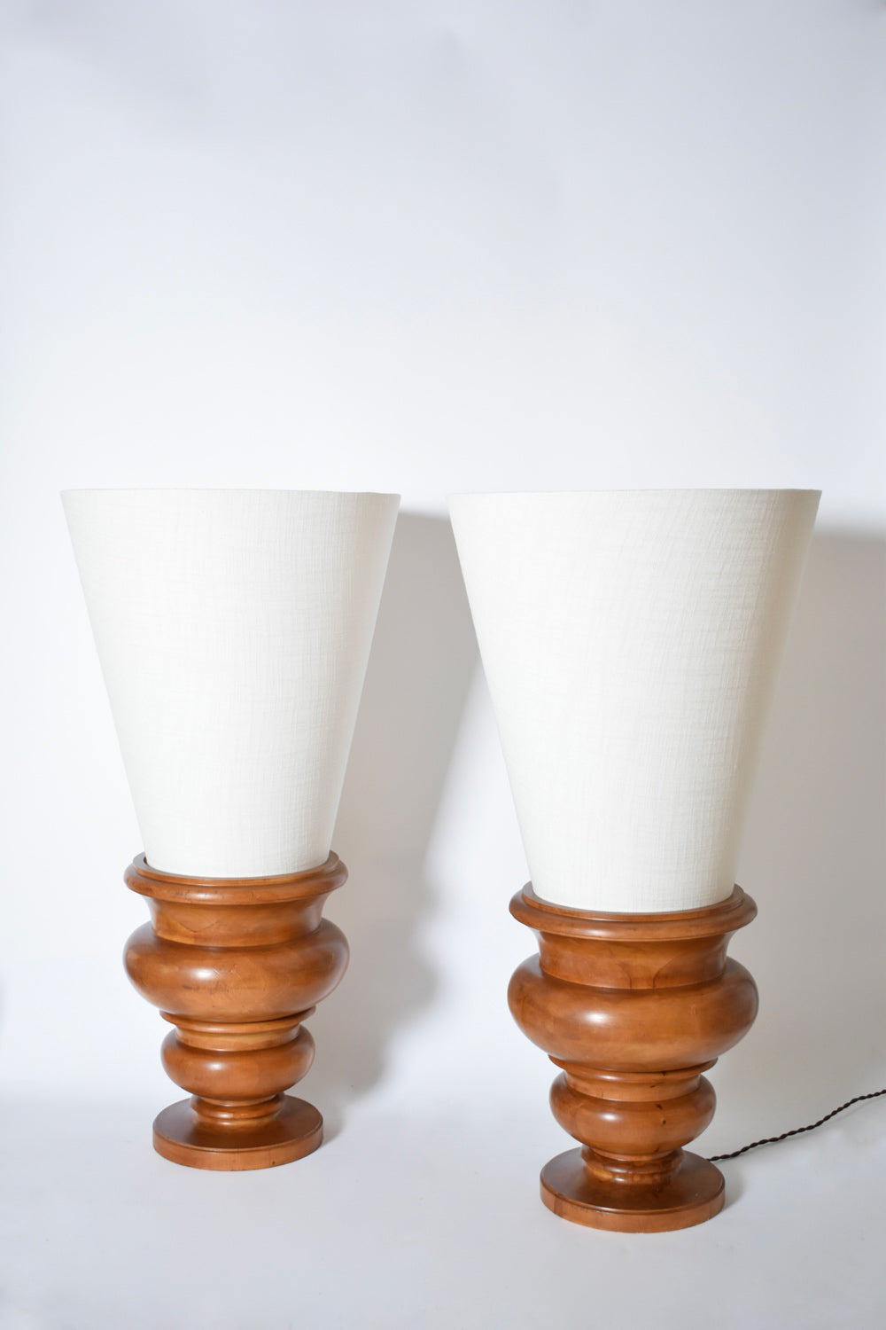 Pair of turned light wood lamps, illuminated basins with an inverse conique lampshade on top. France, 1970s.