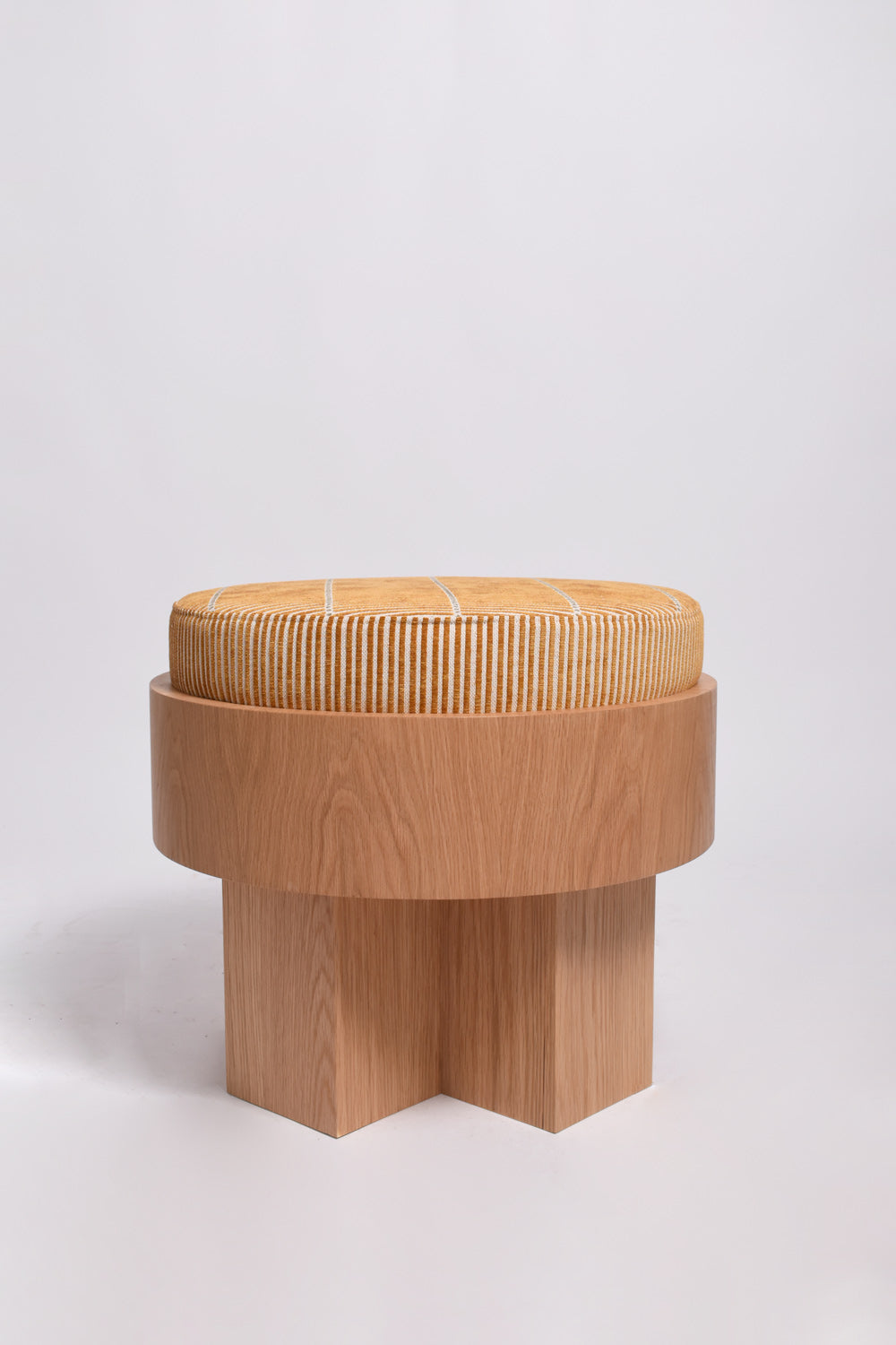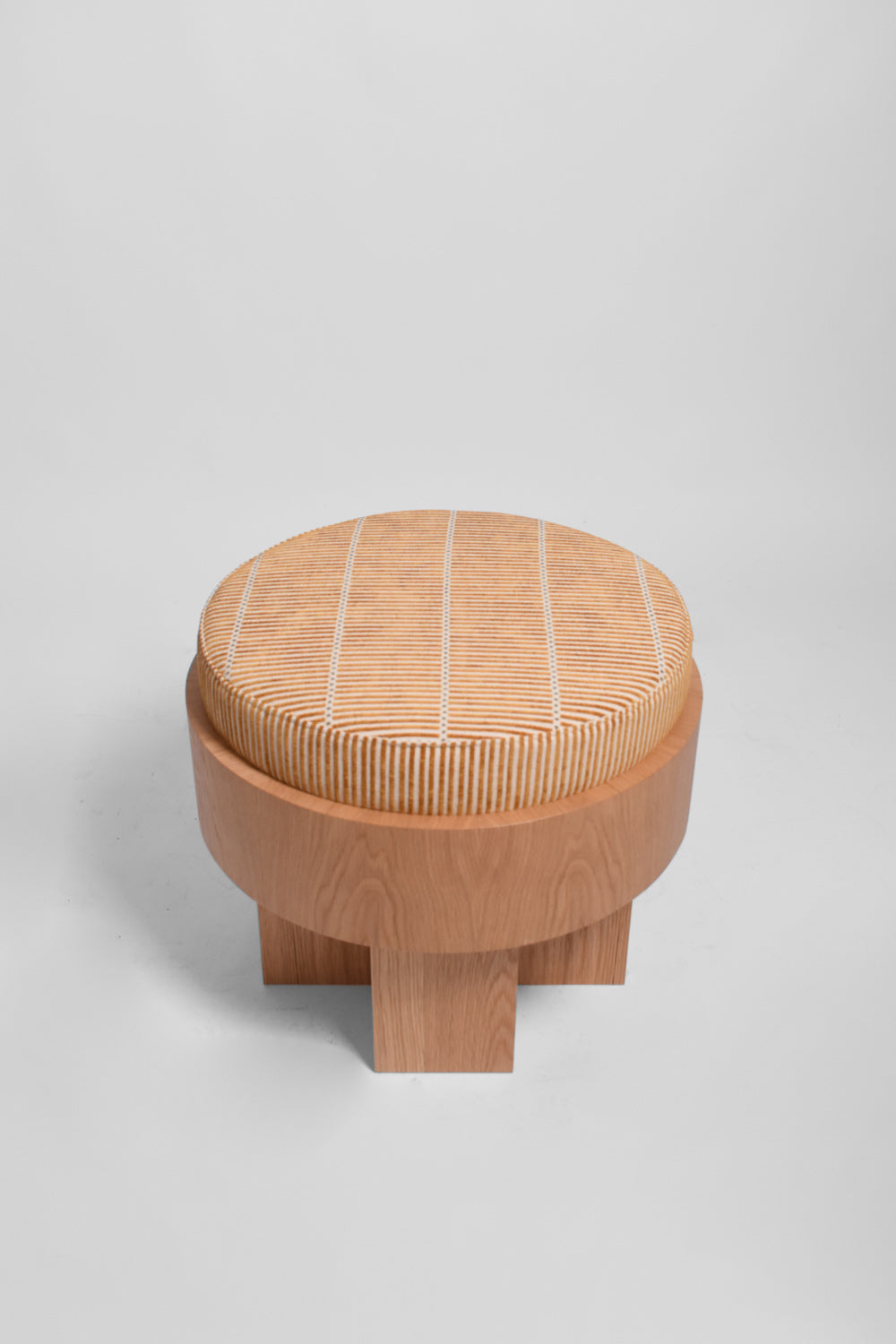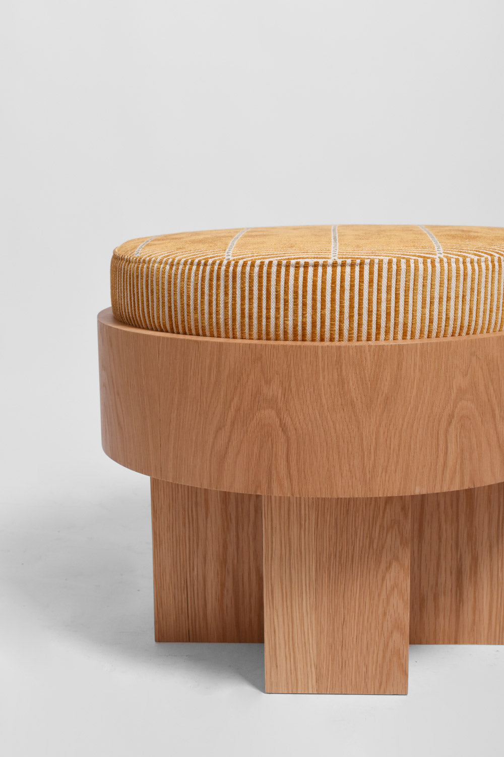 Quiet Studios wooden pouf with yellow striped cushion on top. Portugal.