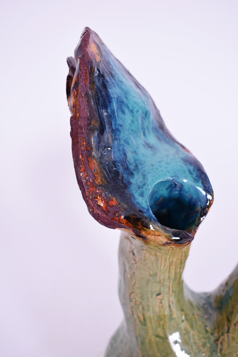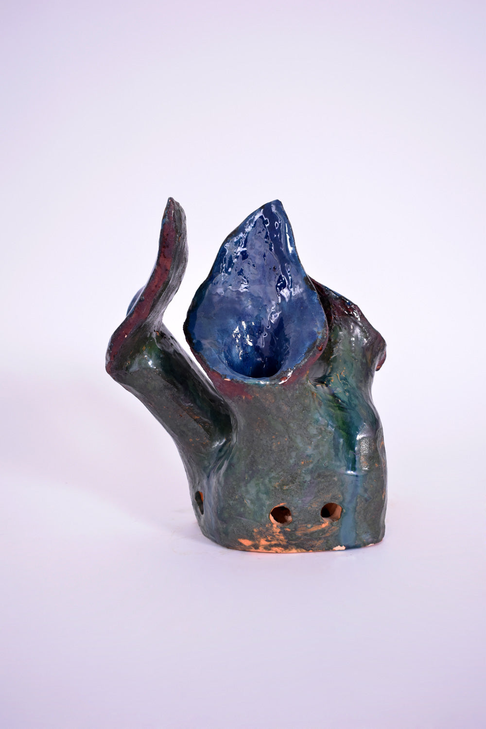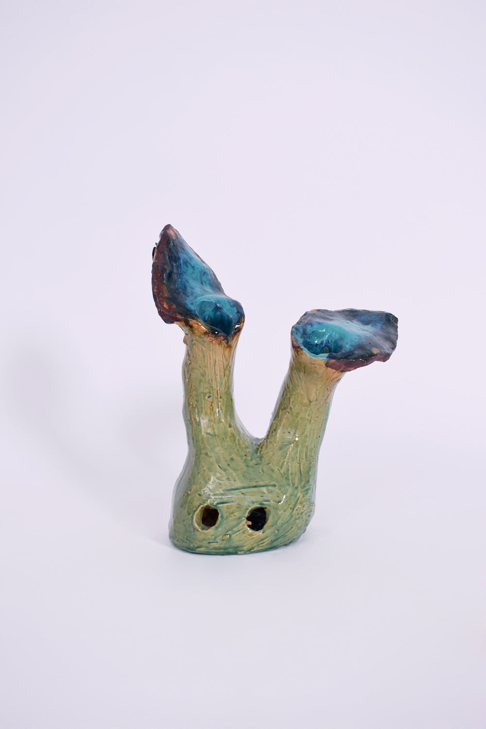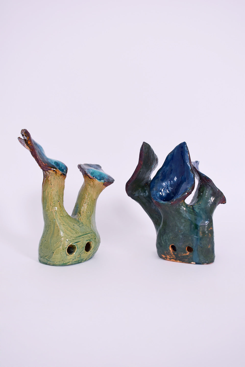 Set of two decorative terracotta glazed organic shaped in light green and blue tones. Portugal, 1990s.