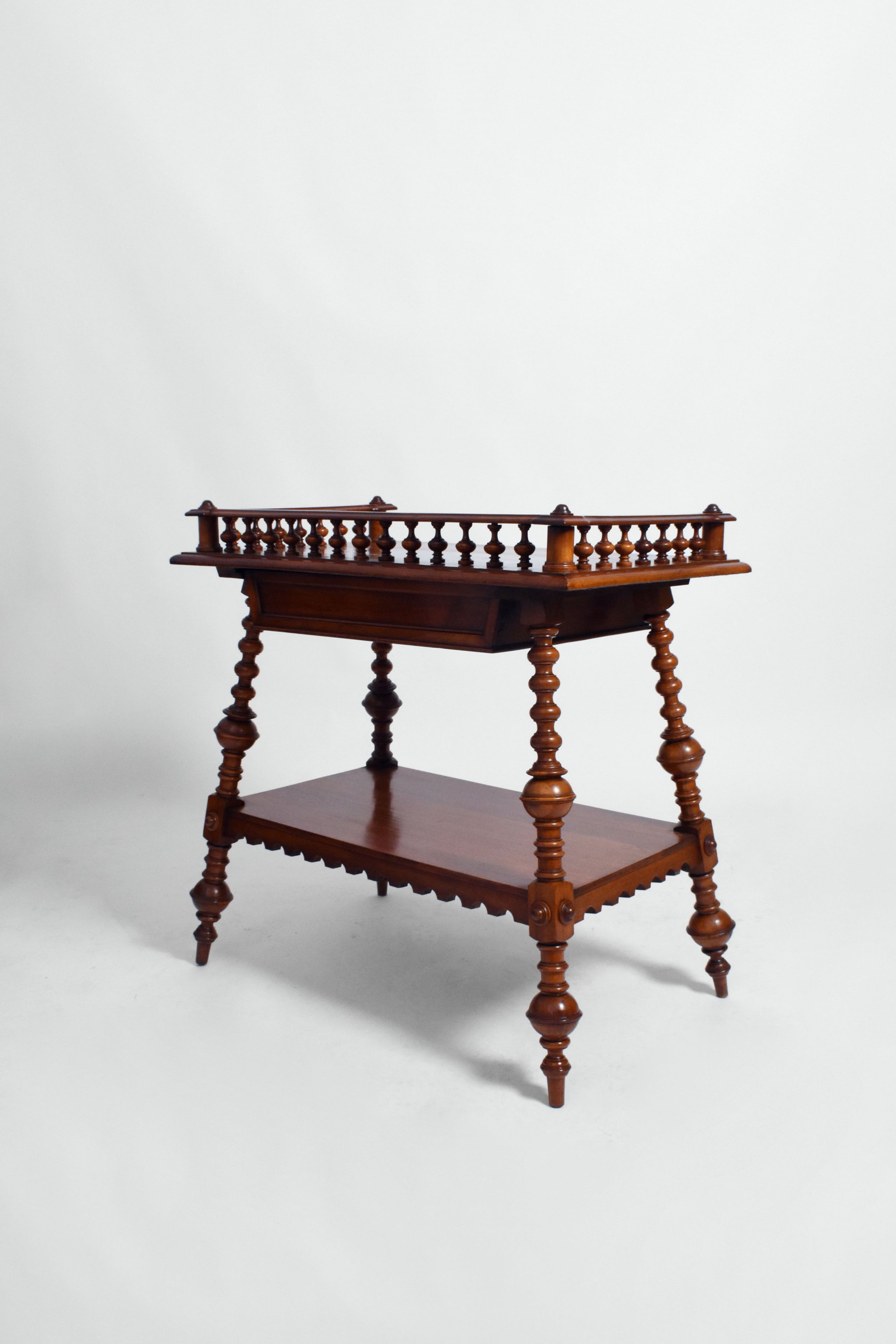 Console table in turned wood resting on four tapered legs, a frieze drawer under the top. England,1910s.