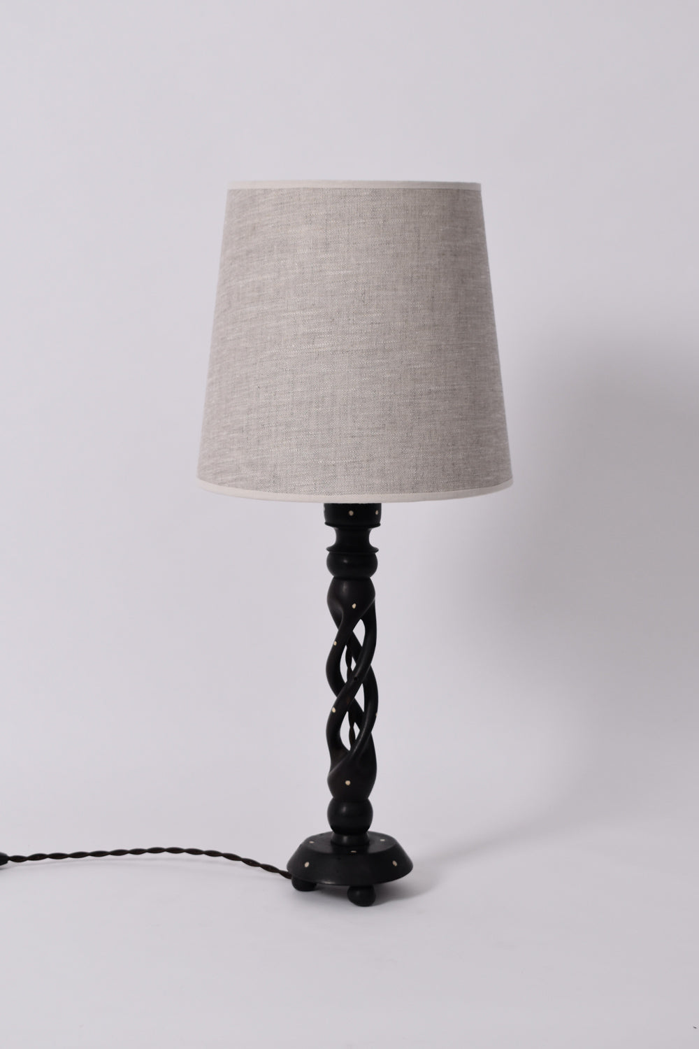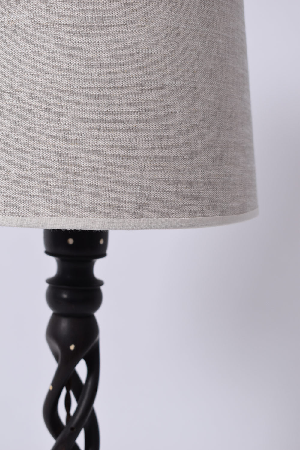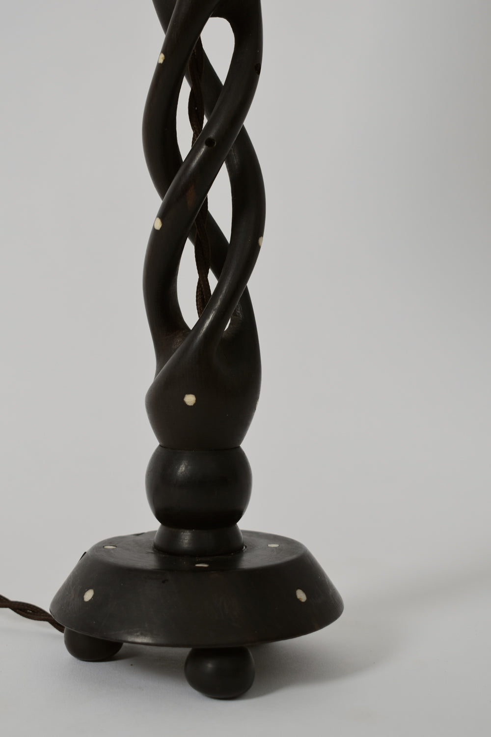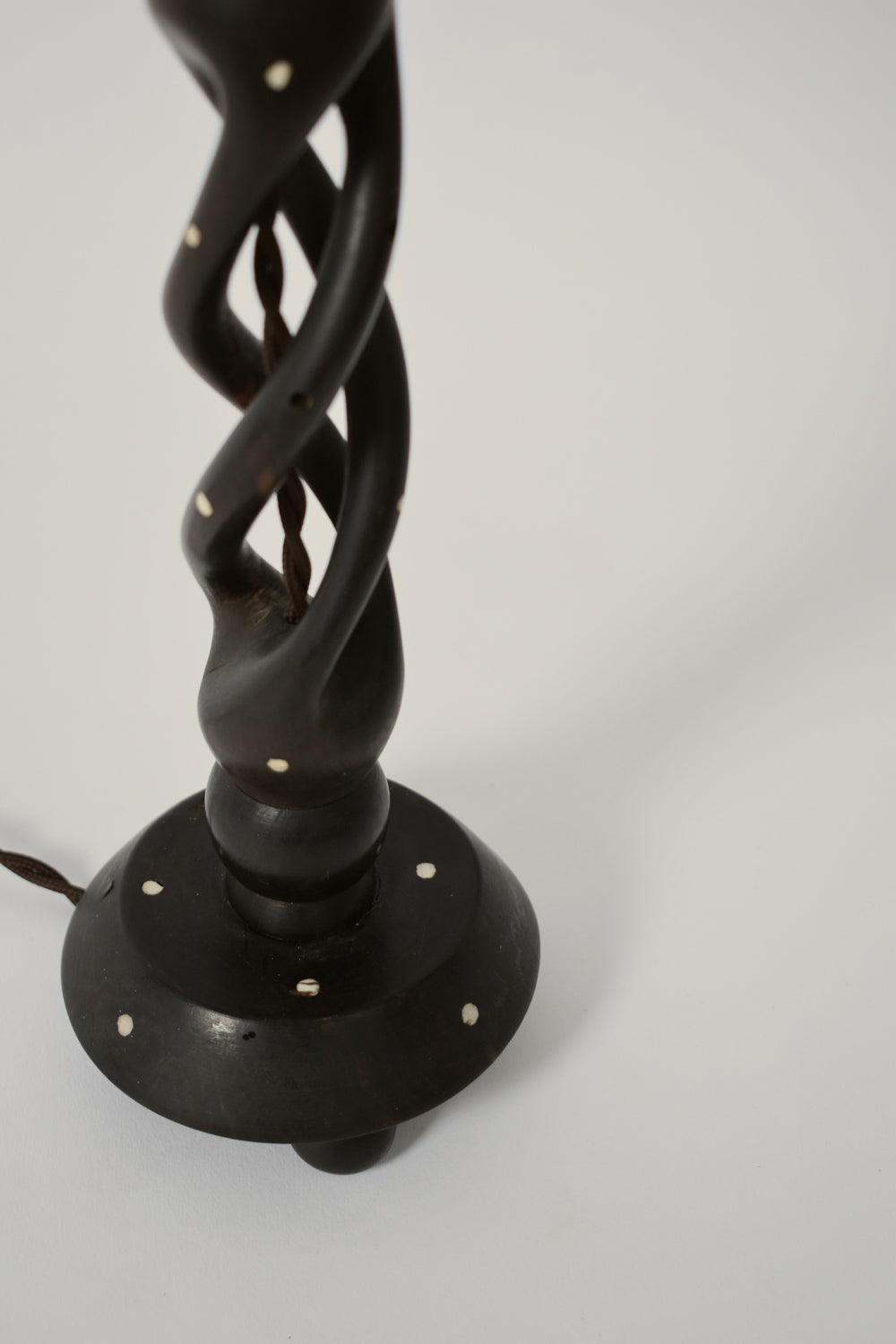 Turned ebonised wood twist lamp resting on a tripod base. Mozambique, 1960s.