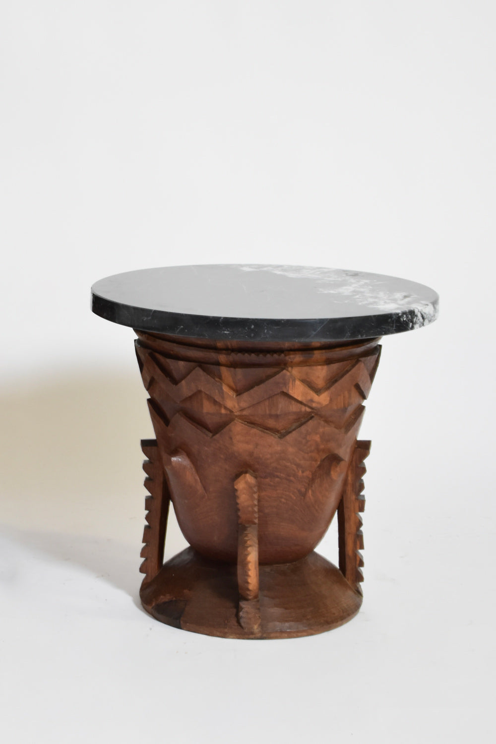 Pair of large African carved wooden monolithic mortars mounted as side tables with round marble tops. African work, 1960s.
