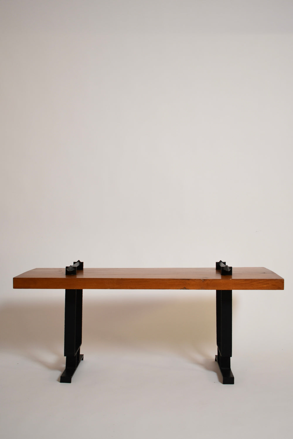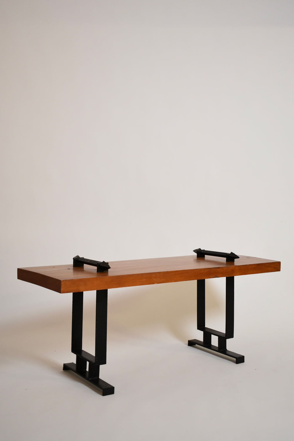 Rectangular coffee table or bench with natural wood table top, and wrought iron legs and handles. France, 1950s.