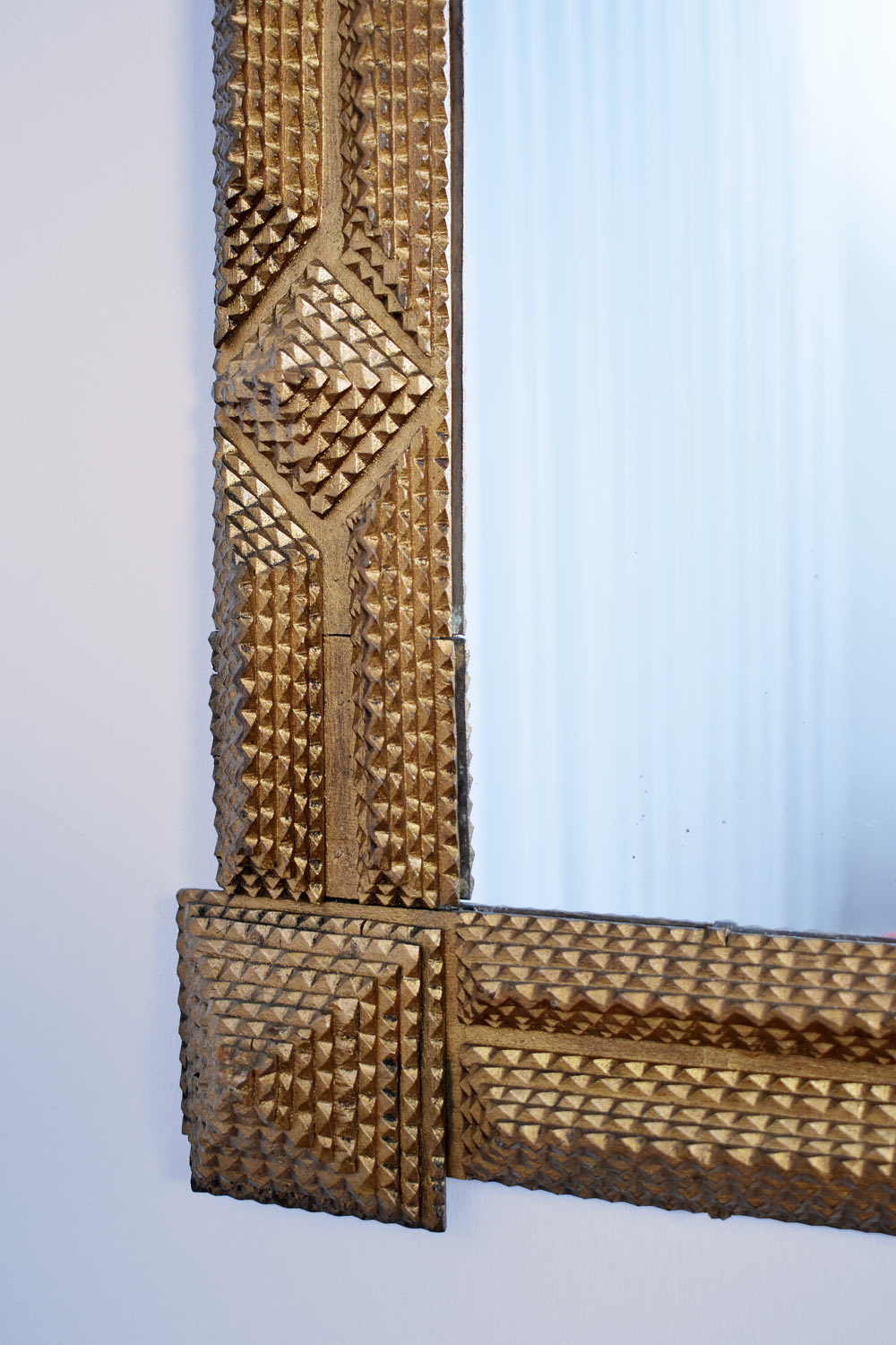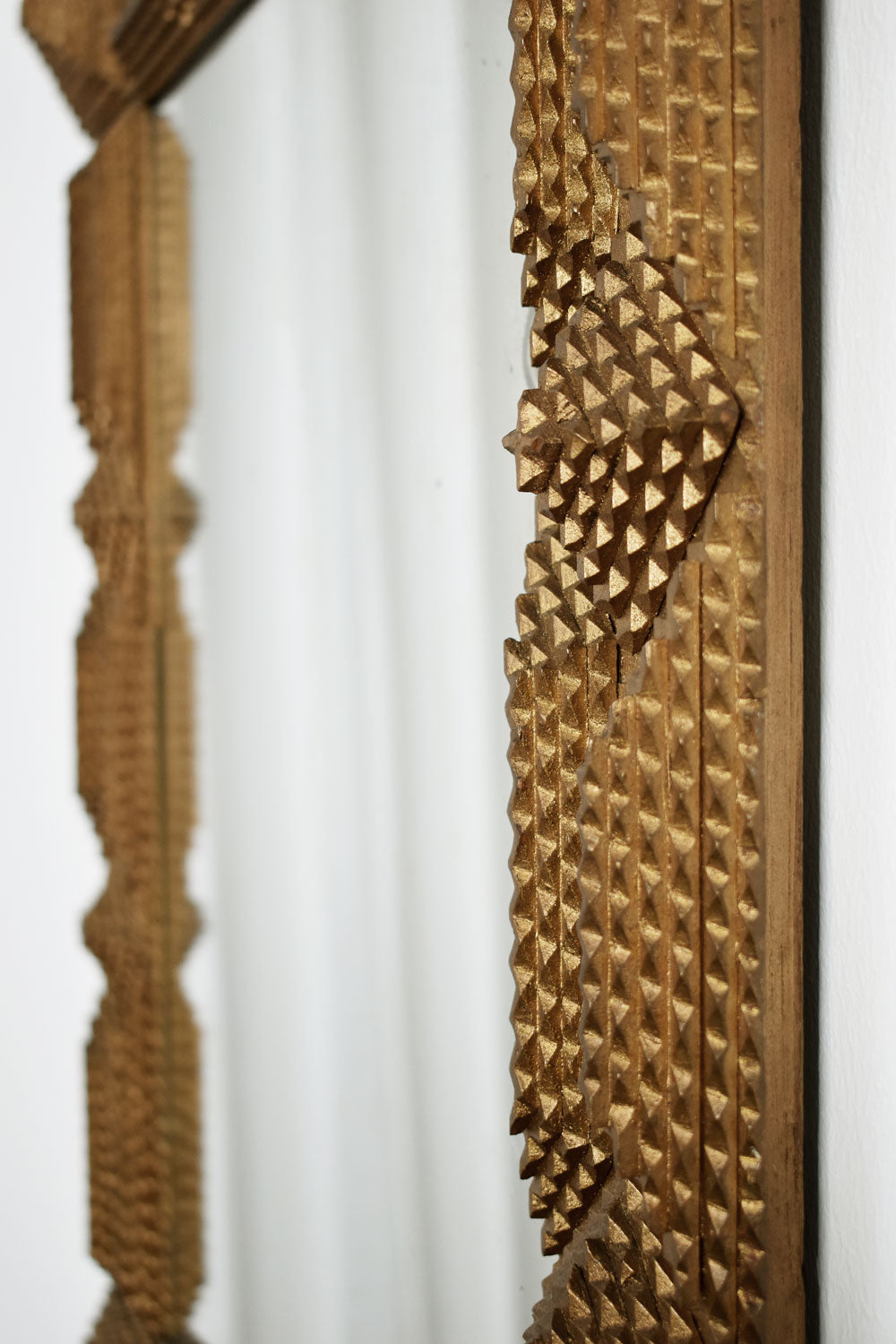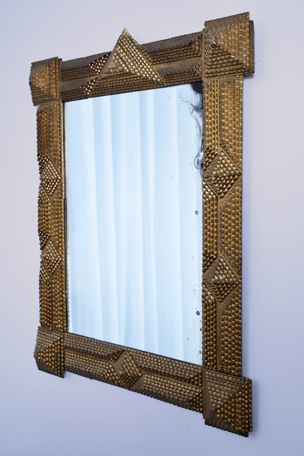 Folk art mirror with a gilded wooden sculptured frame. Black Forest, France, 1910s.