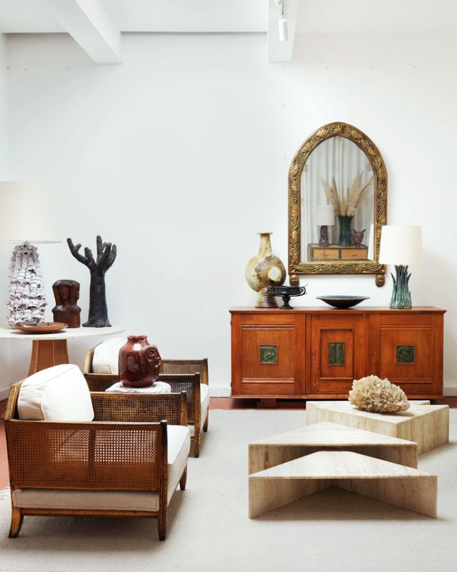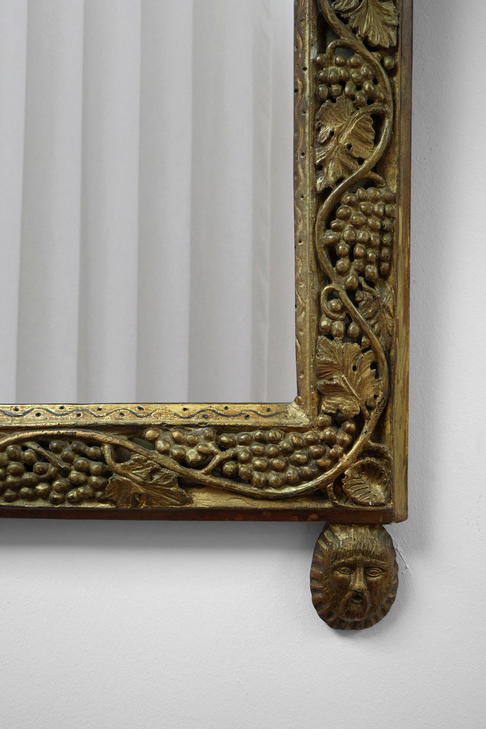 Important gilded wood, molded and carved pediment mirror with vine branches and mascarons decoration. France, XXth c.
