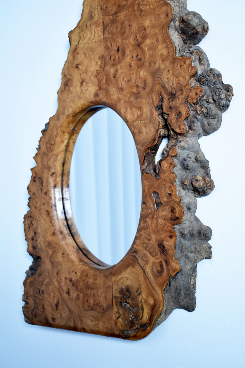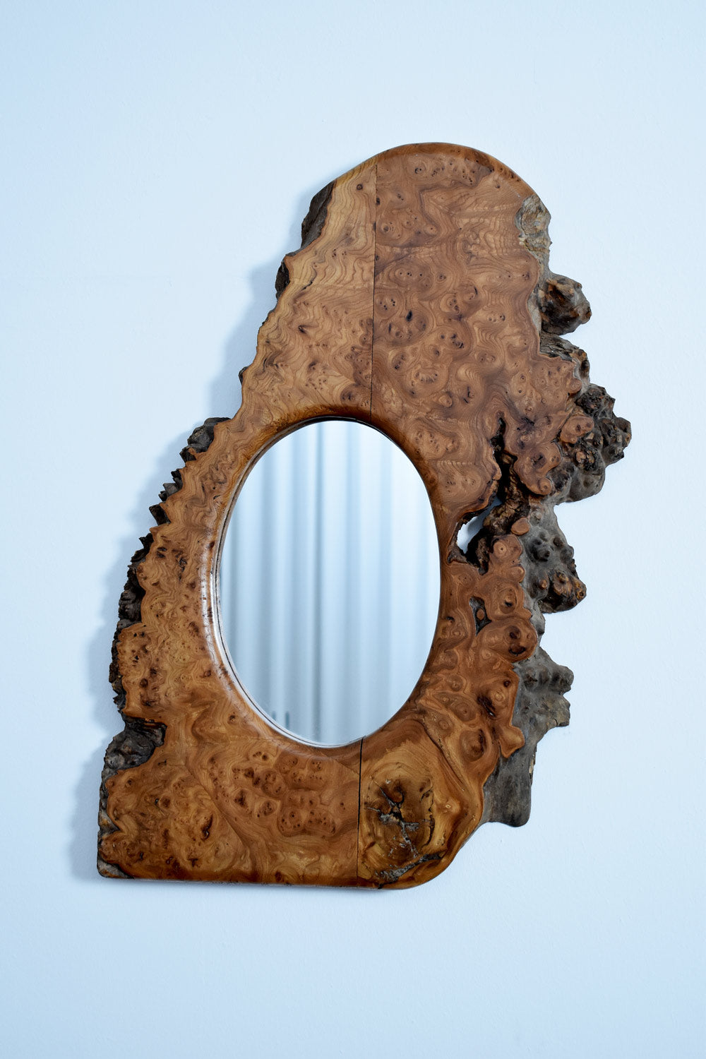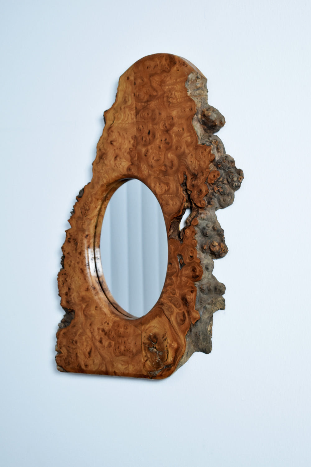 Medium free shape brutalist burl wood mirror. France, 1970s.