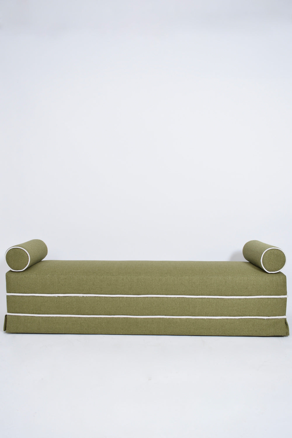 "Carrasqueira"bench, bed end with a green fabric, Barracuda edition. Made in Portugal. .All Barracuda Edition pieces can be personalized for the convenience of each interior design project.