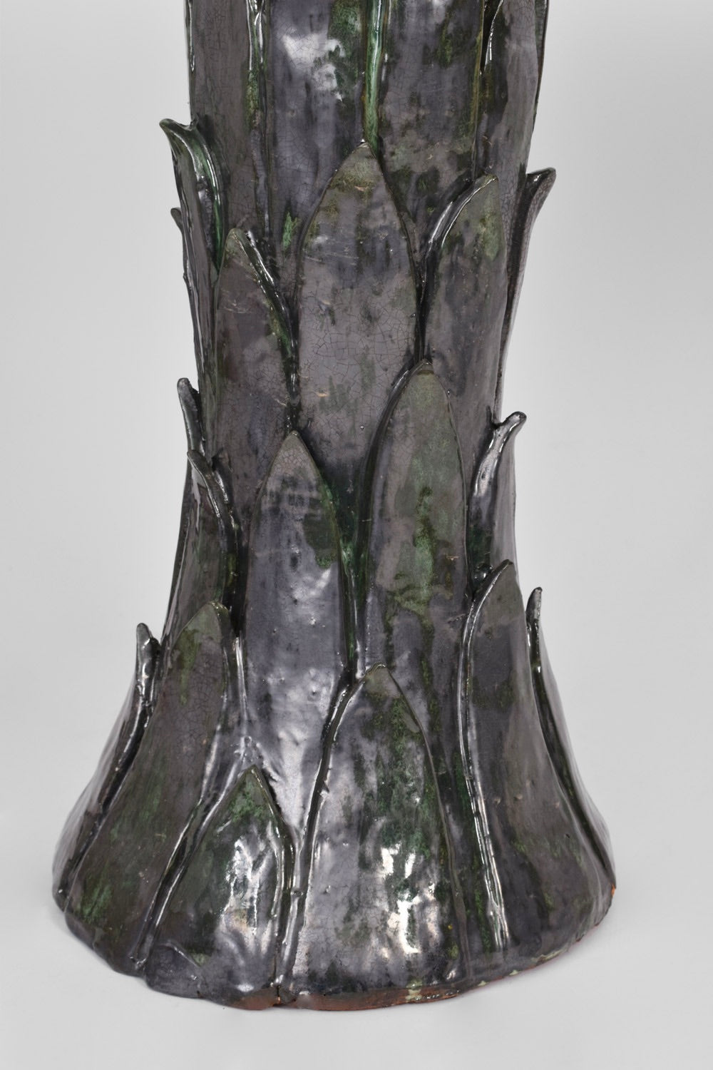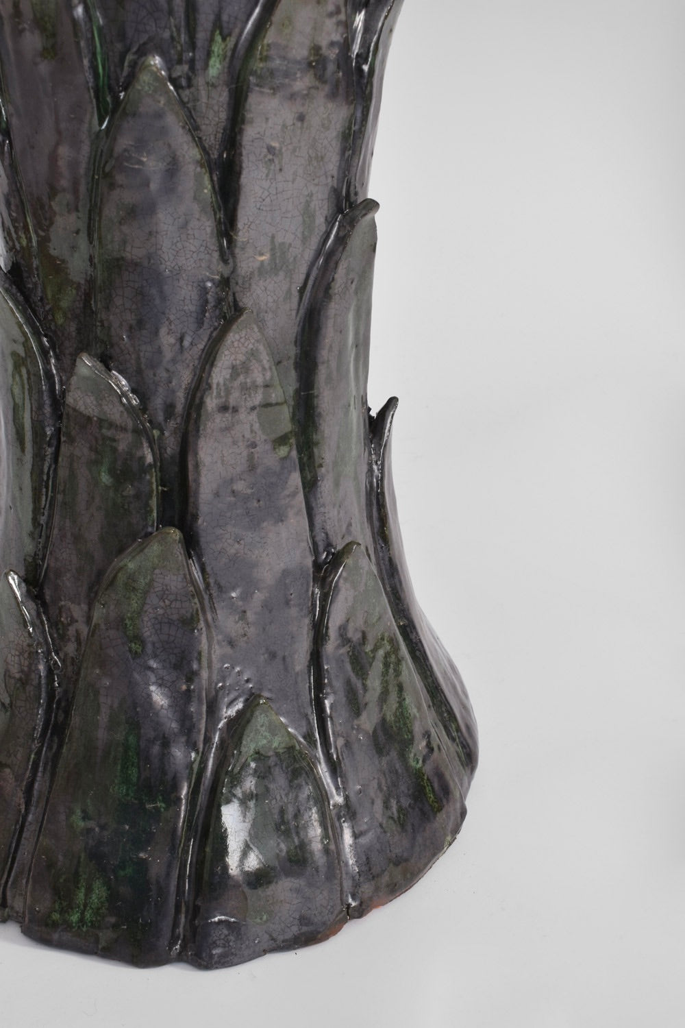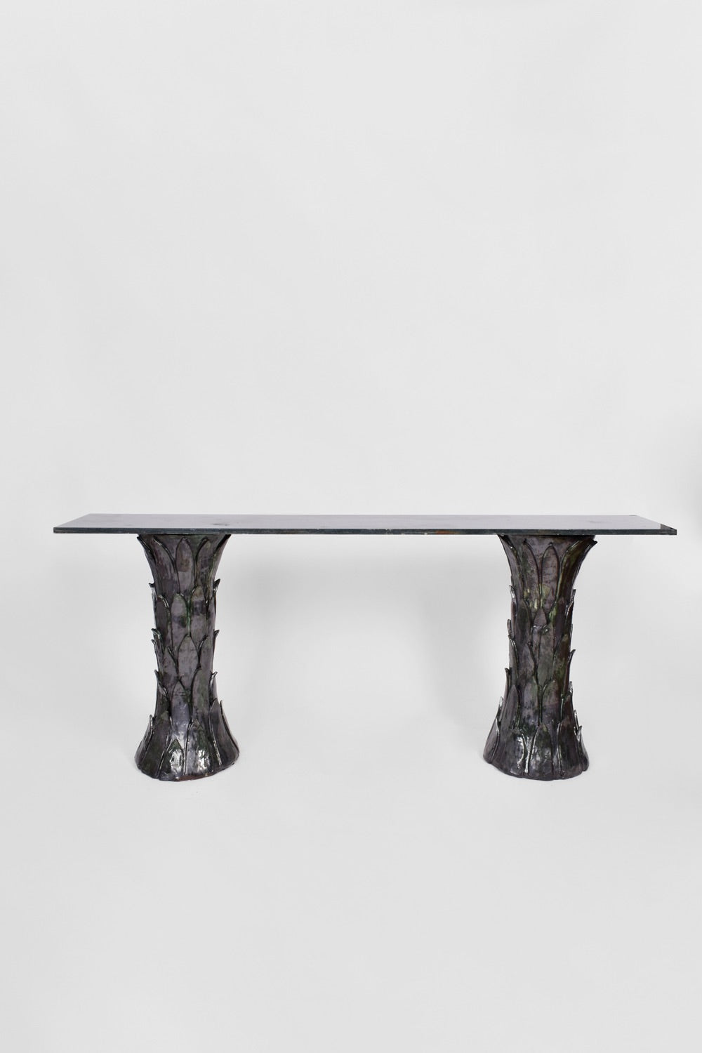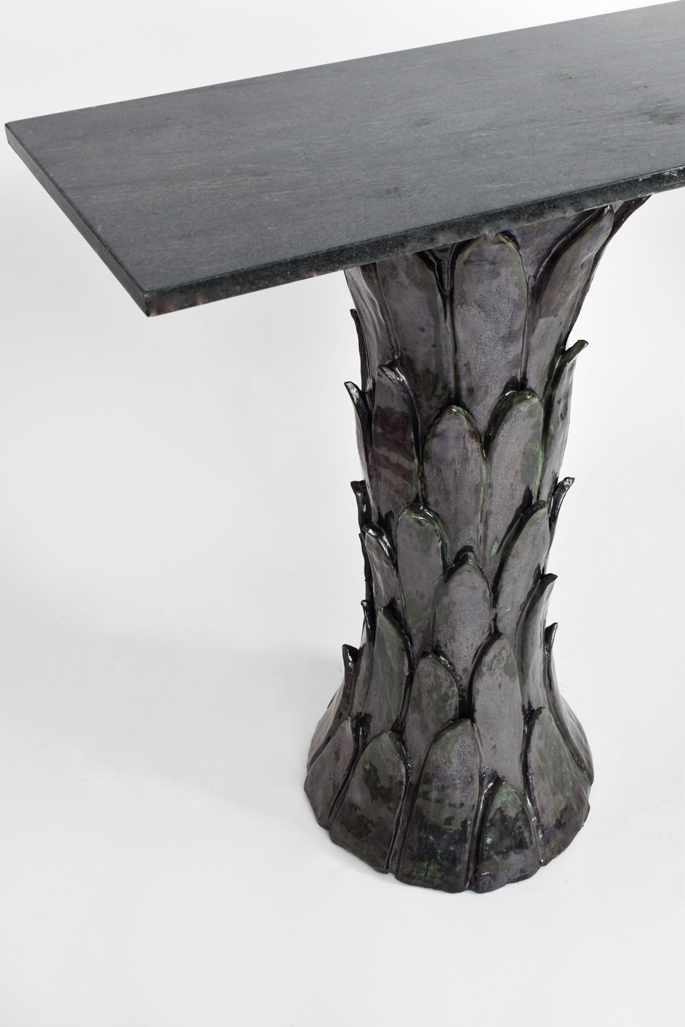 "Sintra" table console made of glazed terracotta feet sculpted representing leaves supporting a green marble table top. Barracuda edition, made in Portugal.