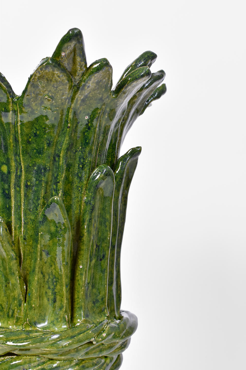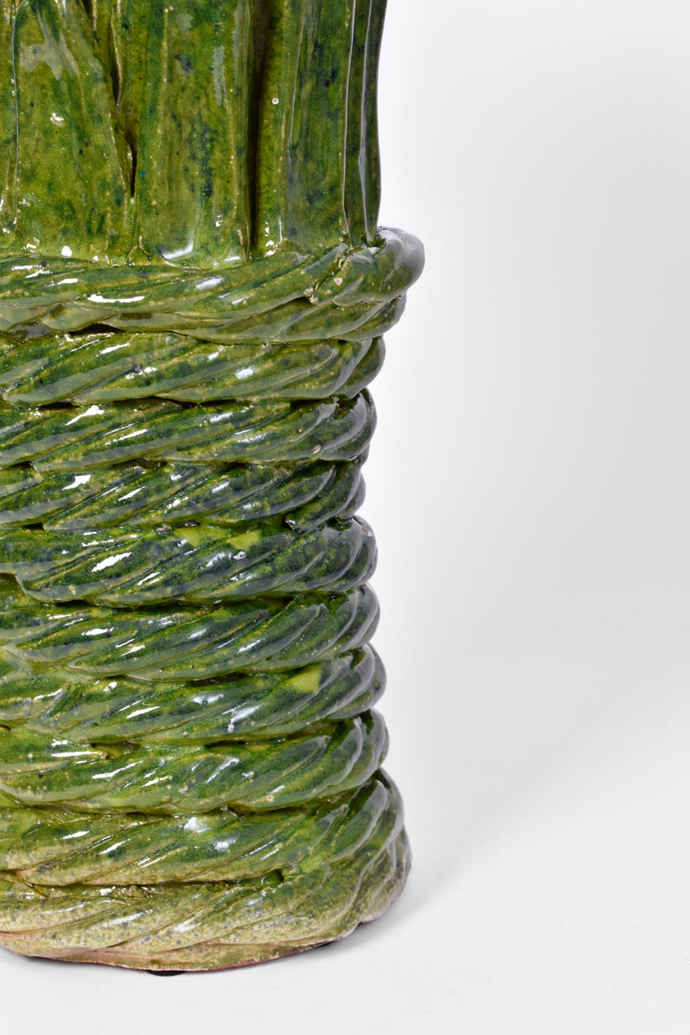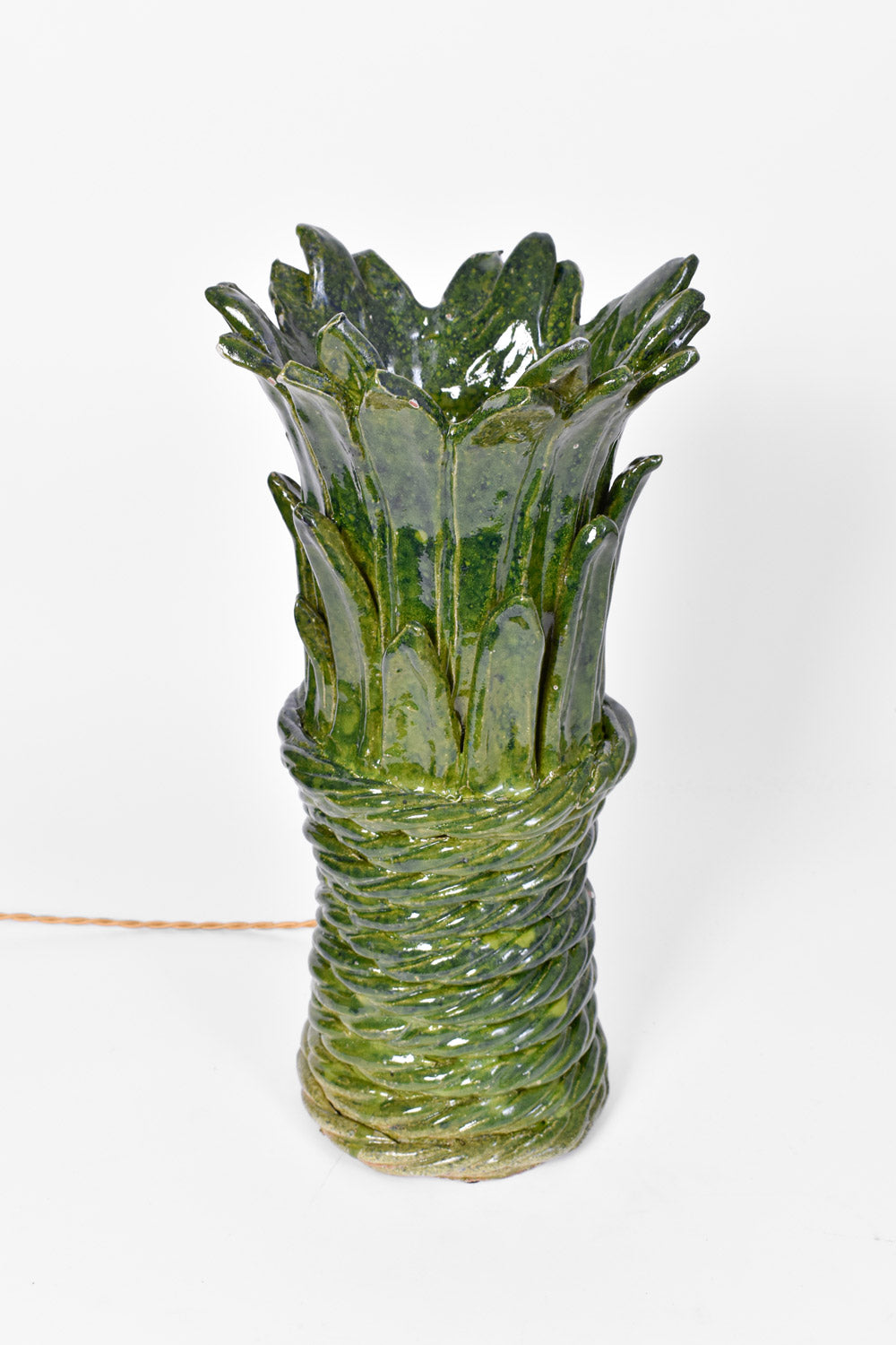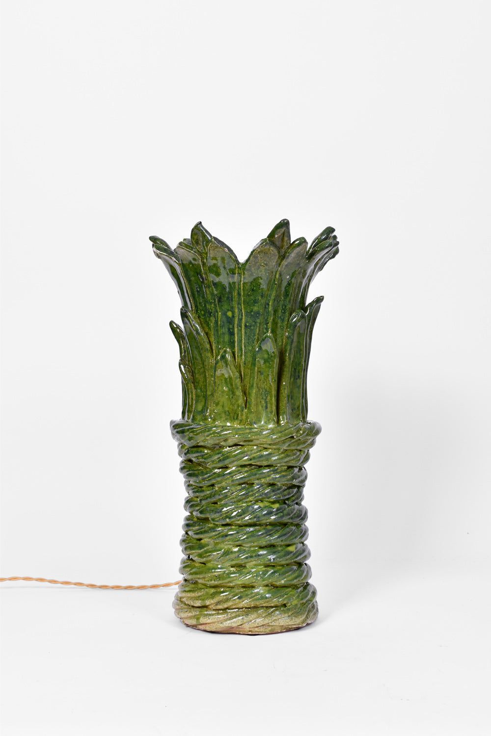 "Sintra" green glazed terracotta light basin lamp, with leaves on the top and a base made of a rope pattern imitating a basket, Barracuda Edition. Made in Portugal.