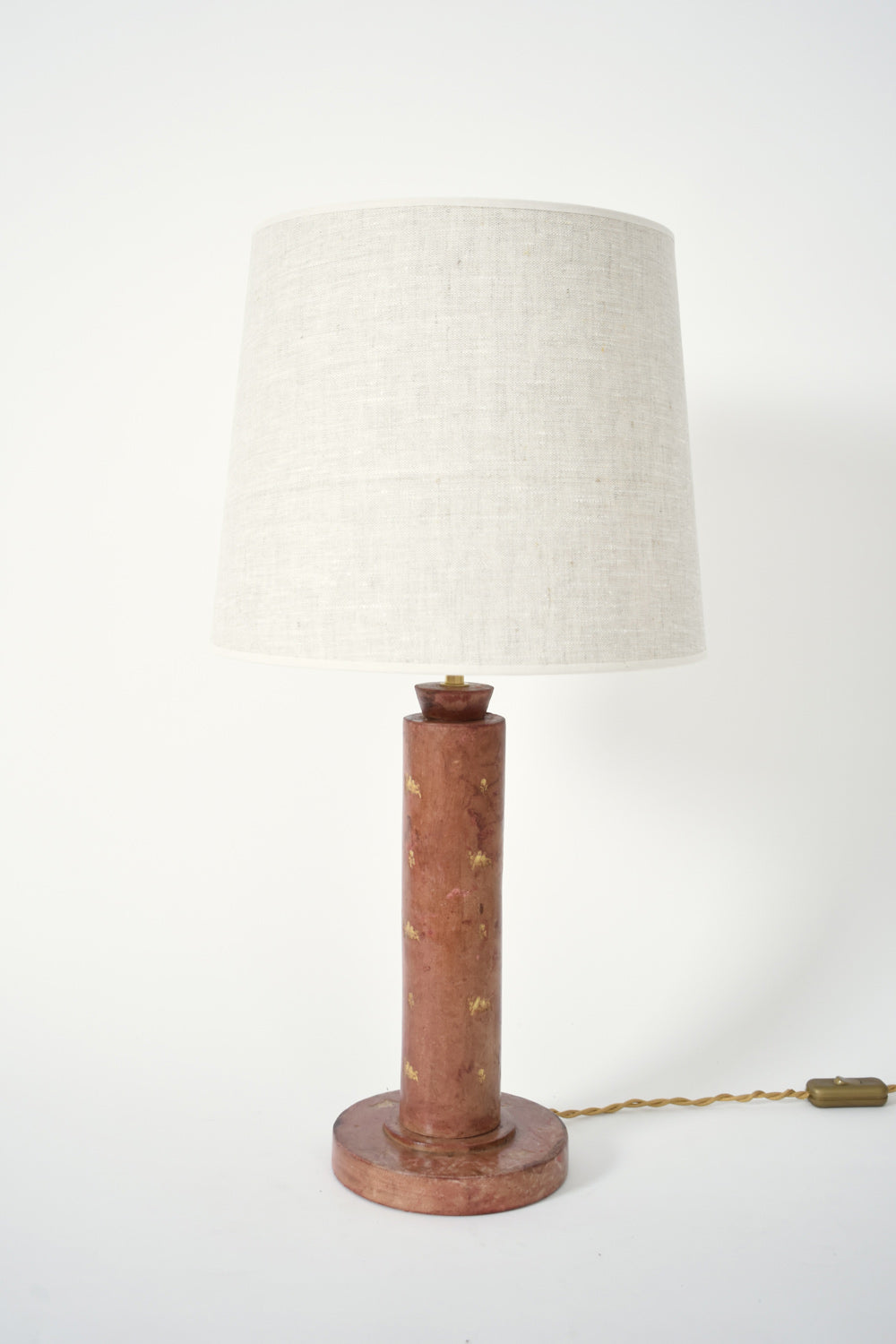 Cylindrical lamp base covered in leather with gold-stamped decoration of birds and flowers, in the style of Dupre Lafon and Hermes. France, 1940s.