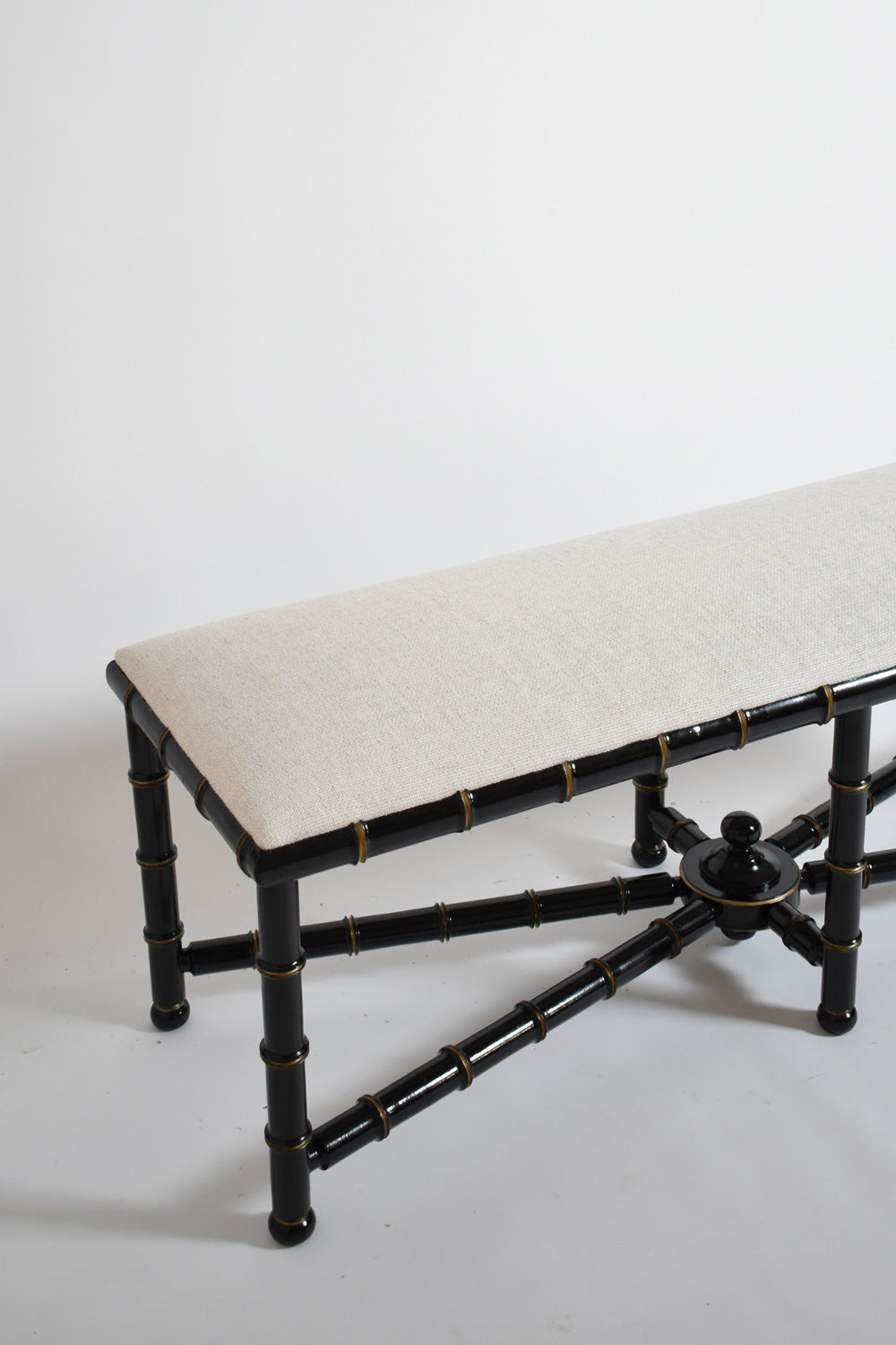 Anteroom bench, stool, or bed end in ebonised turned wood imitating the bamboo. France, 1970s.