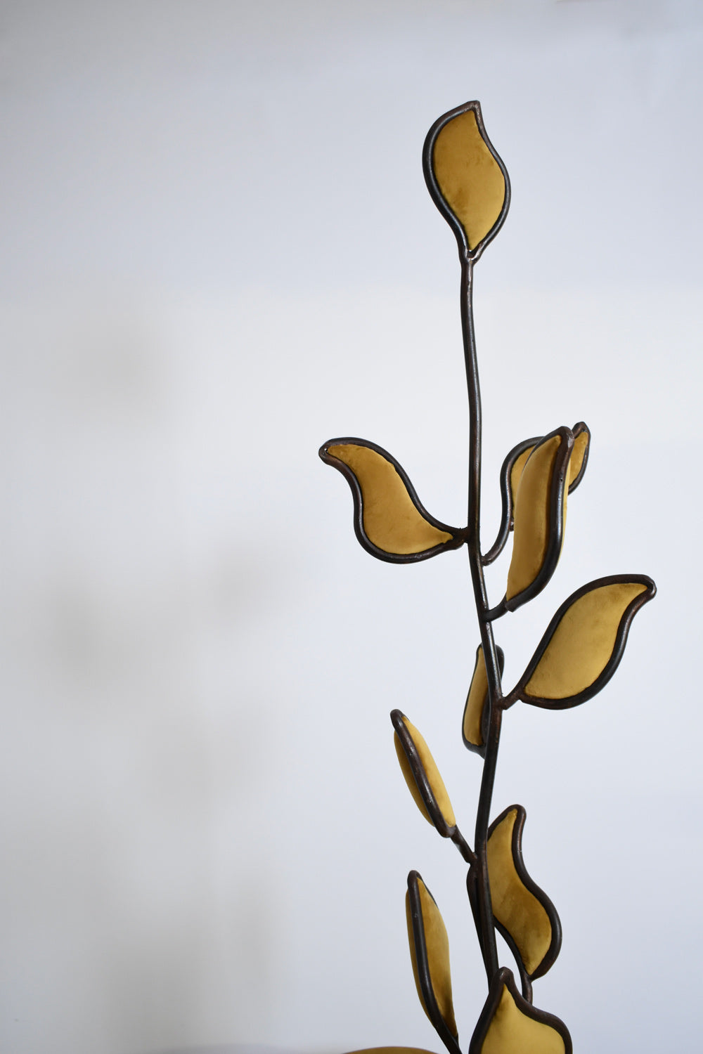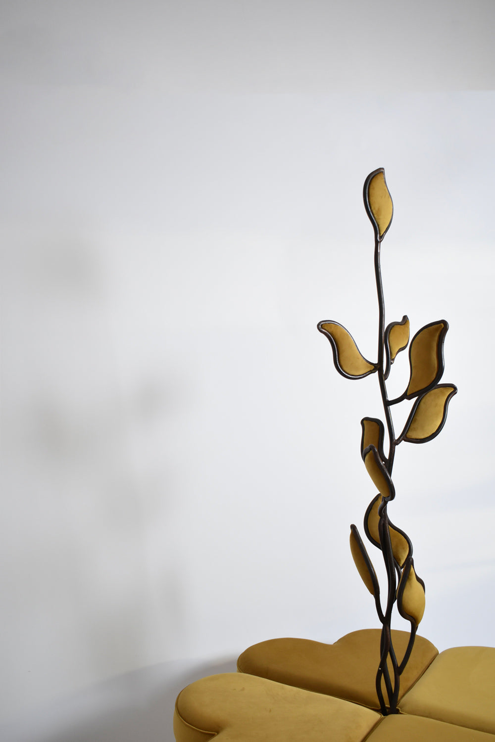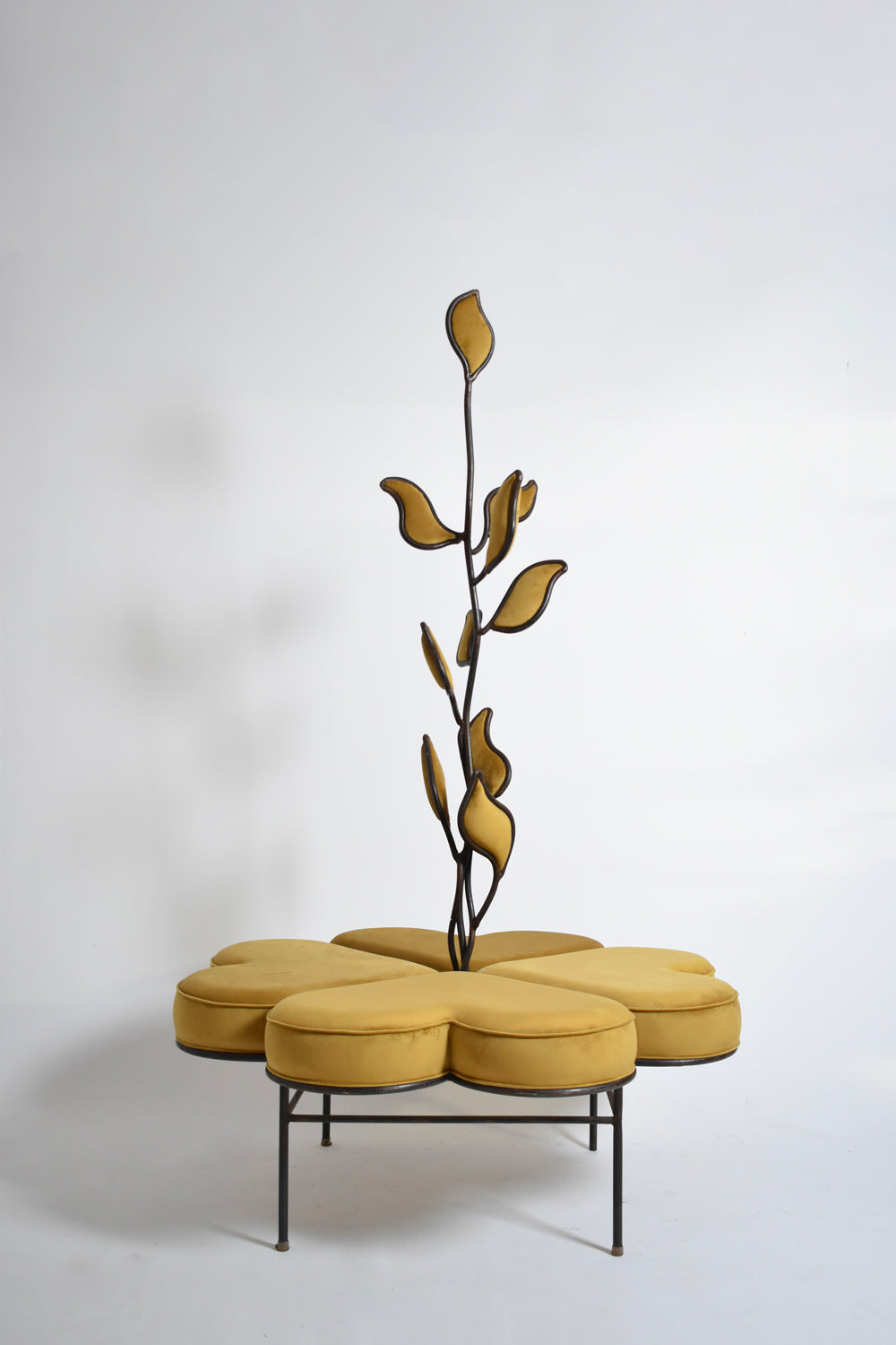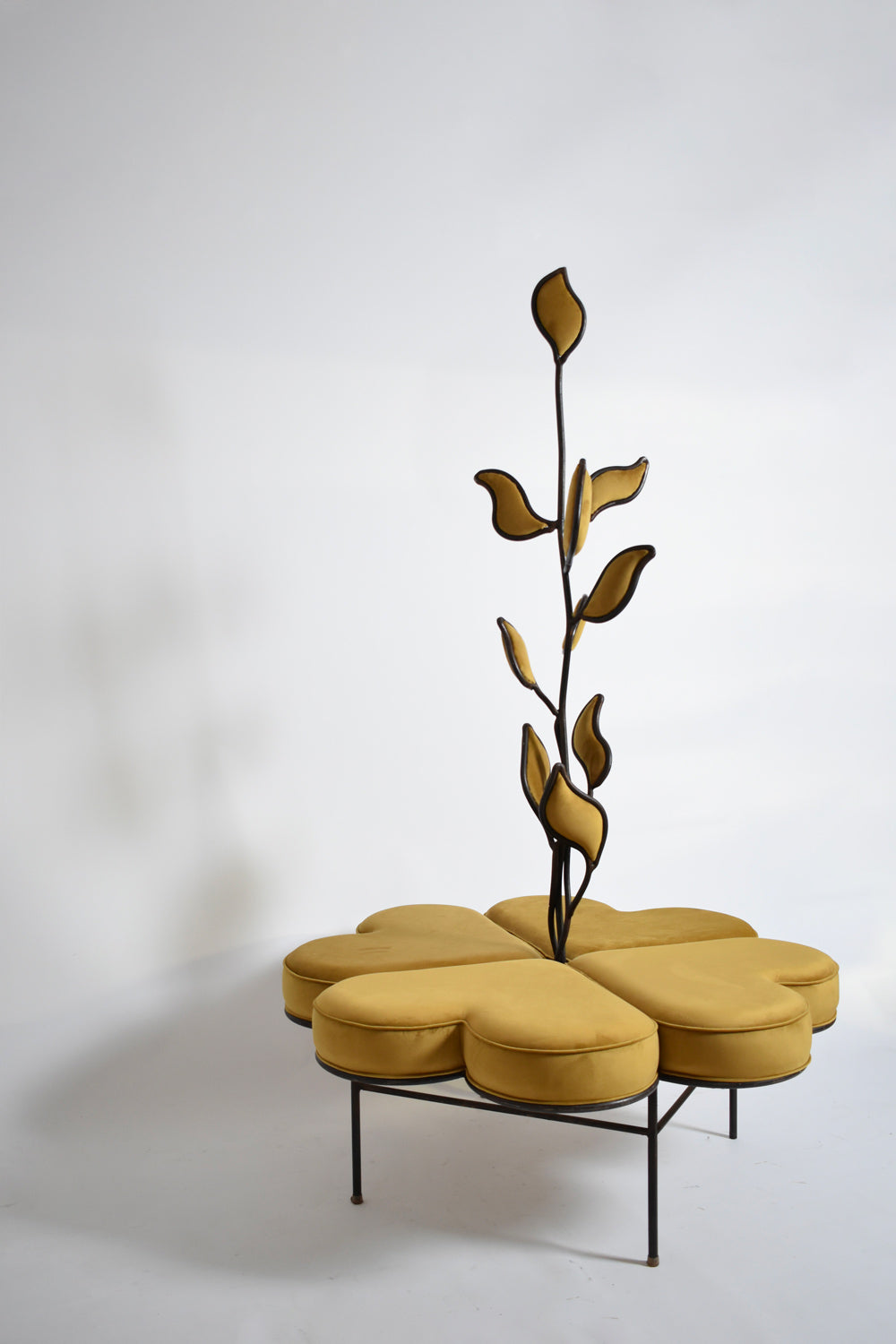 Wrought iron and velvet round borne armchair, resting on four feet joined by spacers supporting four seats, a wrought iron floral pattern in the middle ornamented with velvet leaves circled of iron. France, 1980s.
