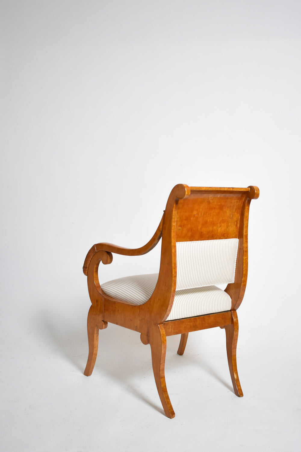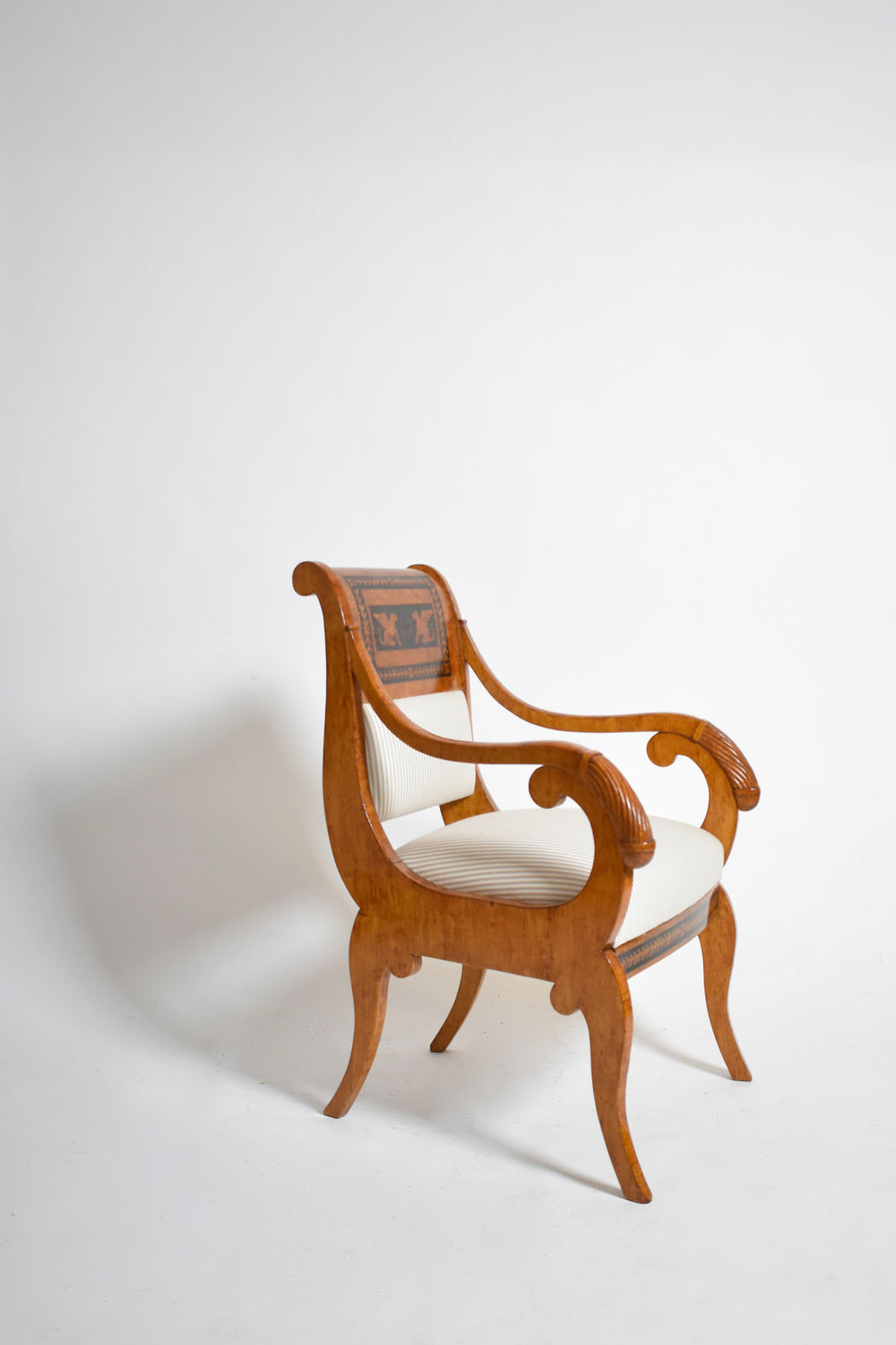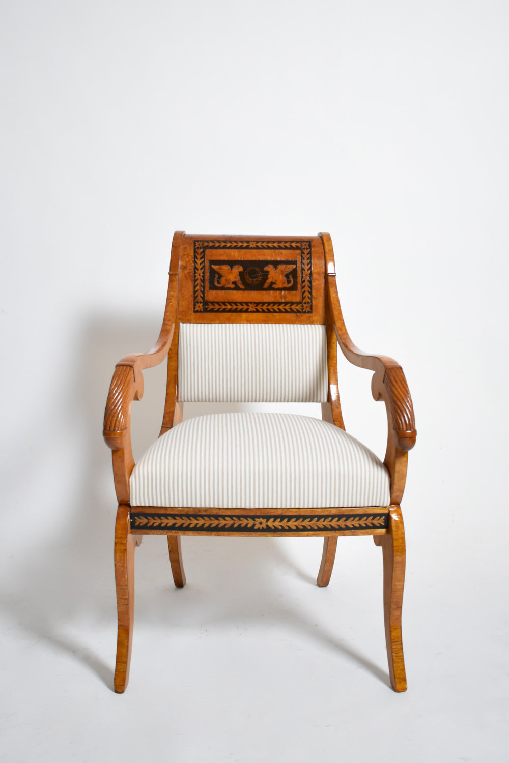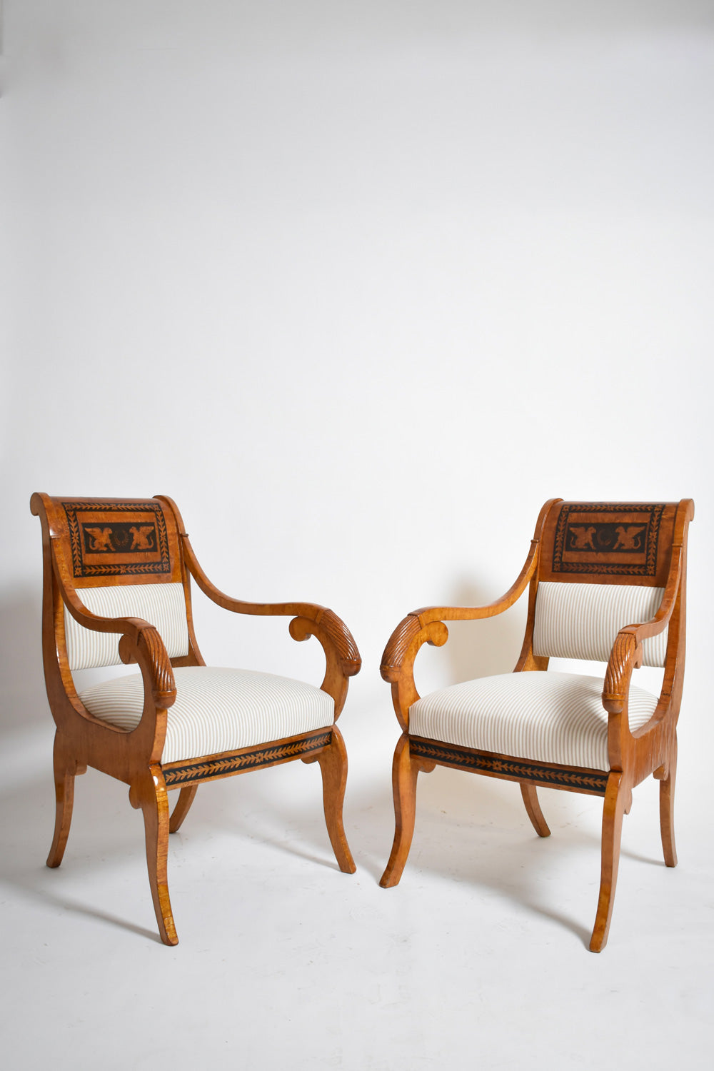 Pair of armchairs in natural wood and veneer with slightly rounded backs decorated with marquetry of facing griffins surrounding a laurel wreath in a frame of foliage and flowers. Armrests and armrest consoles with facing crooks. Belt inlaid with a foliage frieze centered with a flower. Four arched legs. Italy, 19th c.