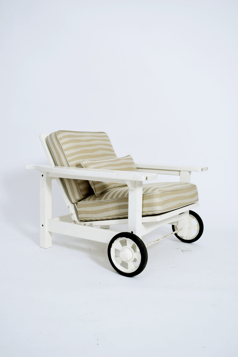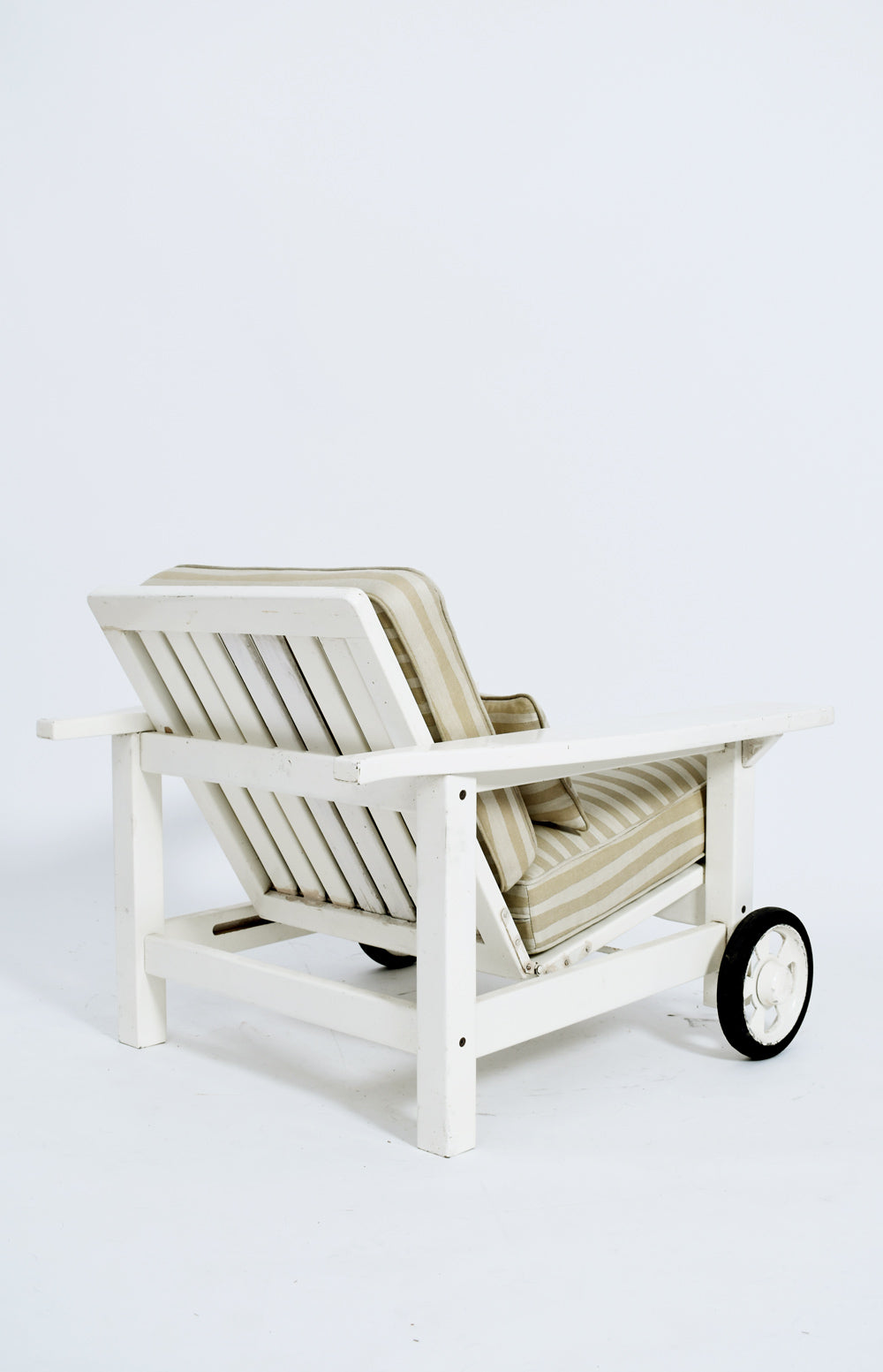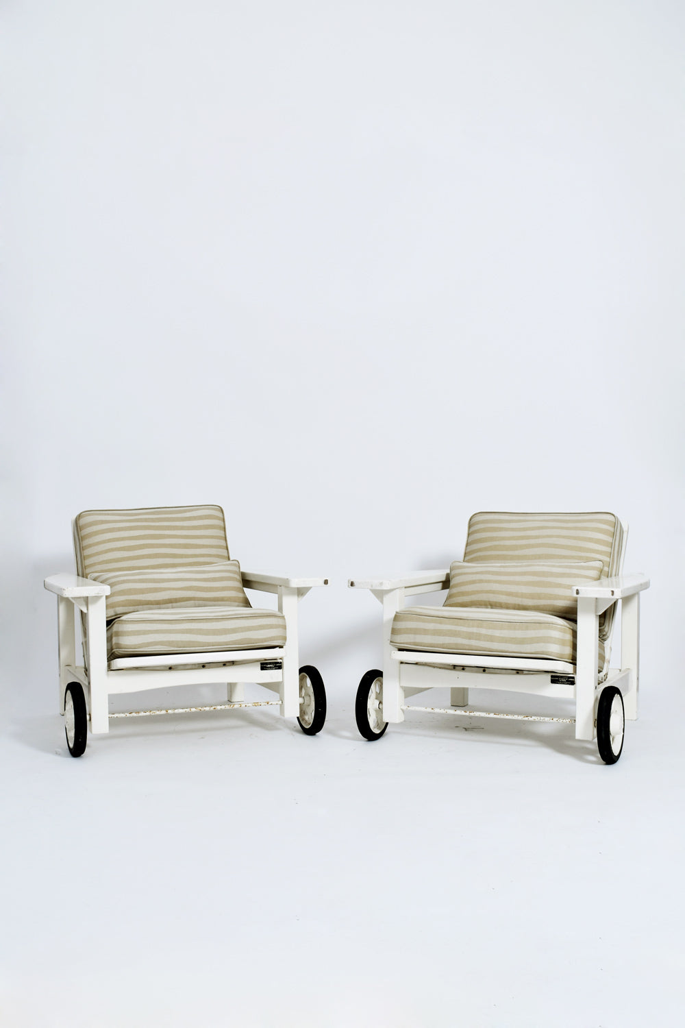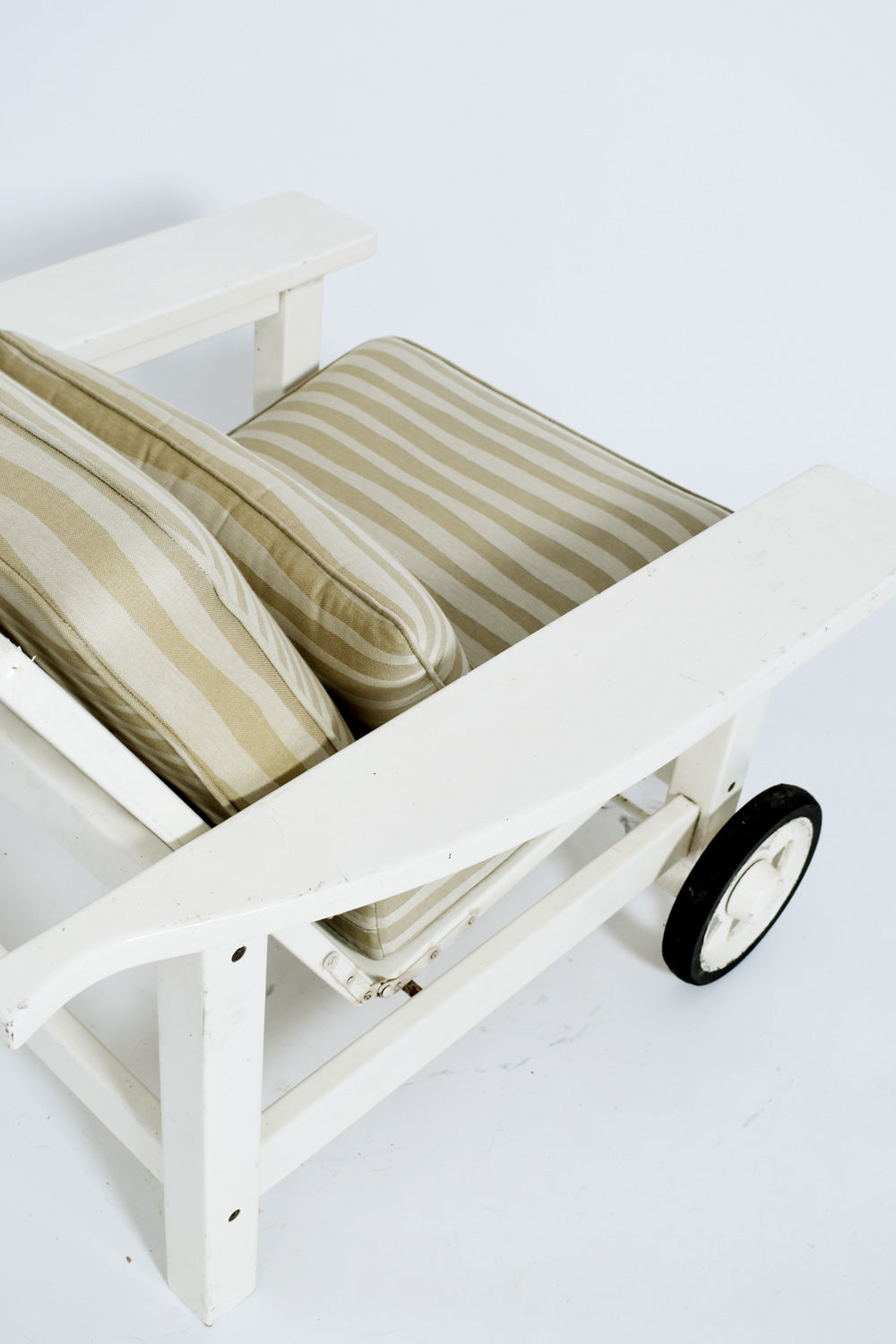 Pair of reclinable white lacquered wooden outdoor armchairs with wheels on the front by "Maisons et Jardins". Outdoor fabric with horizontal stripes. France, 1970s.