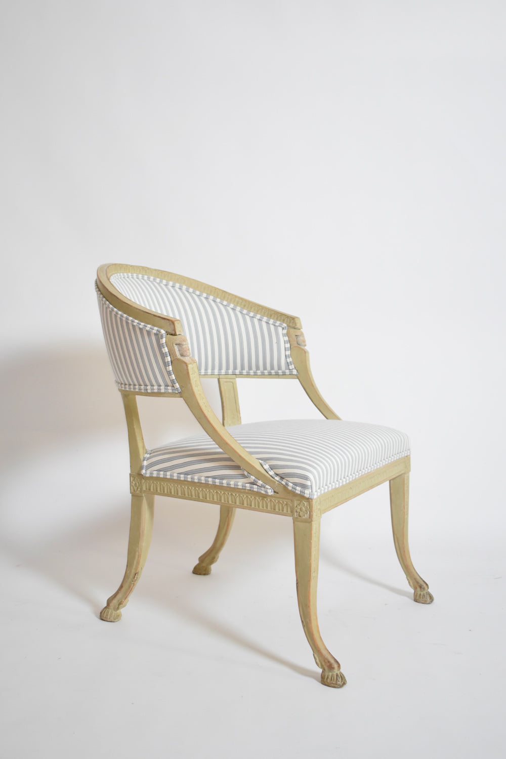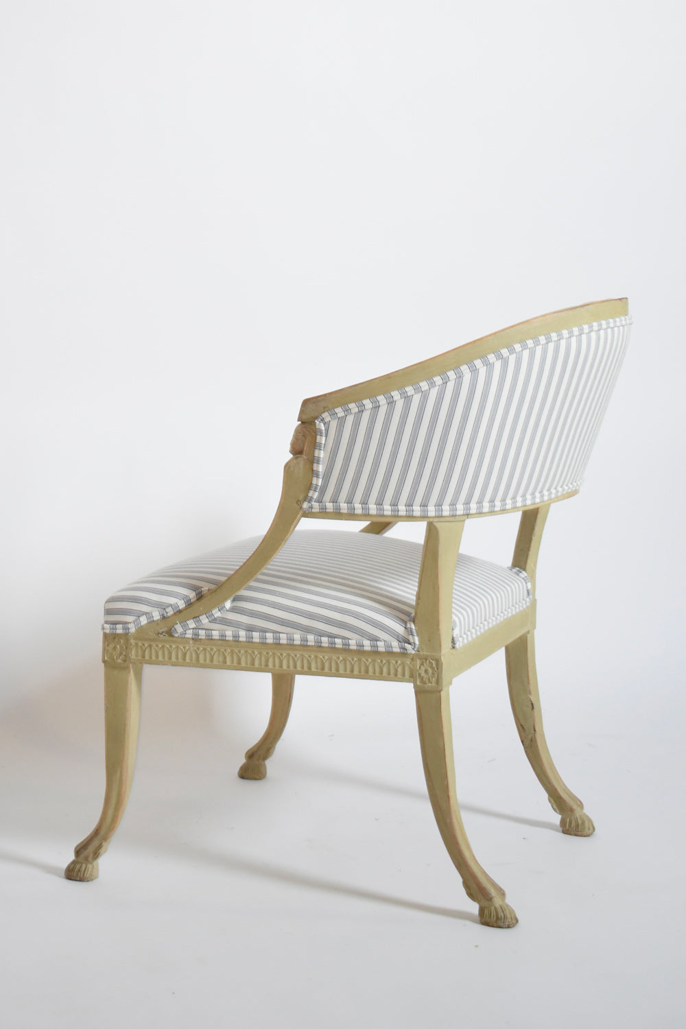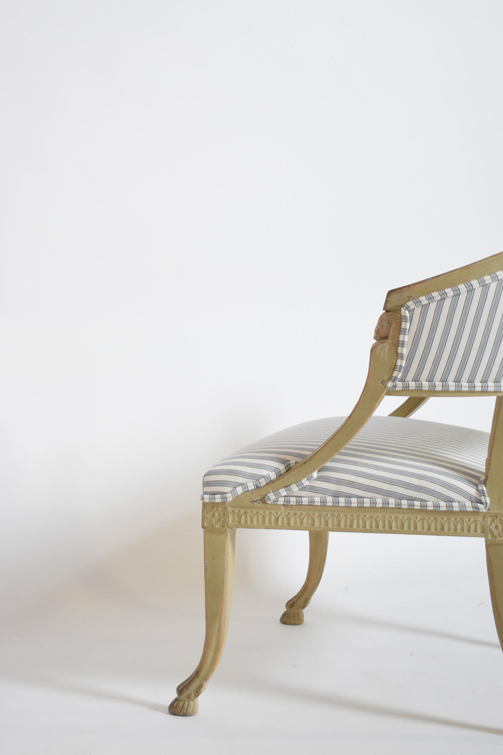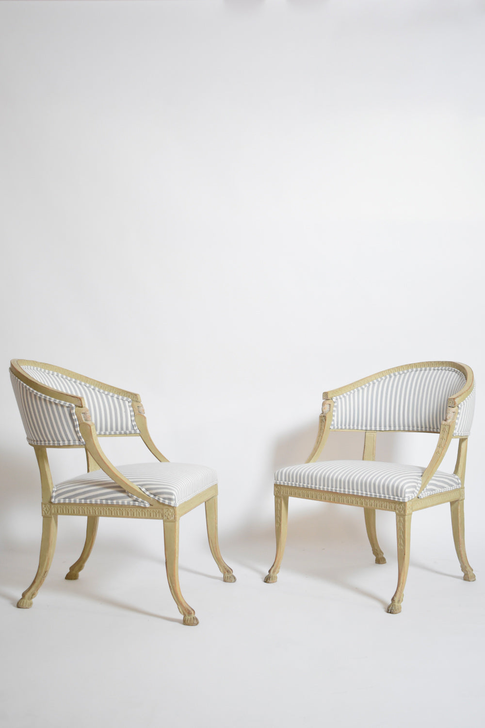 Pair of Gustavian armchairs of antique Etruscan inspiration, resting on curved legs ending in sabots, armrests decorated with faces. Sweden, 19th c.