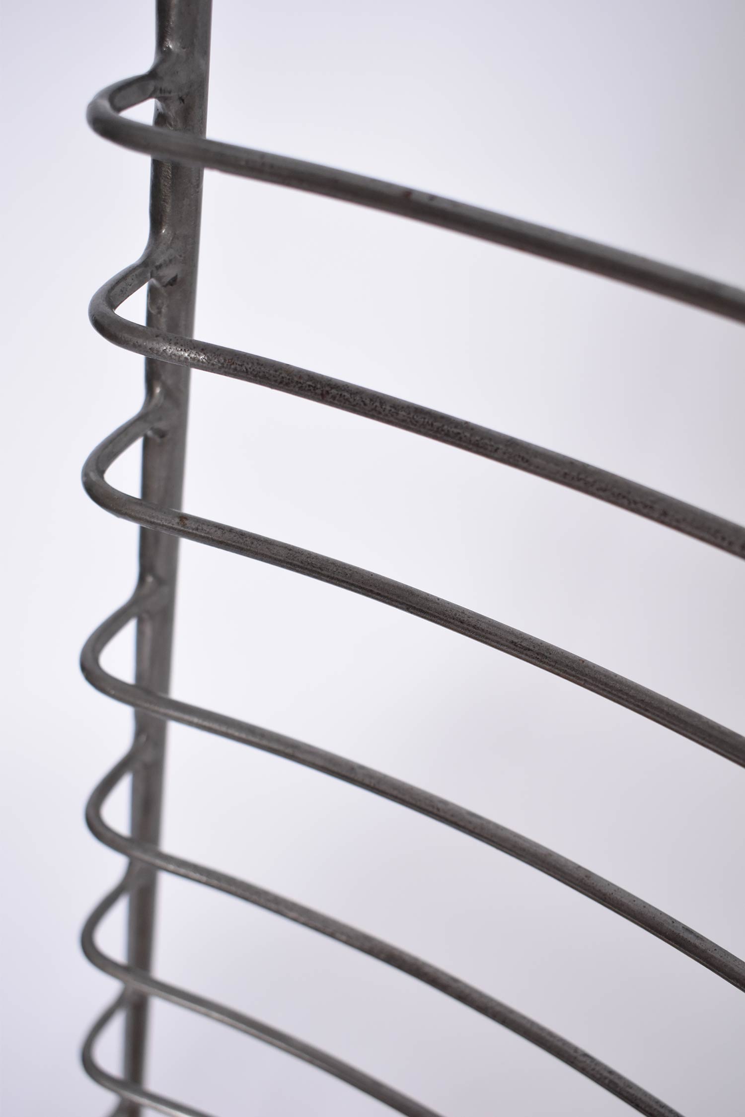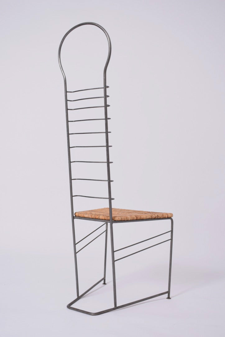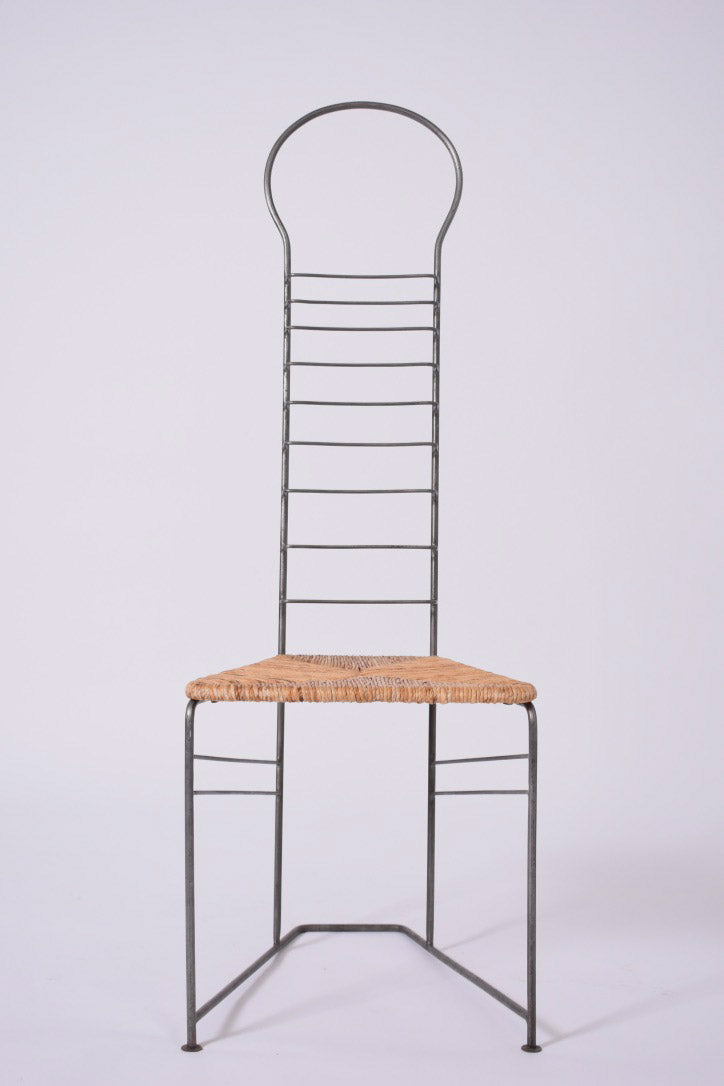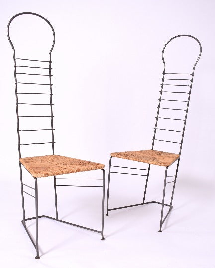 Pair of chairs with tubular iron structure and a high back, with a straw seat. France, 1980s.