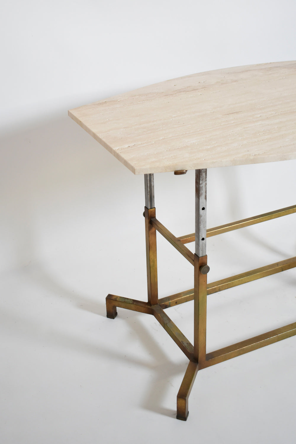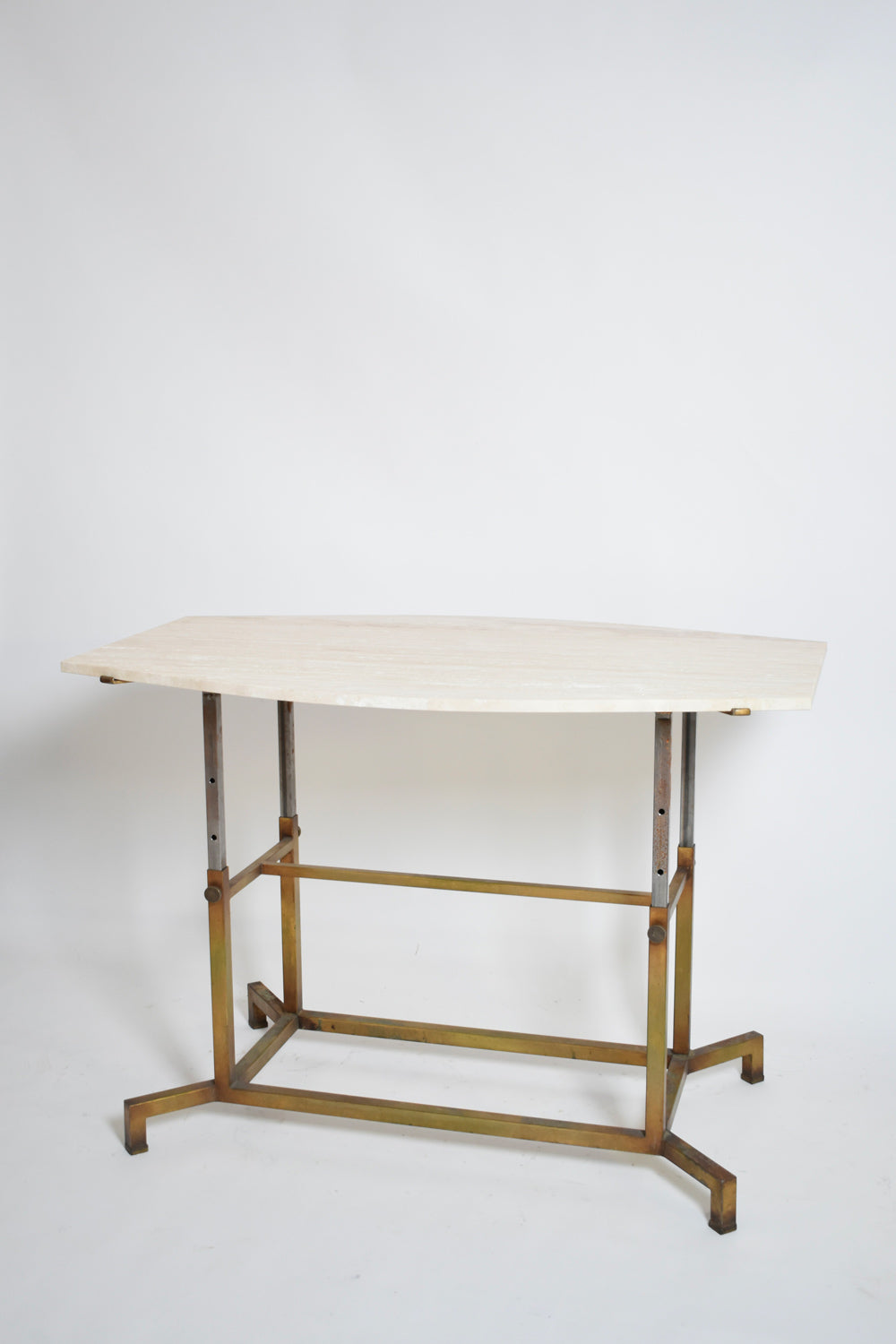 Bronze golden iron, iron and travertine adjustable middle table console or dining table. Italy, 1970s.