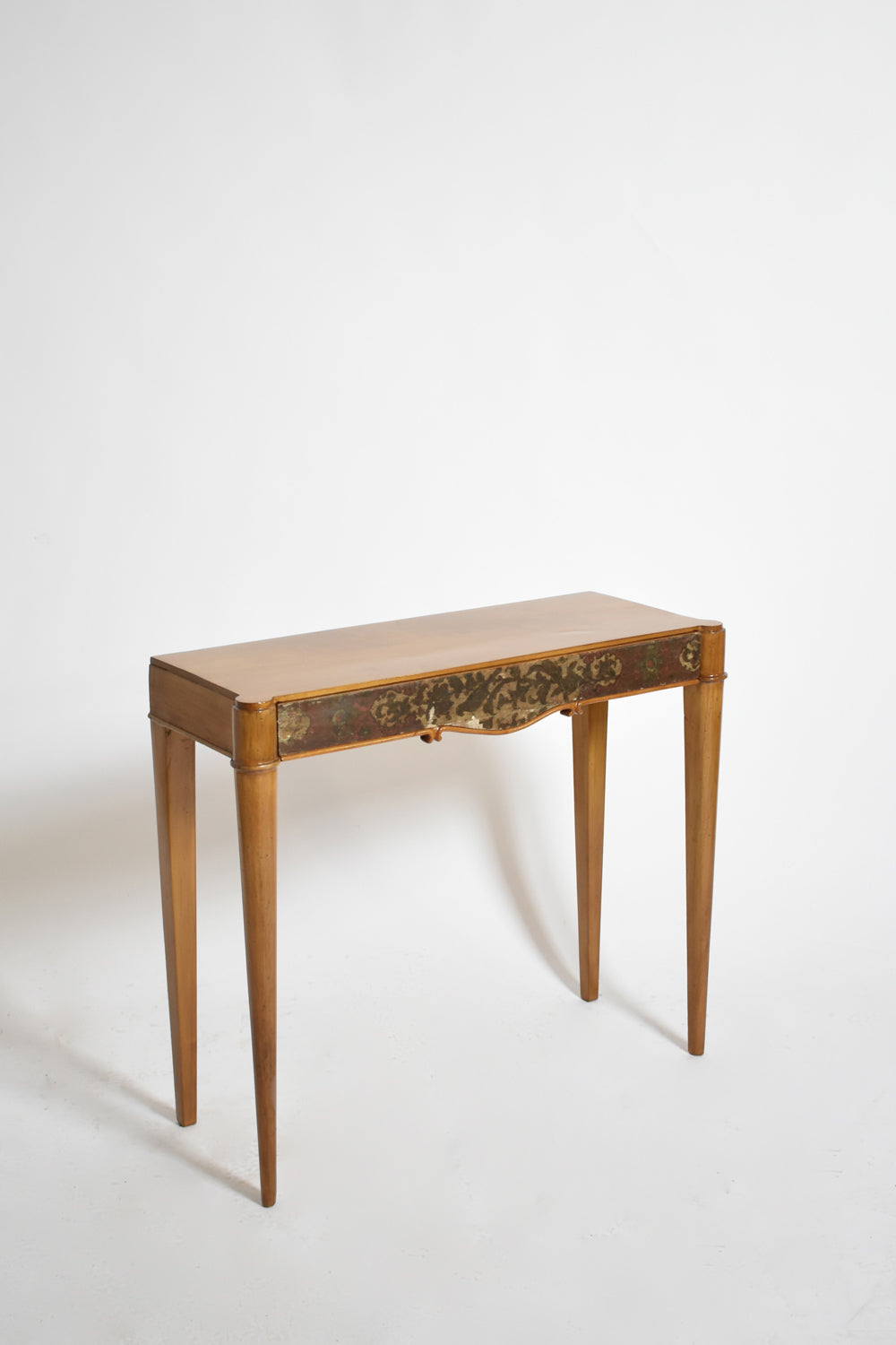 Natural wood console table, side table or bedside table opening with a painted drawer in the belt ornamented with vegetal motif surround pattern. France, 1940s.