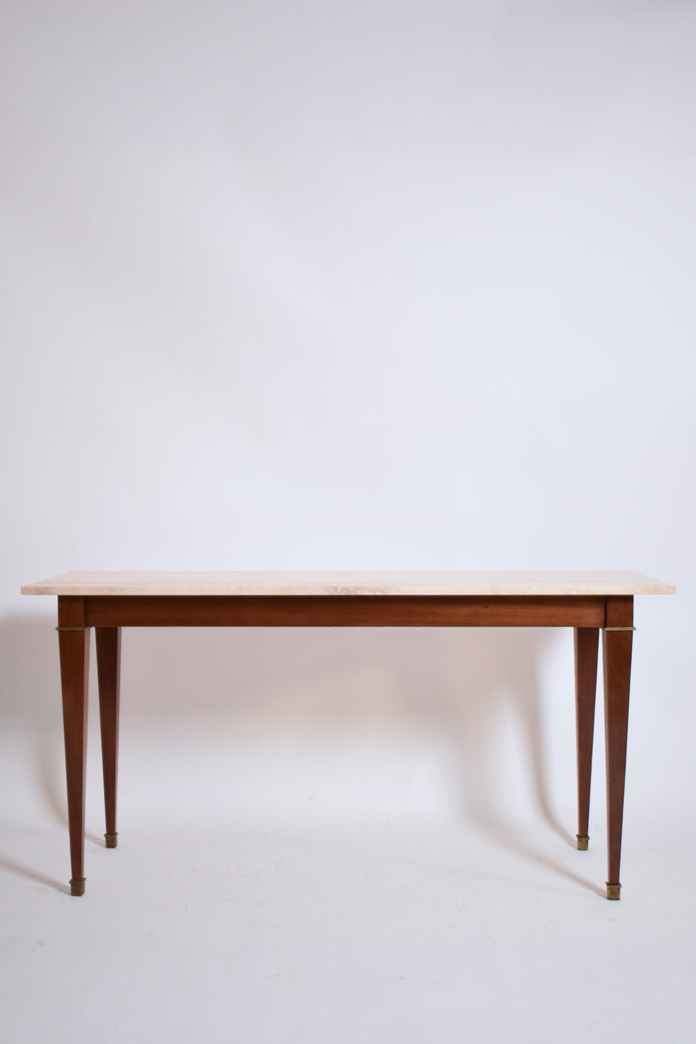 Large natural wood console table resting on four tapered legs topped with bronze clogs. Italy, 1960s.