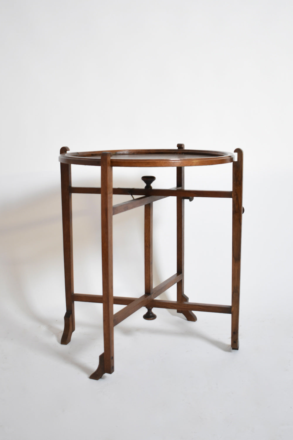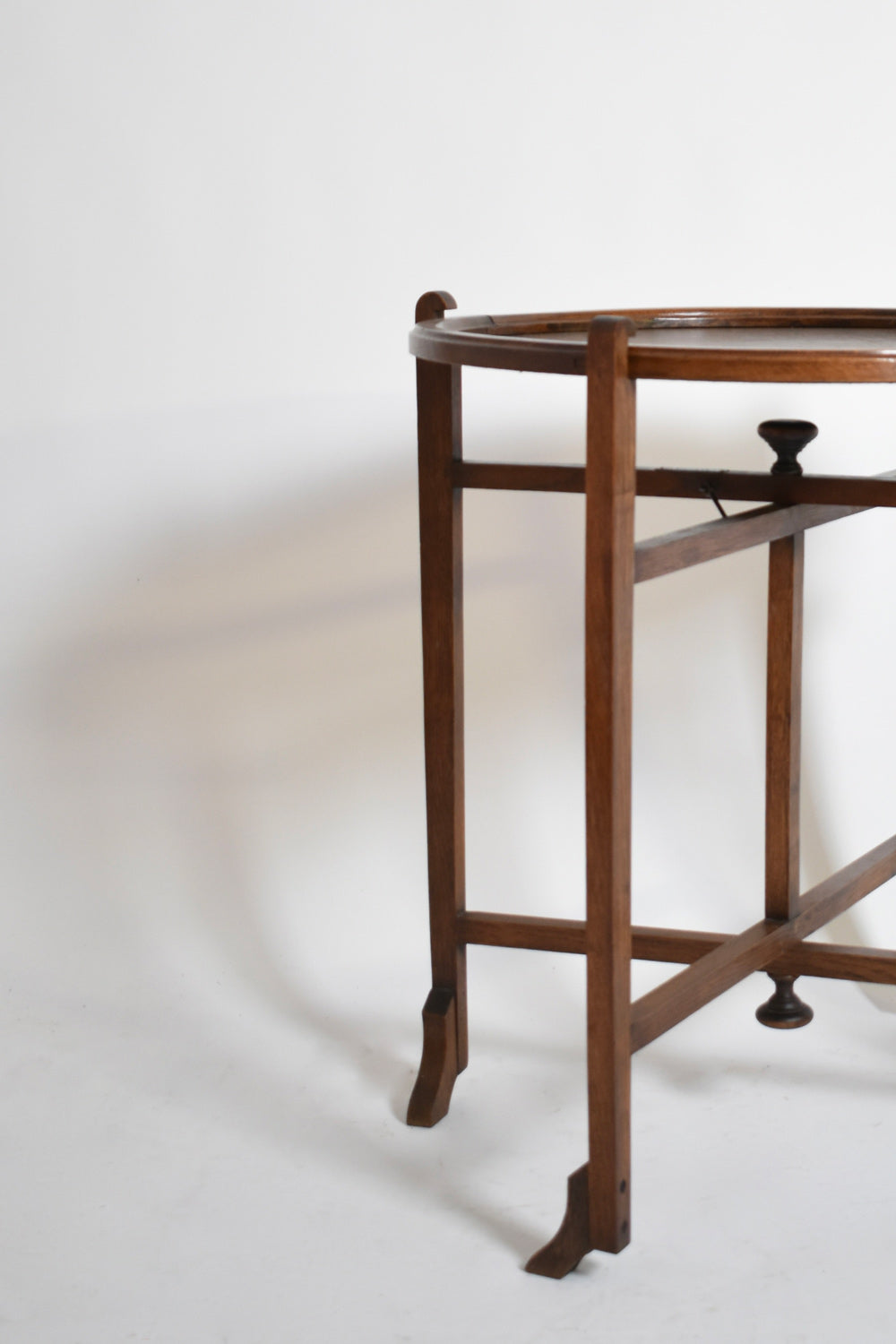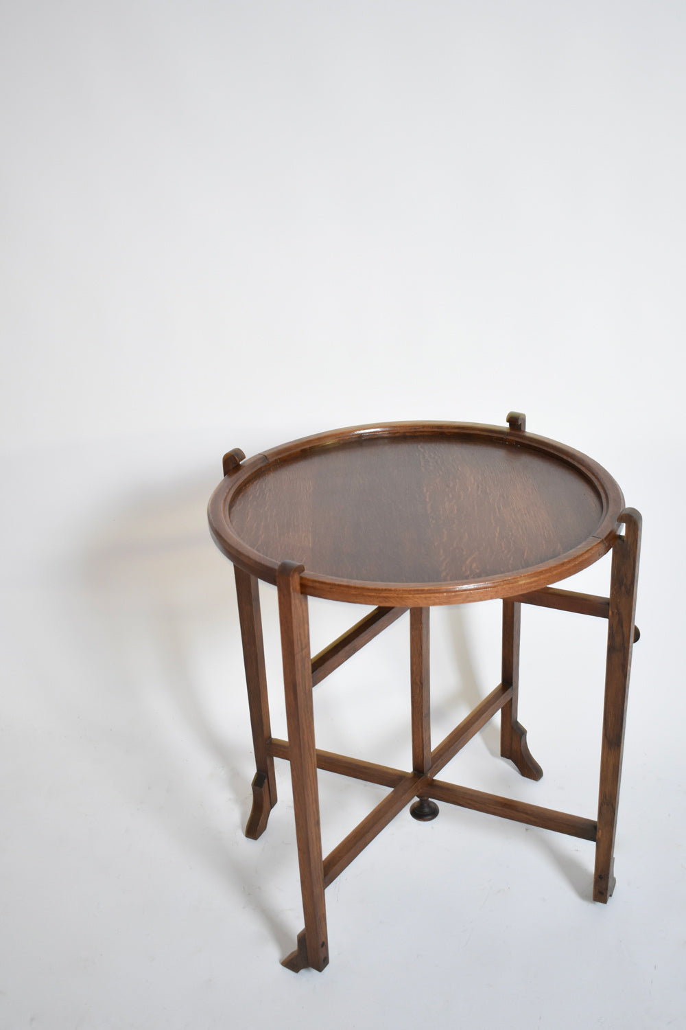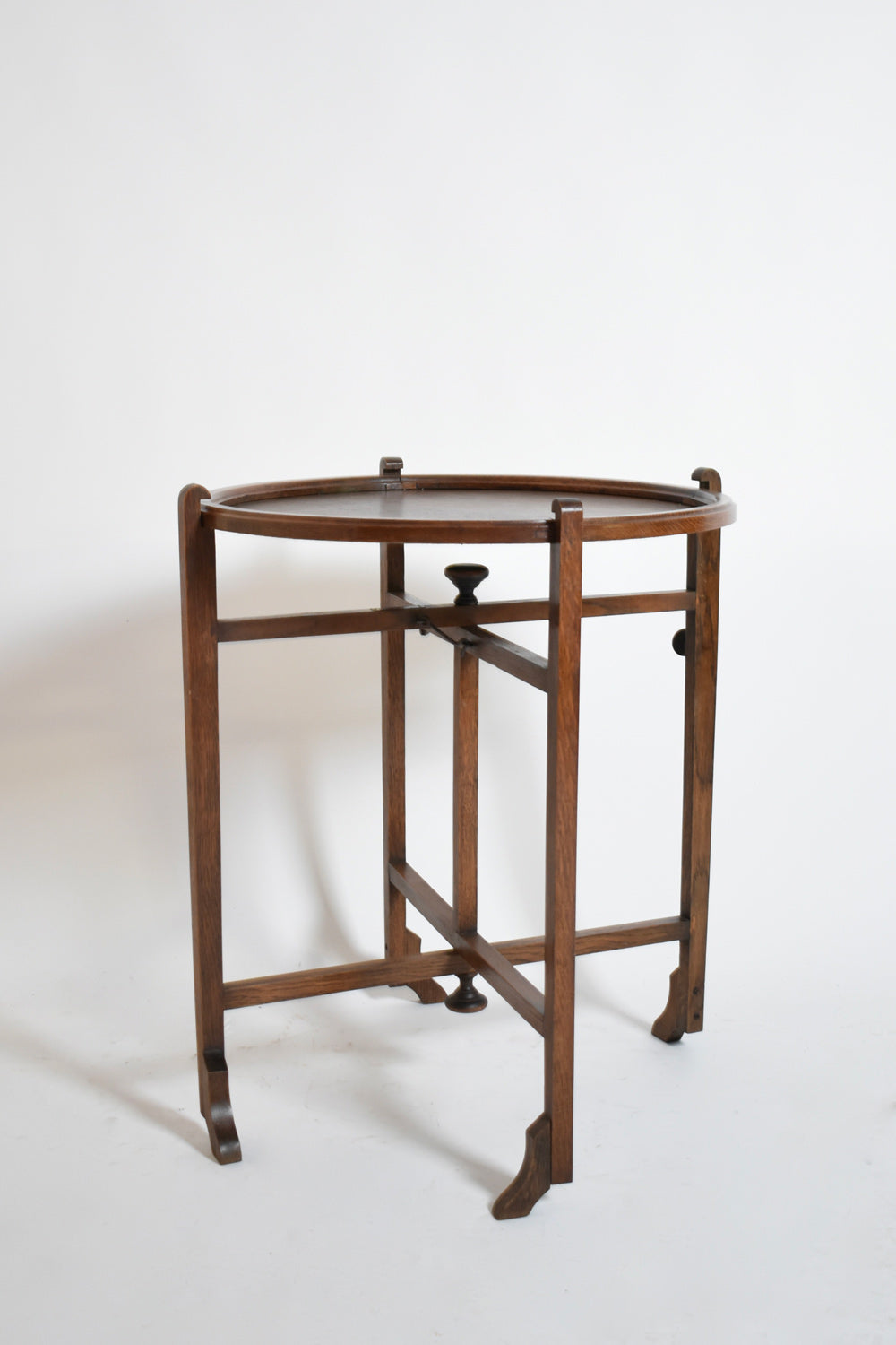 Arts & Crafts stained oak travel game tea side table with a cruciform folding base supporting a reversible circular top covered in green felt. Manufacturer's metal plaque (REVERTABLE - BRITISH MADE). England, 1910s.