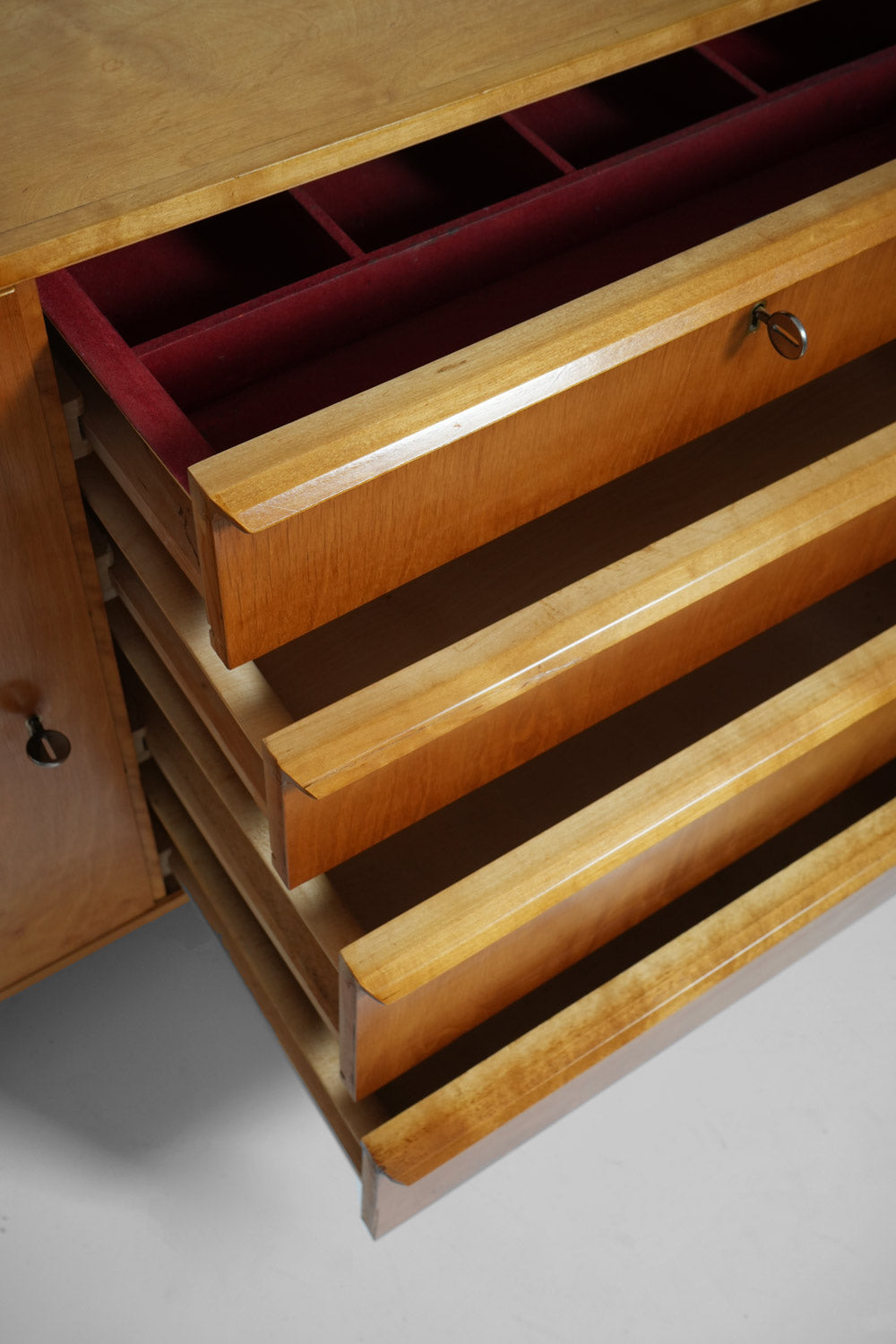 Sideboard in light wood, opening with 4 drawers and a door, stamp on the reverse, Pastoe Editor, Cees Braakman. Netherlands, 1960s.