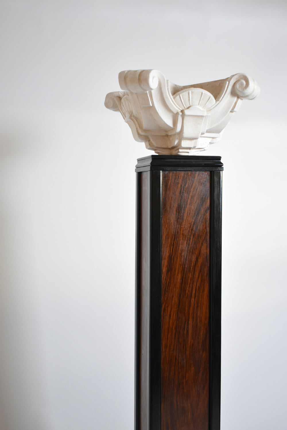 Art Deco wooden floor lamp with a square base supporting a luminous plaster basin. France, 1930s.