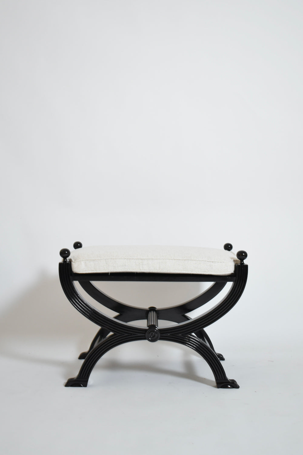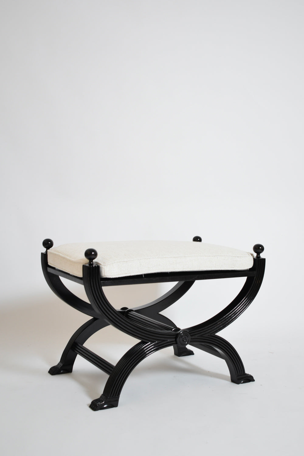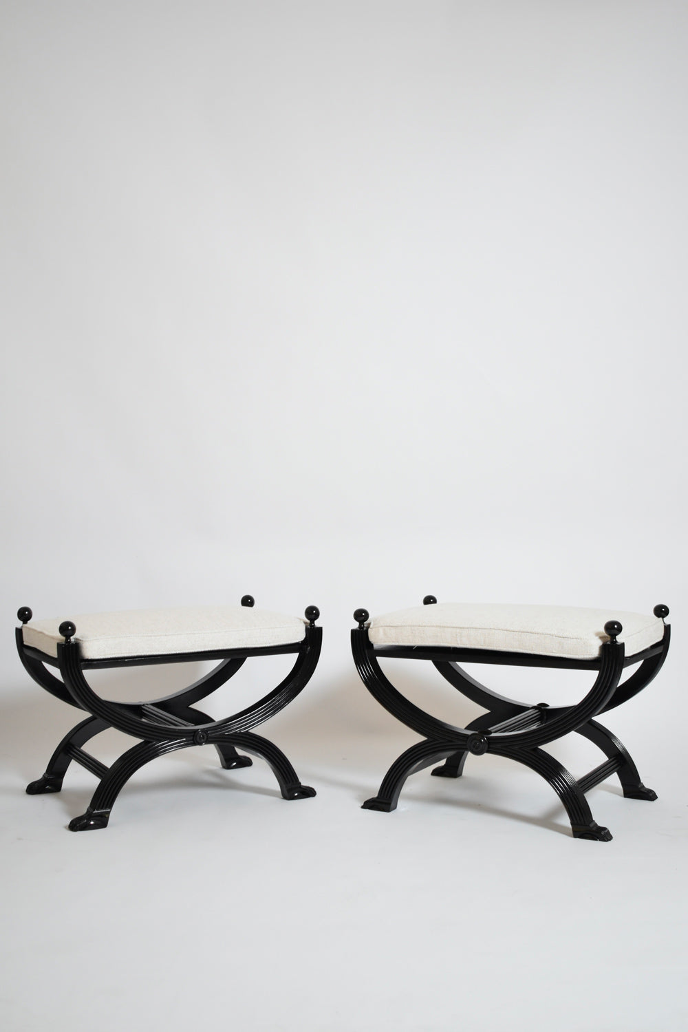 Pair of neocclassical black lacquered curule stools with balls at each corner and lion paws feet, 1960s.