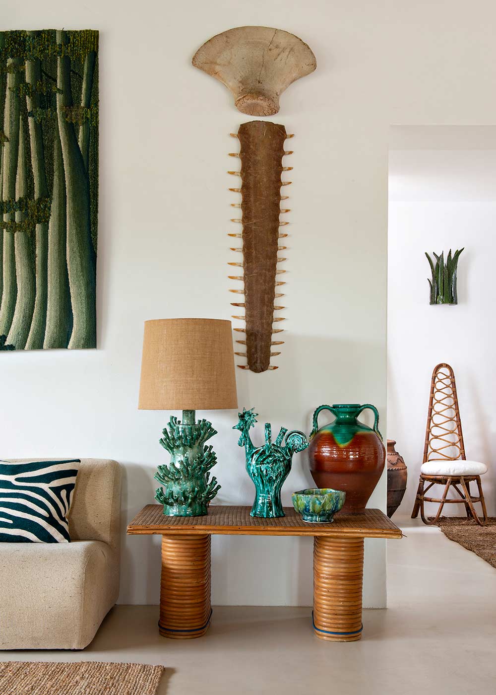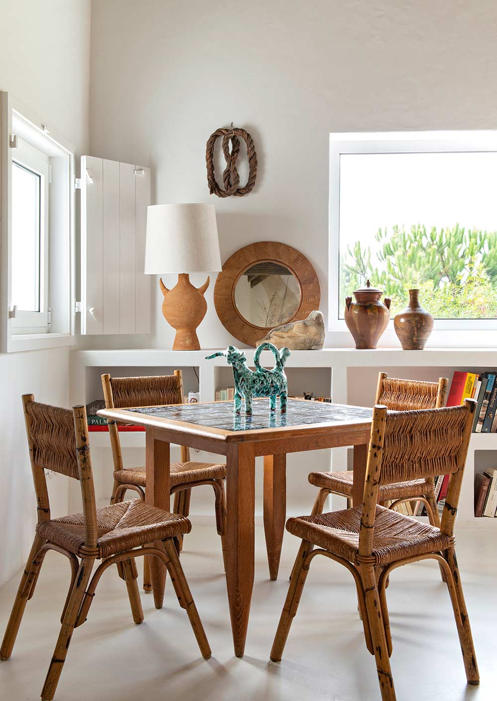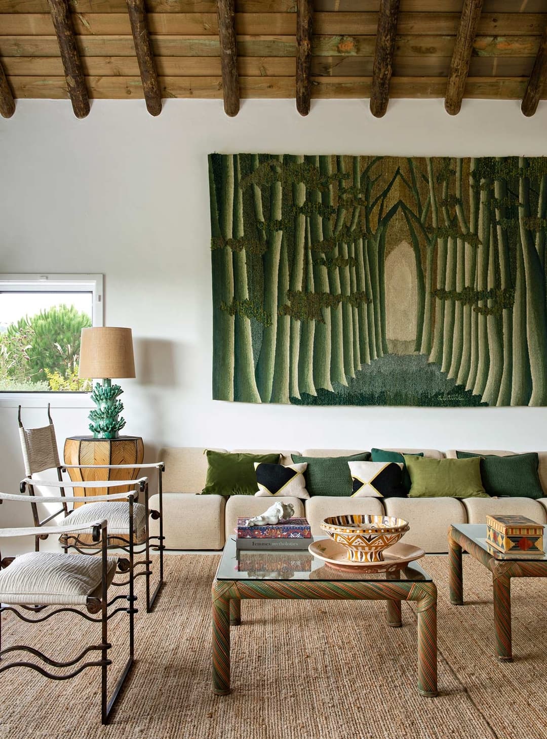 The starting point for the interior design were some extraordinary objects related to the sea and the navy which were inherited by the owner and are central to the décor. Then, the basic idea for the composition follows a theme that is dear to Neimann’s heart: to create a harmonious composition of later-20th-century furniture, Portuguese decorative objects – particularly ceramics – and pieces he designs himself that act as a bridge between the architecture and the 20th-century pieces. The result is an eclectic mix that visually enhances the whole project and confers an air of originality. The greens in the tapestry – one of the key pieces in the living room - are mirrored by the cushions and join the palette of natural colours, in tones of beige and ivory, and the turquoise details of the ceramics. As far as materials are concerned, emphasis was placed on lightly coloured wood, wrought iron, rattan and ceramics.