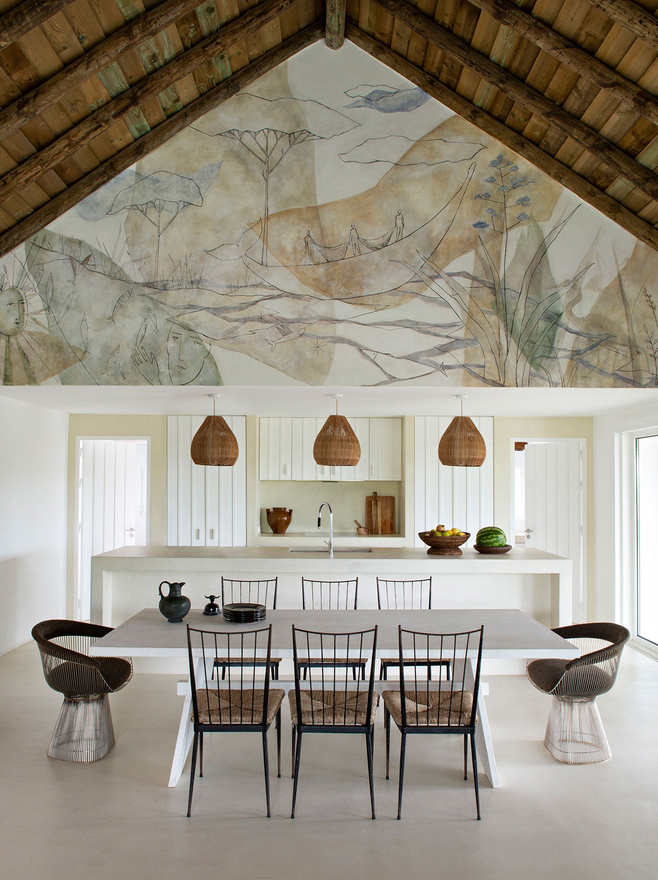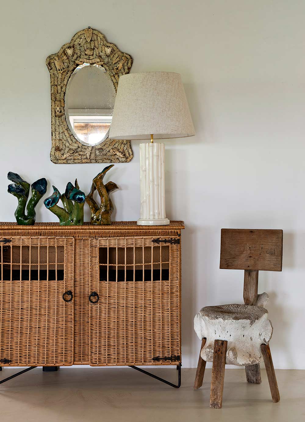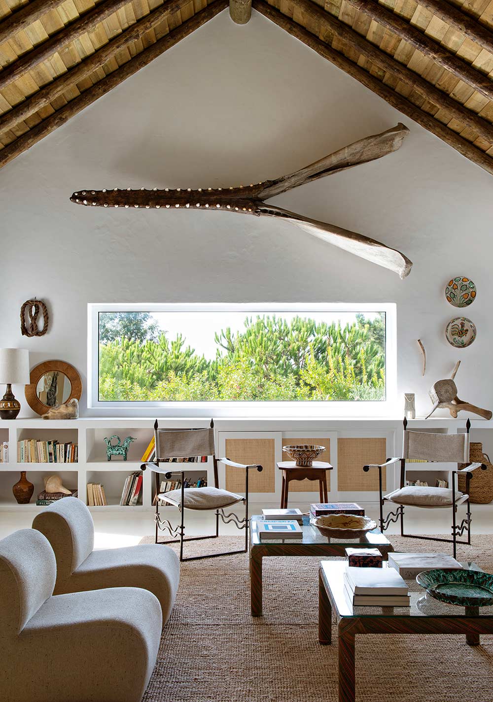 The starting point for the interior design were some extraordinary objects related to the sea and the navy which were inherited by the owner and are central to the décor. Then, the basic idea for the composition follows a theme that is dear to Neimann’s heart: to create a harmonious composition of later-20th-century furniture, Portuguese decorative objects – particularly ceramics – and pieces he designs himself that act as a bridge between the architecture and the 20th-century pieces. The result is an eclectic mix that visually enhances the whole project and confers an air of originality. The greens in the tapestry – one of the key pieces in the living room - are mirrored by the cushions and join the palette of natural colours, in tones of beige and ivory, and the turquoise details of the ceramics. As far as materials are concerned, emphasis was placed on lightly coloured wood, wrought iron, rattan and ceramics.